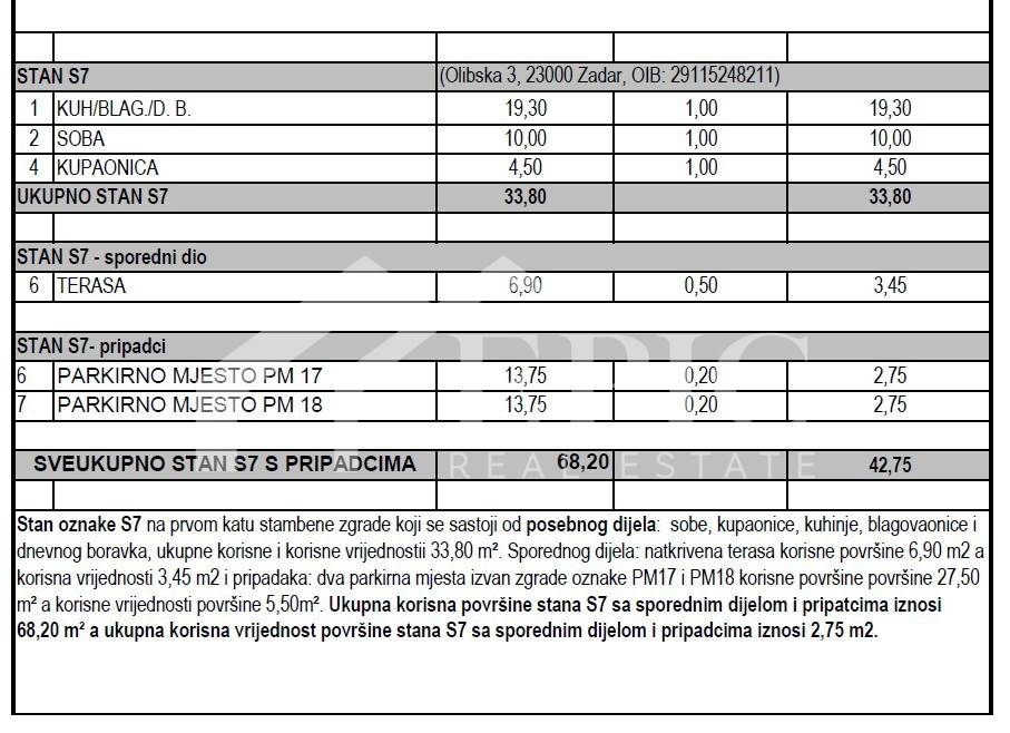 Apartment S7, located on the first floor of a building with eight residential units, consists of a kitchen with dining area and living room, bedroom, bathroom, and a covered terrace. The apartment also includes two parking spaces. The total usable area of the apartment including auxiliary parts and appurtenances is 68.20 m², while the total usable living area of the apartment is 42.75 m².