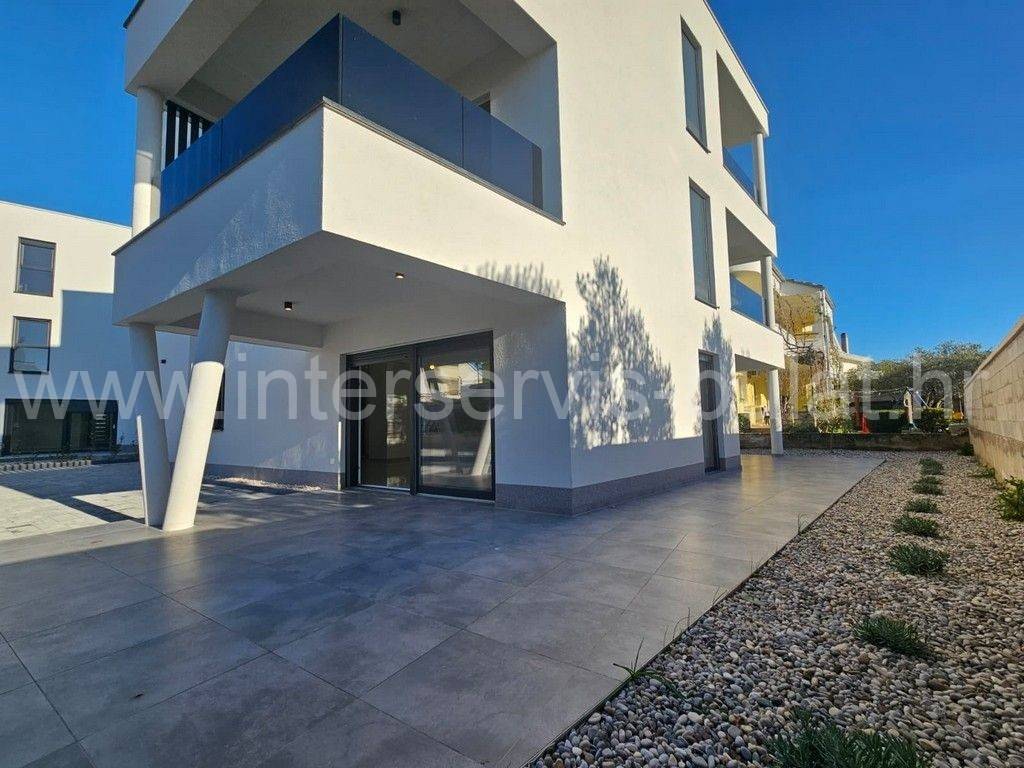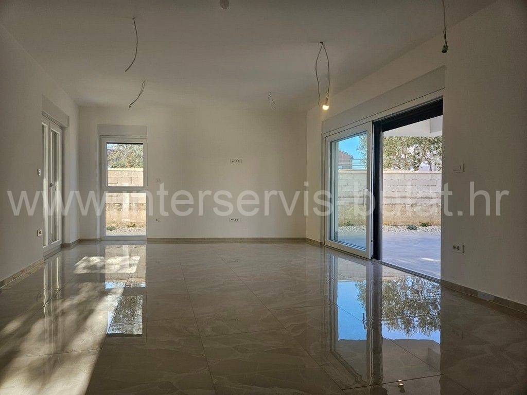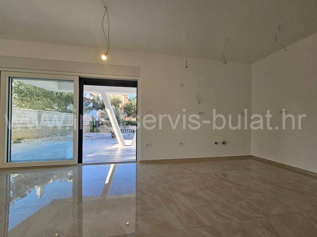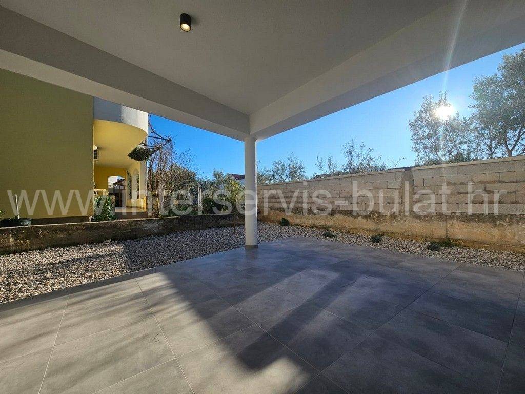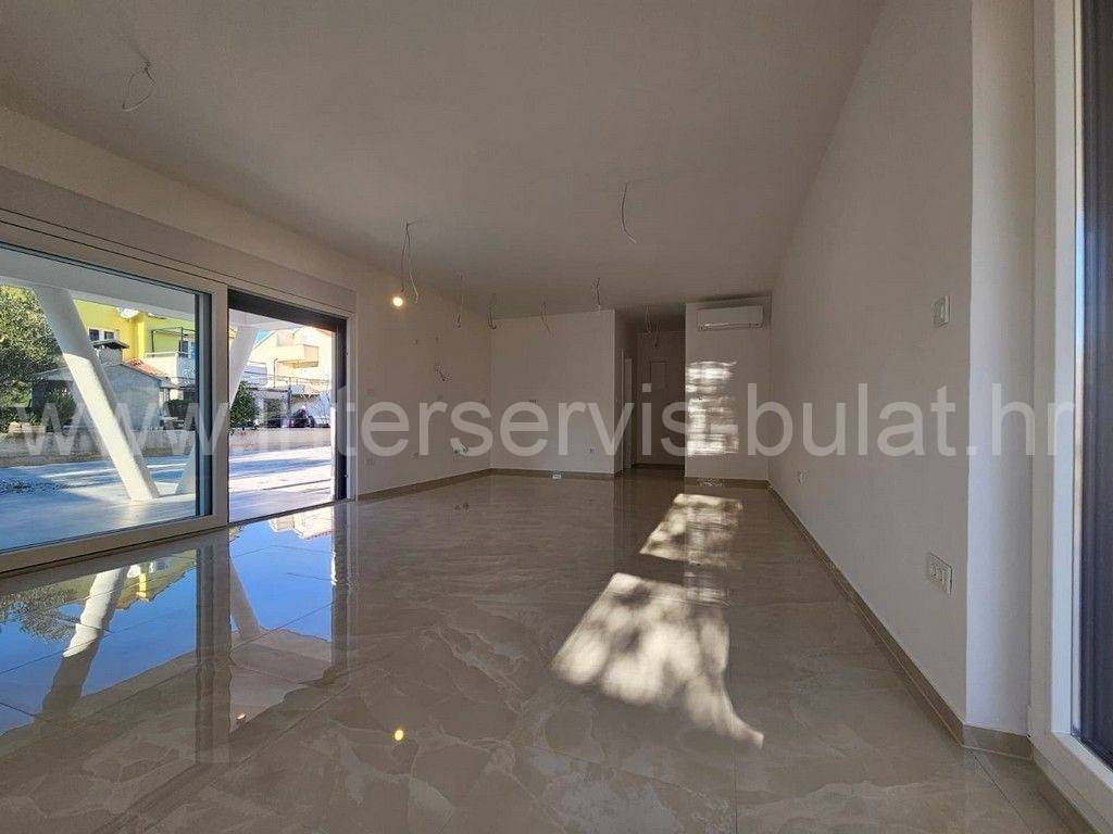 In a quieter location in Vodice, there is a building with three floors and one apartment on each floor. The apartment in question is located on the ground floor of the building and has 112 sqm of usable area. It consists of a hallway, toilet, bathroom, kitchen with dining room and living room, two bedrooms and access to two terraces. The apartment is equipped with mosquito nets, electric blinds, air conditioning in all rooms, underfloor heating in the bathroom, kitchen and living room. The building is well built, and the floors and sanitary facilities are made of top-quality materials. The apartment also has a 128m2 garden and two parking spaces.