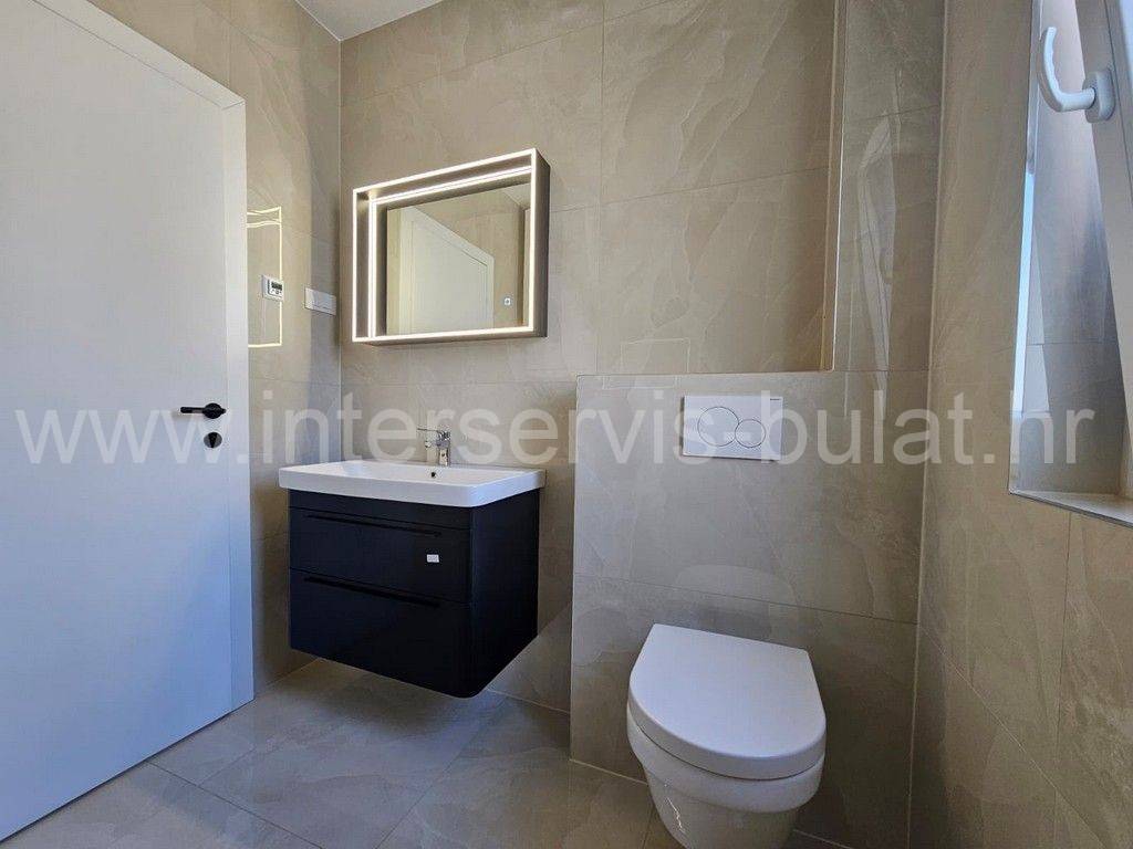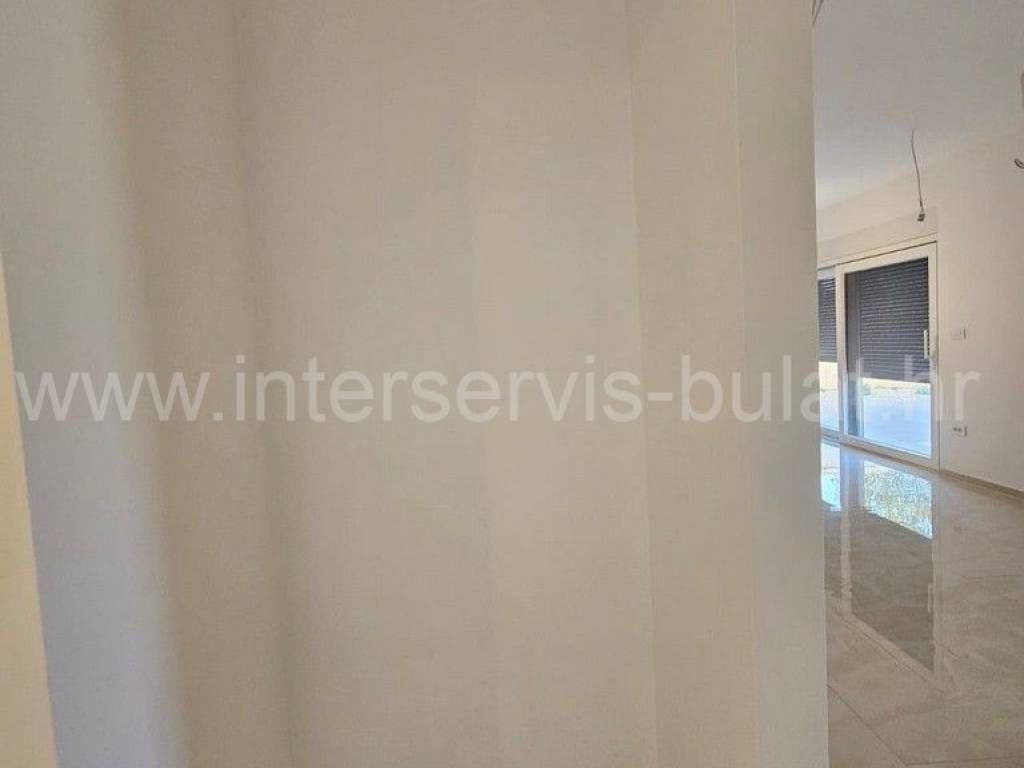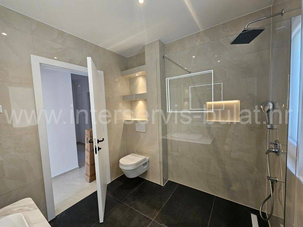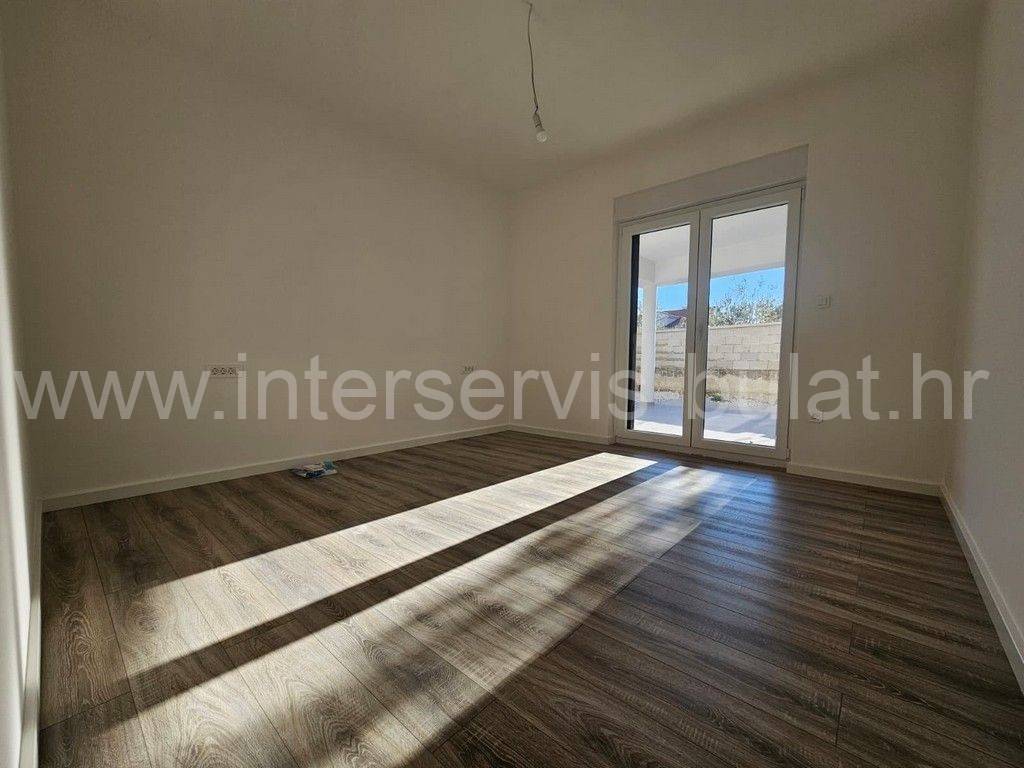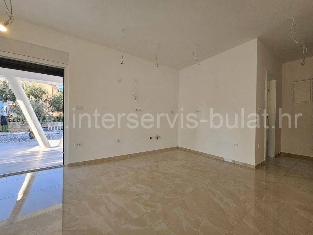 In a quieter location in Vodice, there is a building with three floors and one apartment on each floor. The apartment in question is located on the ground floor of the building and has 112 sqm of usable area. It consists of a hallway, toilet, bathroom, kitchen with dining room and living room, two bedrooms and access to two terraces. The apartment is equipped with mosquito nets, electric blinds, air conditioning in all rooms, underfloor heating in the bathroom, kitchen and living room. The building is well built, and the floors and sanitary facilities are made of top-quality materials. The apartment also has a 128m2 garden and two parking spaces.