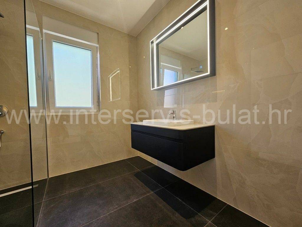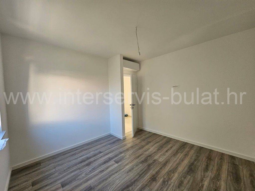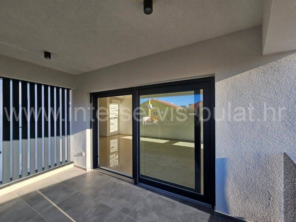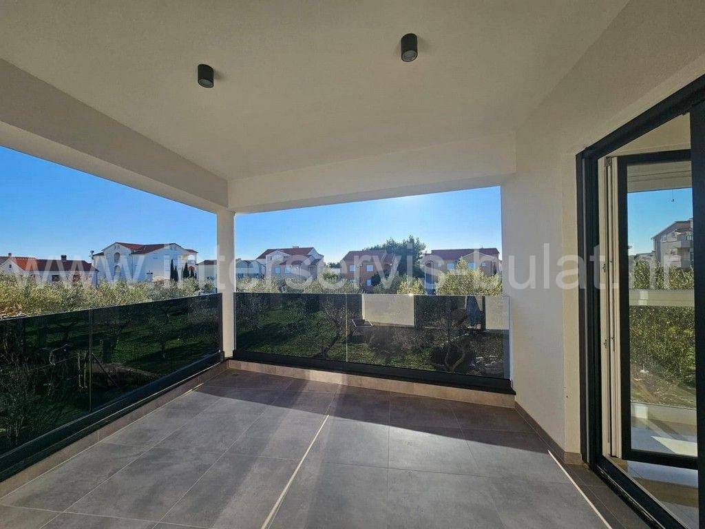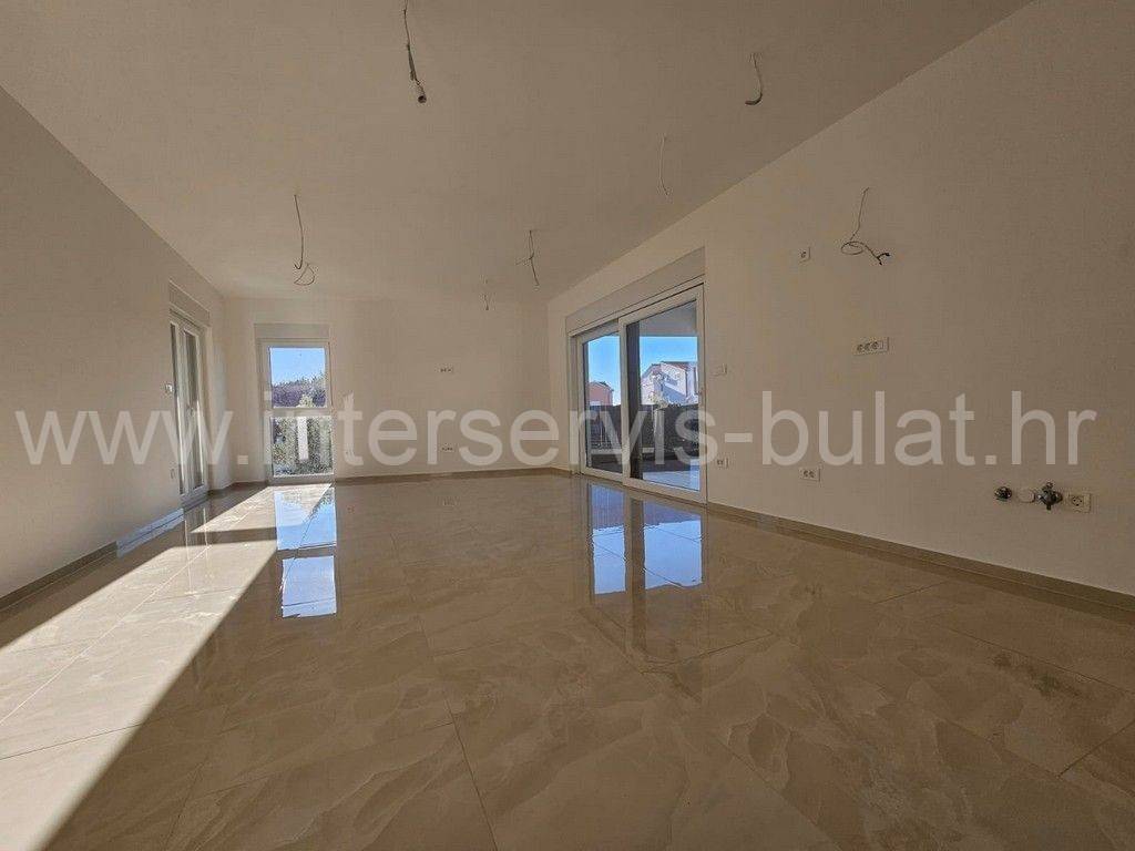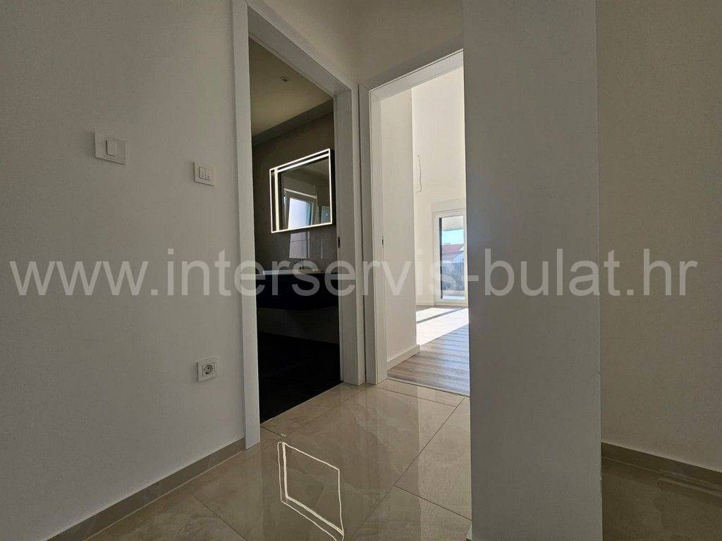 In a quiet location in Vodice, there is a building with three floors and one apartment on each floor. The apartment in question is located on the first floor of the building and has 86 sqm of usable area. It consists of a hallway, toilet, bathroom, kitchen with dining room and living room, two bedrooms and access to two terraces. The apartment is equipped with mosquito nets, electric blinds, air conditioning in all rooms, underfloor heating in the bathroom, kitchen and living room. The building is well built, and the floors and sanitary facilities are made of top-quality materials. The apartment also has a one parking space.
