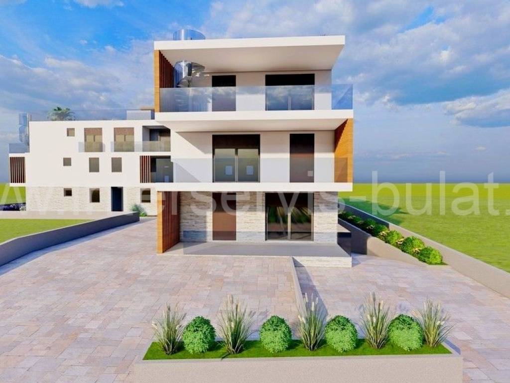 In a very good location in Vodice, near the center, there is a new building with 12 residential units. The apartment in question is located on the ground floor of the building and has 116.39 sqm of usable area. It consists of a hallway, kitchen with dining area and living room with access to a terrace of 20.16 sqm, bathroom, and three bedrooms, one of which has its own bathroom and wardrobe. The apartment has a parking space of 14.11 sqm and a yard of 106.48 sqm next to the aforementioned terrace.