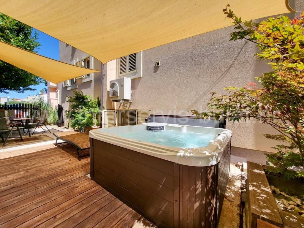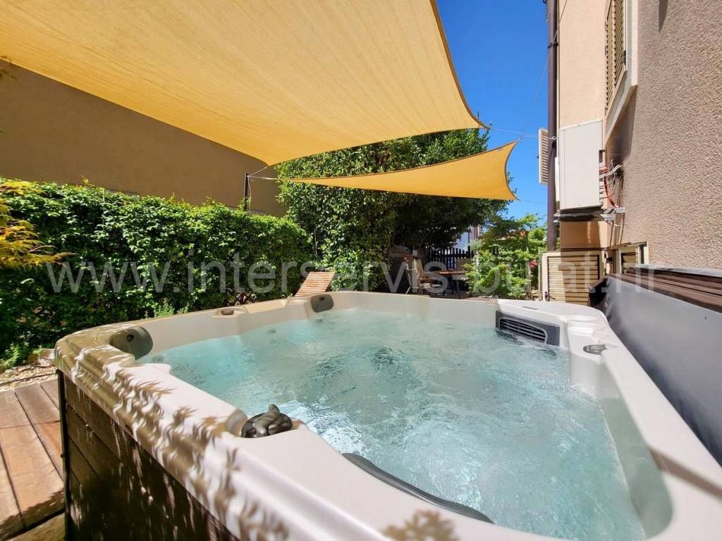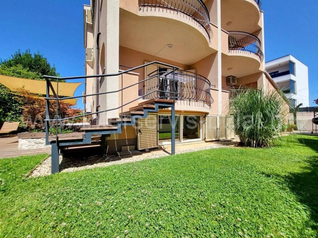 From the balcony there is access to the yard of 198m2, which belongs exclusively to this apartment and in which there is a hydromassage pool, deckchairs, an area for sunbathing and sitting in the shade, a beautiful green garden that is watered by automatic irrigation and a garage 29sqm with remote opening.