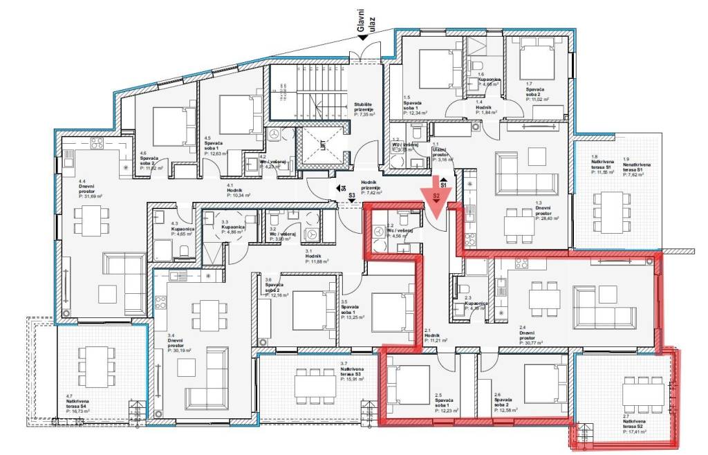 Apartment S4 with a total area of 83.73 m2 consists of entrance, hallway, toilet/laundry room, bathroom, two bedrooms, kitchen with dining area and living room, and a covered terrace of 16.73 m2. The apartment includes a storage room in the basement and one parking space.