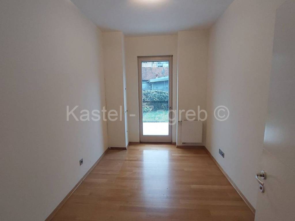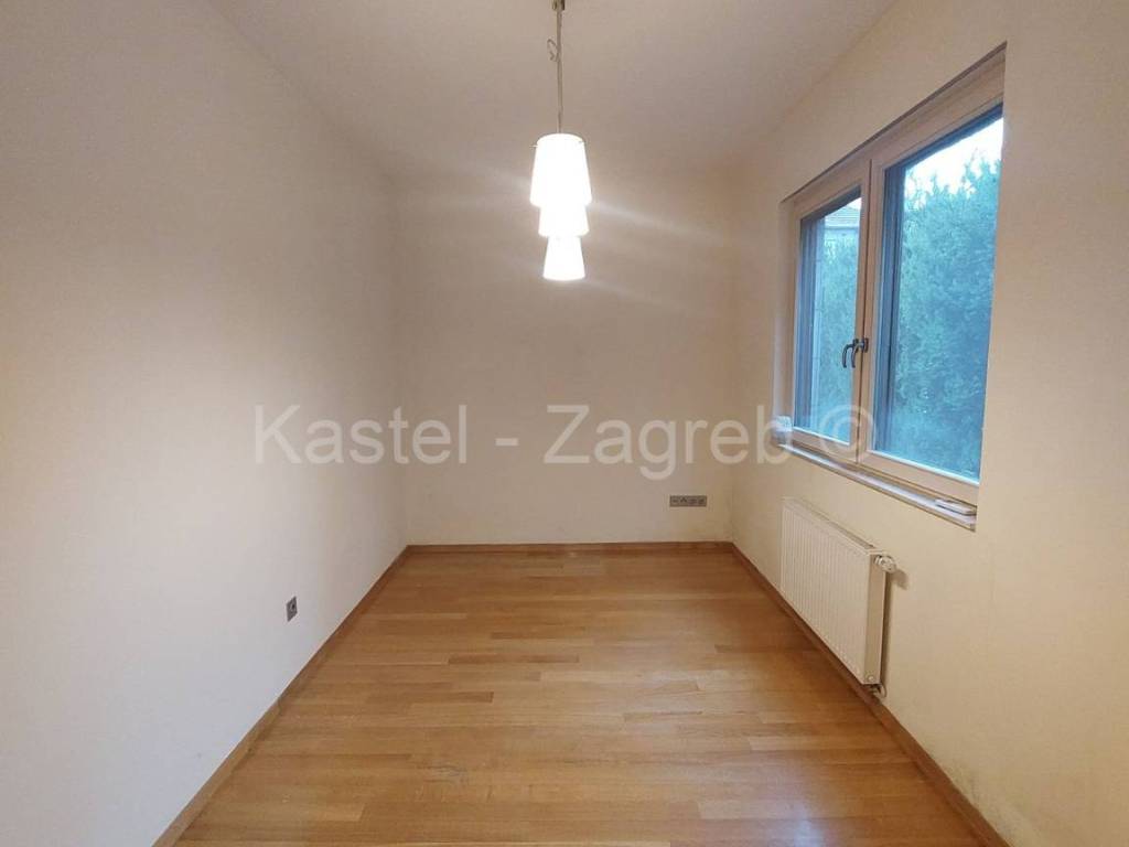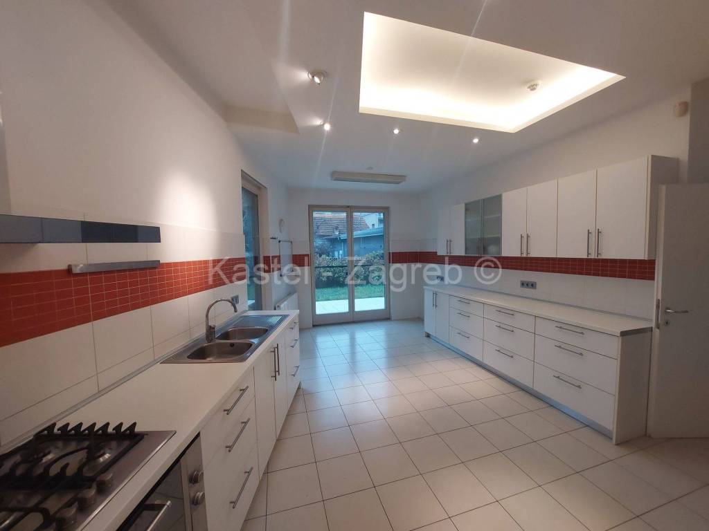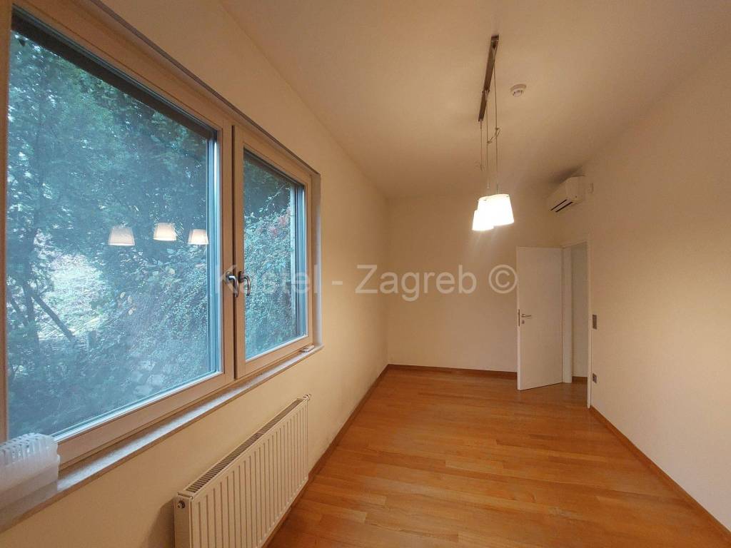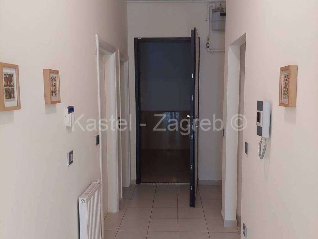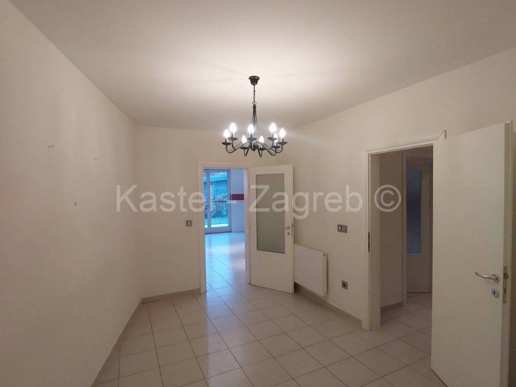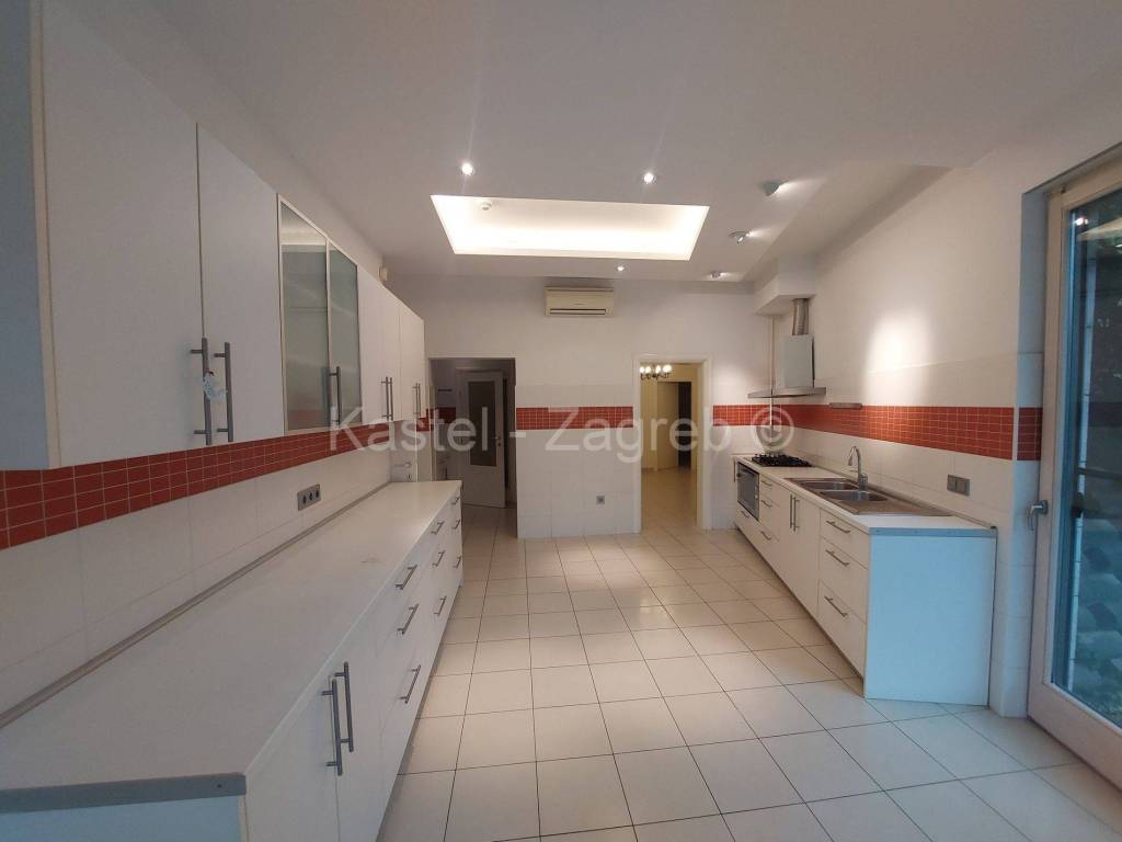 Stan u novijoj zgradi na odličnoj lokaciji, 10 min hoda do Kvaternikovog trga. Zgrada povučena od glavne prometnice okružena zelenilom. U zgradi samo tri stana s ugrađenim dizalom. Stan se sastoji zatvorenog dijela 127 m2 kojeg čine dva hodnika, kupaonica, wc, dvije kuhinje i blagovanjem, kotlovnica s vešerajem, izba, tri sobe, dvije prostorije (2 x 20 m2 tehnički podrum nije upisan u ZK, moguća sauna, teretana). Stanu pripada terasa površine 31,62 m2, vrt 140 m2 i dva parkirna mjesta 30m2 ispred ulaza u zgradu. Sadašnji vlasnik originalni raspored dnevnog boravka prilagodio svojim potrebama knauf zidom, koji se lako ukloni.