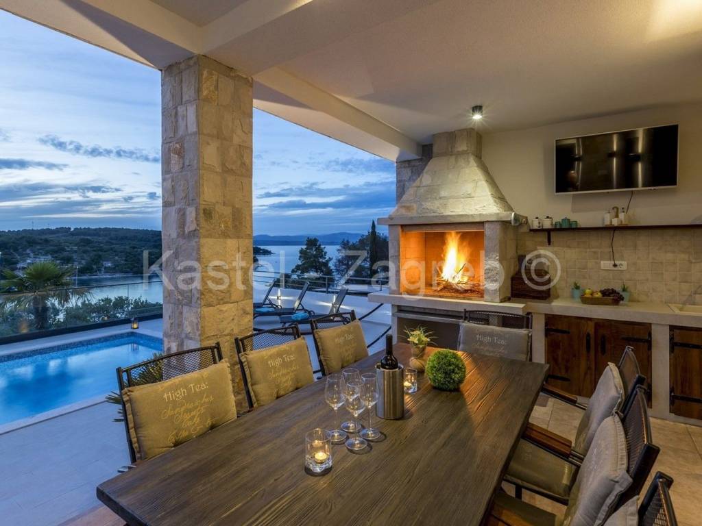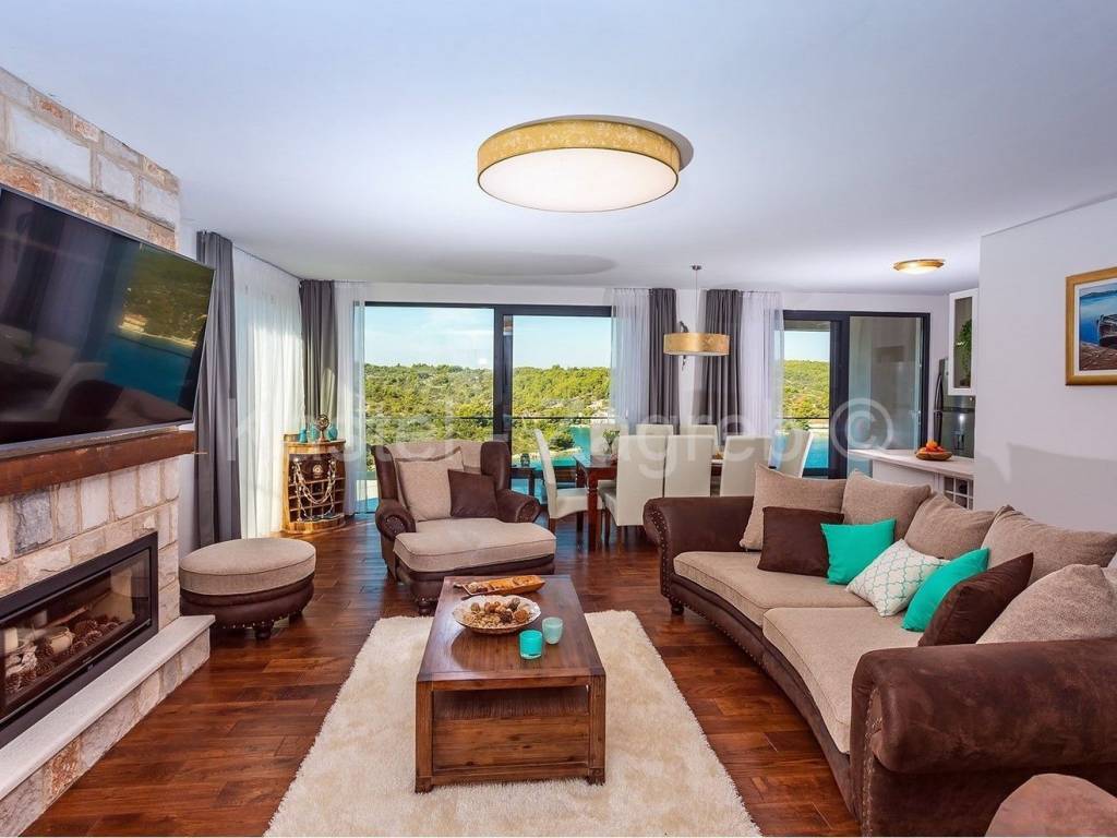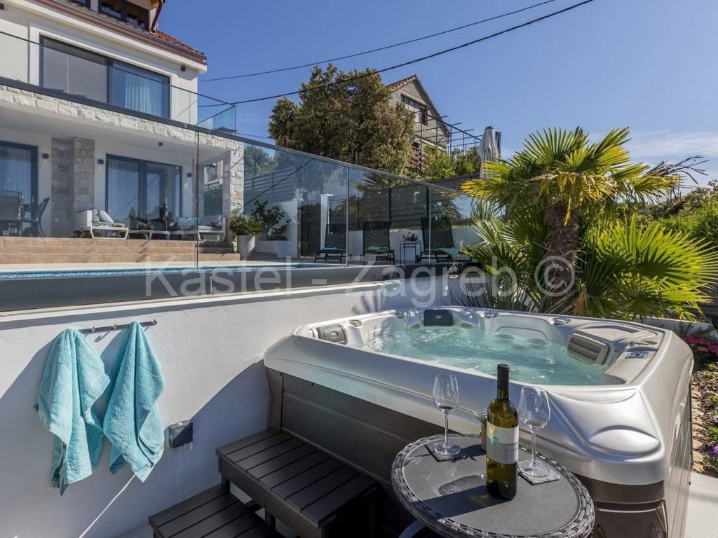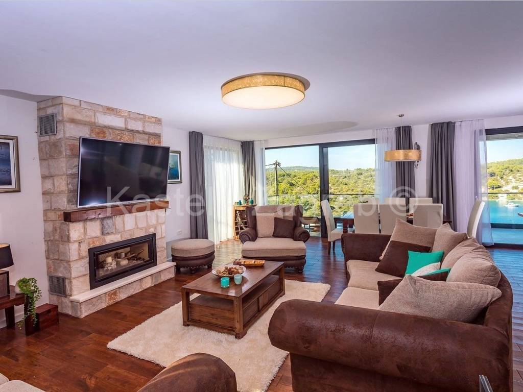 Unutarnje stubište vodi na prvi kat sa otvorenim dnevnim boravkom sa kaminom i potpuno opremljenom kuhinjom s blagovaonicom te ogromnom terasom s otvorenim pogledom na more. S ove razine pristupate parkiralištu i glavnom ulazu u vilu.Privatno parkiralište osigurano je ispred kuće za 2 automobila.