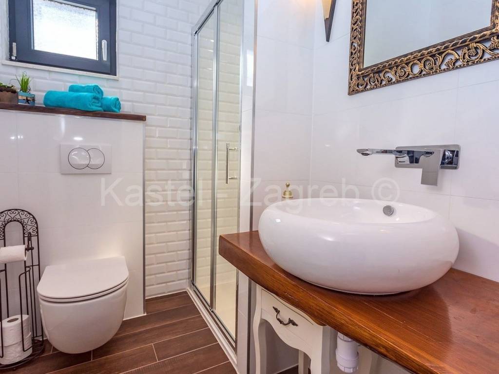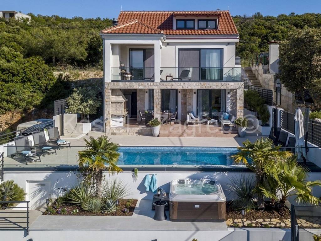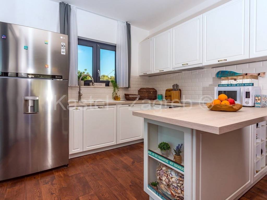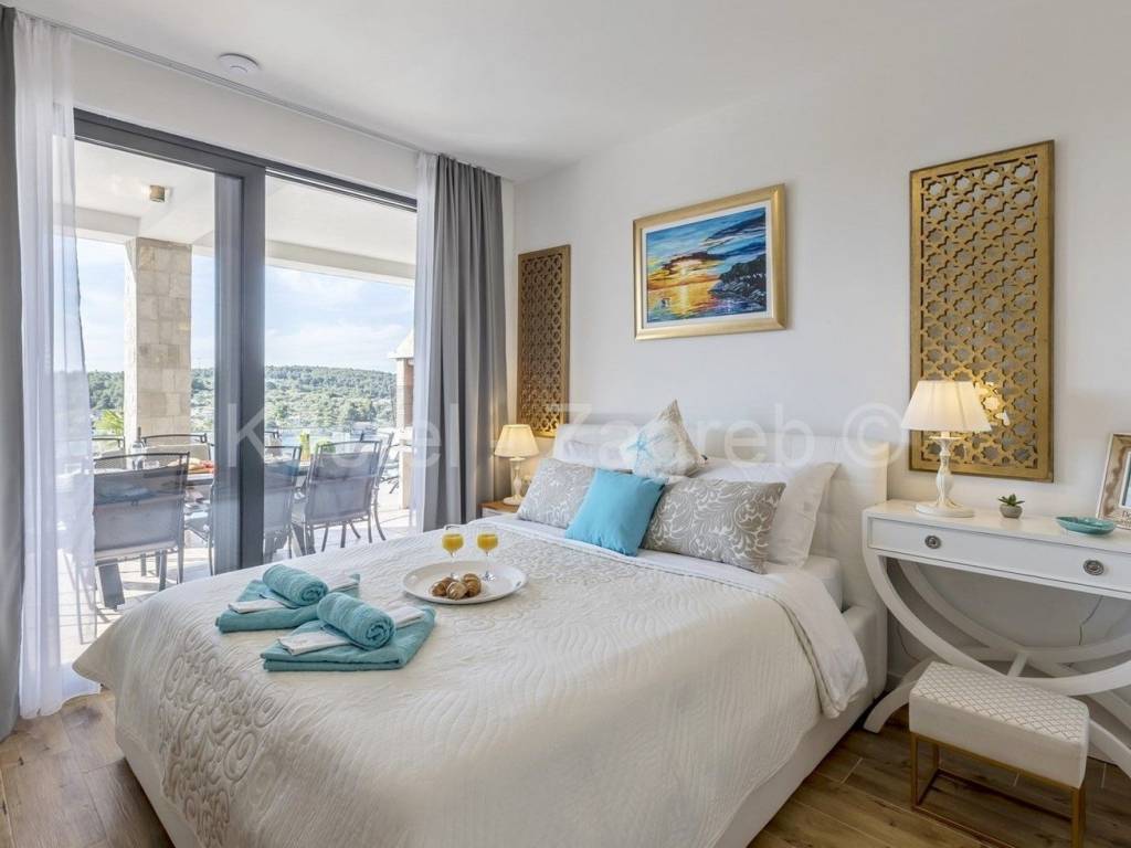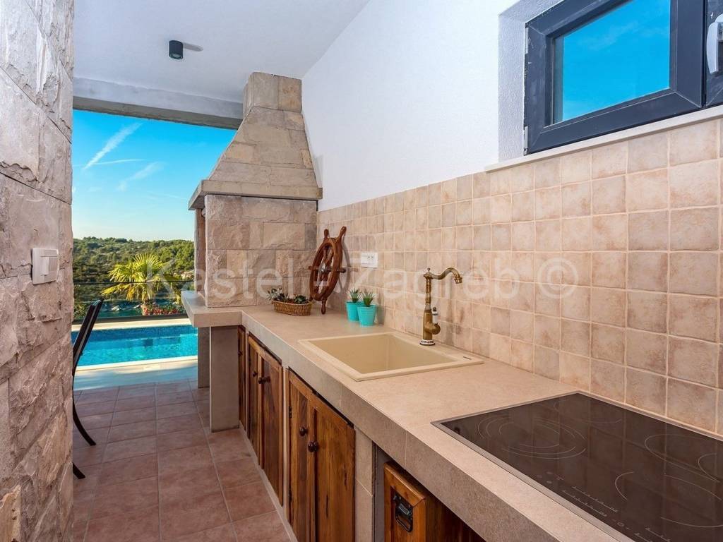 Unutarnje stubište vodi na prvi kat sa otvorenim dnevnim boravkom sa kaminom i potpuno opremljenom kuhinjom s blagovaonicom te ogromnom terasom s otvorenim pogledom na more. S ove razine pristupate parkiralištu i glavnom ulazu u vilu.Privatno parkiralište osigurano je ispred kuće za 2 automobila.