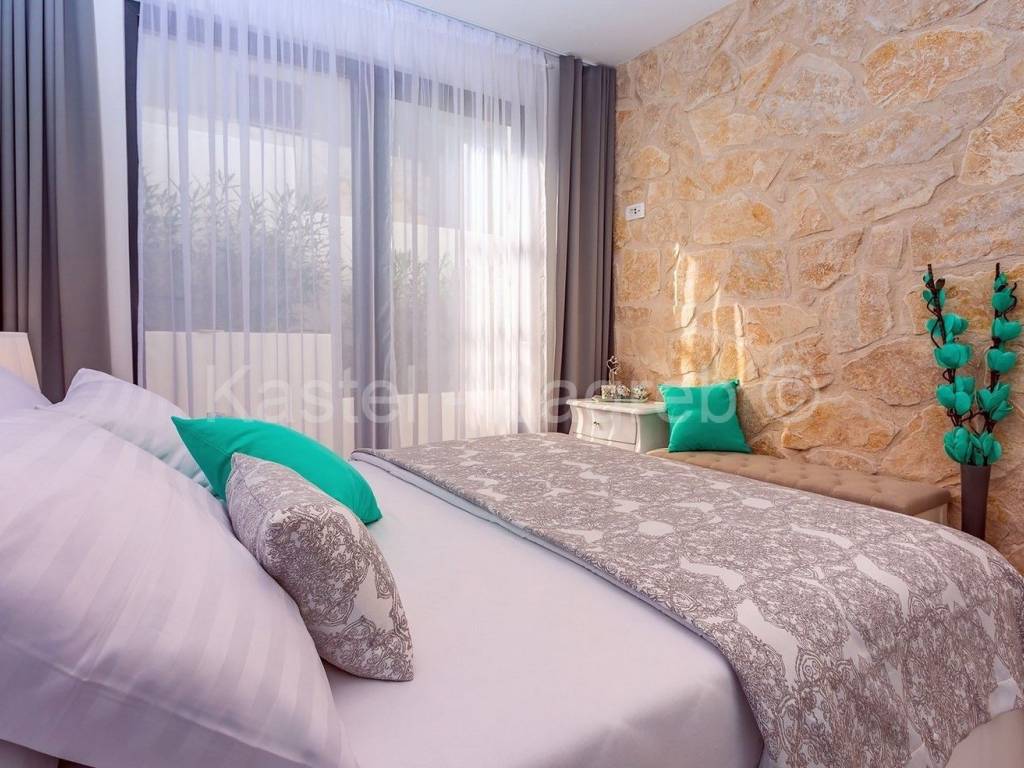 Prizemlje nudi 3 spavaće sobe s direktnim pristupom bazenu. Spavaća soba br. 1 s bračnim krevetom 160x200 cm, klimatiziranom kupaonicom s tušem i izlazom prema bazenu. Spavaća soba br. 2 s bračnim krevetom 160x200 cm, klima uređajem i obiteljskom kupaonicom s tušem u hodniku za spavaću sobu br. 2. Spavaća soba br. 3 s bračnim krevetom 160x200 cm, klimatiziranom, vlastitom kupaonicom s tušem. Dvije sobe su orjentirane na terasu sa bazenom.Tu je i praonica rublja s perilicom i sušilicom rublja.