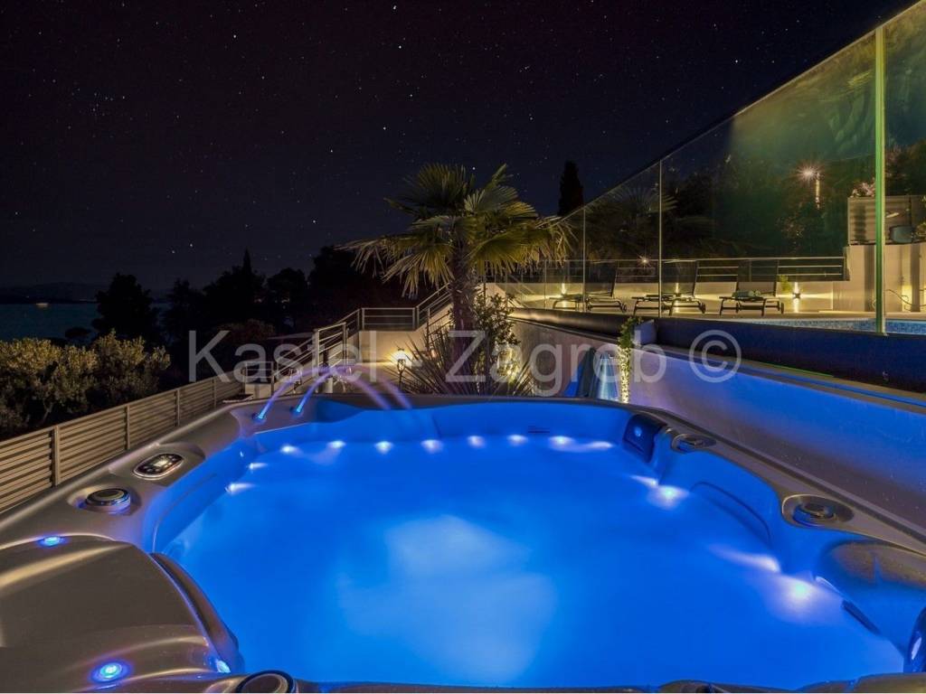 Vanjski prostor nudi privatni grijani bazen od 30 m (8 m x 3,7 m) s hidromasažnim sustavom, jacuzzi i sunčalište. Tu je i potpuno opremljena ljetna kuhinja sa stolom za blagovanje i prostorom za odmor, oboje natkriveno ispred bazena. Nekoliko stepenica dolje vodi vas do igrališta s trampolinom i stolnim tenisom.