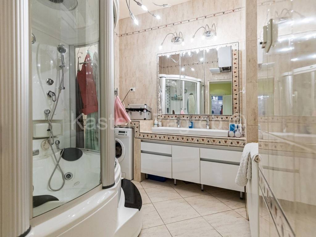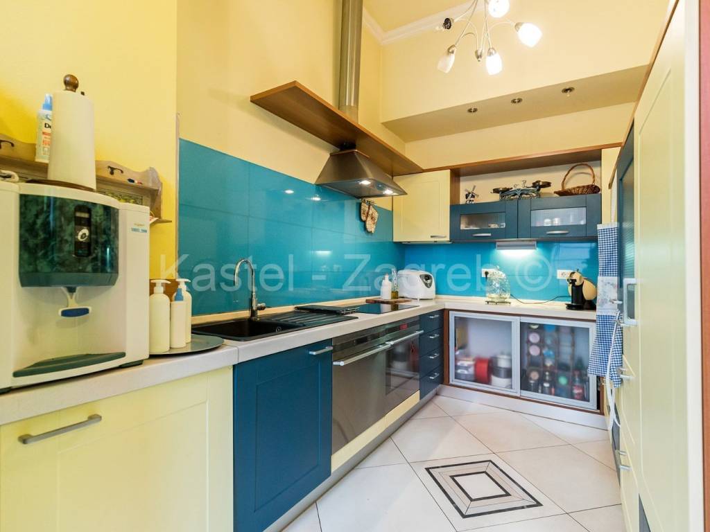 Stan se sastoji od ulaznog hodnika, 4 prostrane sobe, kuhinje povezane s velikom blagavaonom/boravkom okrenutom velikom staklenom stijenom prema dvorištu, prostrane kupaone, gostinjskog toaleta i ostave.