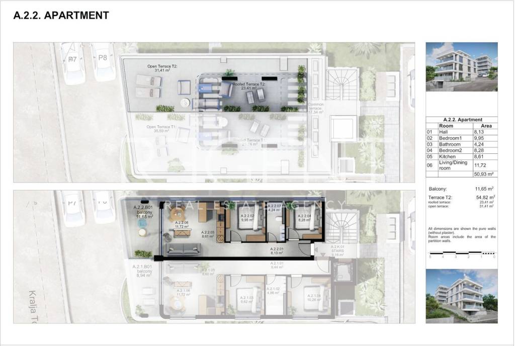 Apartment A.0.2 is located on the ground floor of a modern new building in building A, in an excellent location in Saldun on the island of Čiovo, first row to the sea. The apartment is located directly by the beach and, thanks to the associated outdoor areas and functional layout of the rooms, represents an excellent choice for families, couples or investors. The total net area of the apartment is 61.35 m², and consists of a hallway, two bedrooms, a bathroom, a kitchen and a living room with a dining room. From the living area you exit to a balcony of 11.65 m² and a terrace of 4.50 m², while the apartment is additionally valuable with two gardens, with an area of 9.27 m² and 15.10 m², which offer a spacious outdoor space for staying, socializing and relaxing in a pleasant environment or arranging according to your own wishes. The property is located in Saldun, a quiet coastal part of the island of Čiovo, in the immediate vicinity of the beach. In the vicinity there are restaurants, cafes and promenades by the sea, while shops, a pharmacy and other facilities necessary for everyday life are only a few minutes away by car. The historic core of Trogir, under UNESCO protection, is a few minutes away, and the traffic connection allows easy access to Čiovo, Trogir and Split International Airport. The apartment is equipped with PVC joinery, security doors, air conditioners, and the floor coverings are a combination of laminate and tiles. The building has an elevator, and outdoor and garage parking spaces are provided for the tenants. The start of construction is scheduled for the first half of 2026, and the completion of works is planned for the autumn of 2027. Payment is possible in construction phases, in accordance with the planned dynamics. For more information about apartment A.0.2 or to arrange a viewing, feel free to contact us.