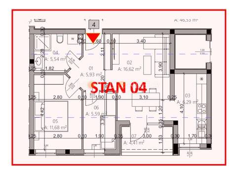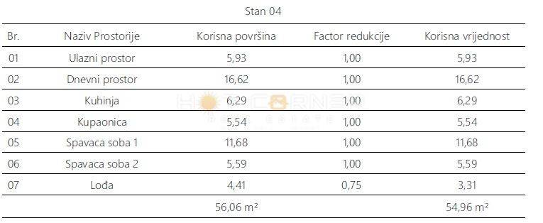 For sale: south-facing two-bedroom apartment no. 04 on the 1st floor, with a total area of 56.06 m² (reduced area 54.96 m²), consisting of 51.65 m² of interior living space and a 4.41 m² loggia (x 0.75 = 3.31 m²). The apartment comprises an entrance hallway, two bedrooms, an open-space living room with kitchen and dining area, a bathroom, and a loggia.