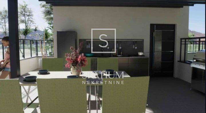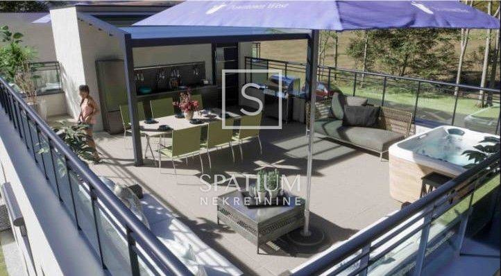 The apartment includes a private rooftop terrace of 60.58 m² with an outdoor covered kitchen/dining area/barbecue and seating space, ideal for socializing and relaxation.