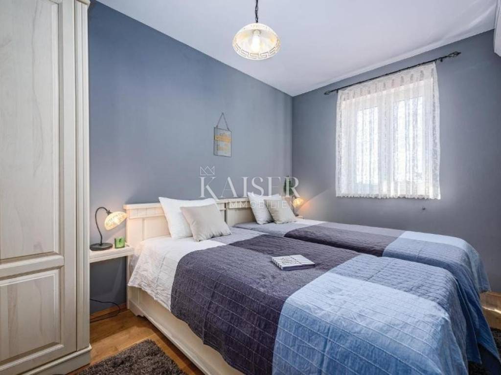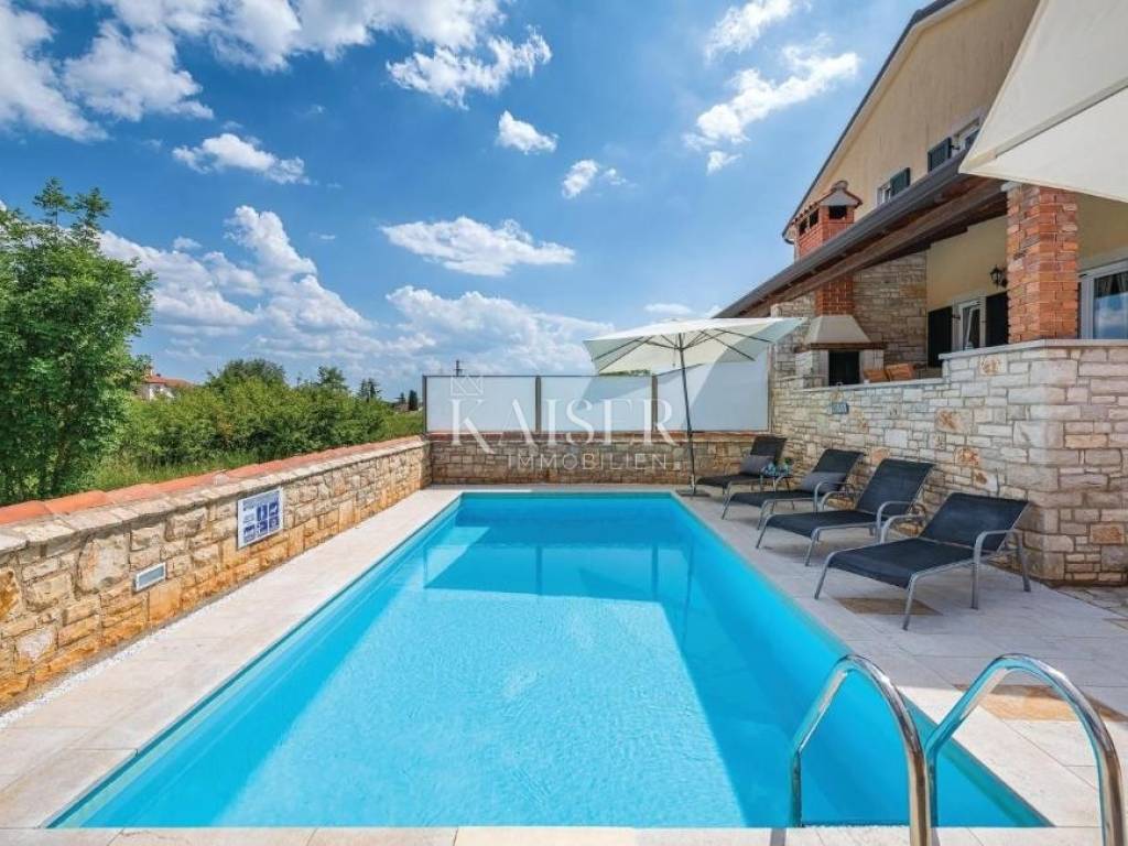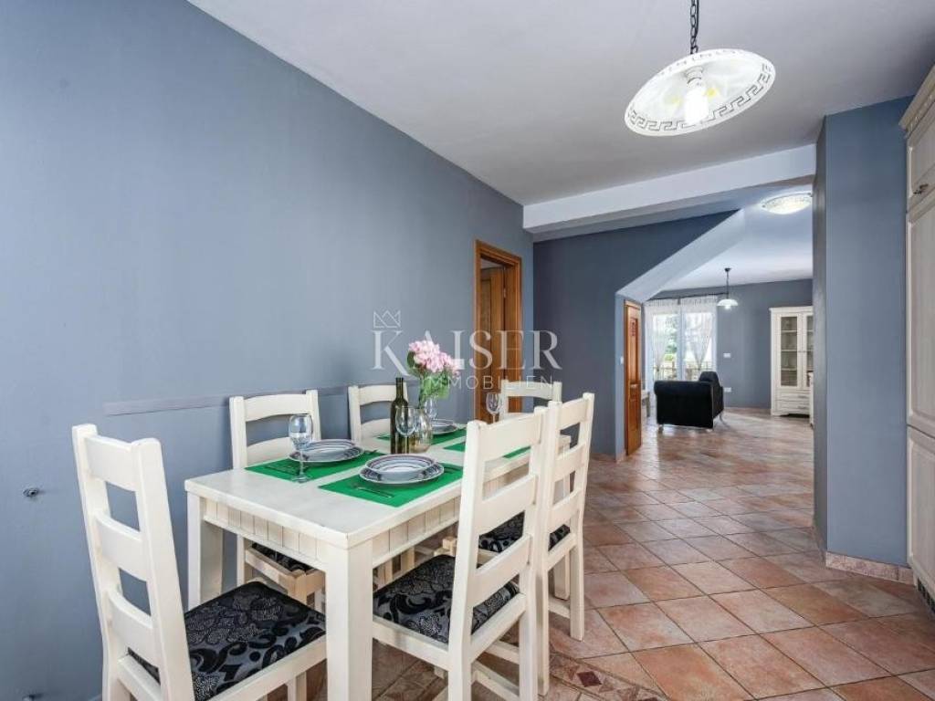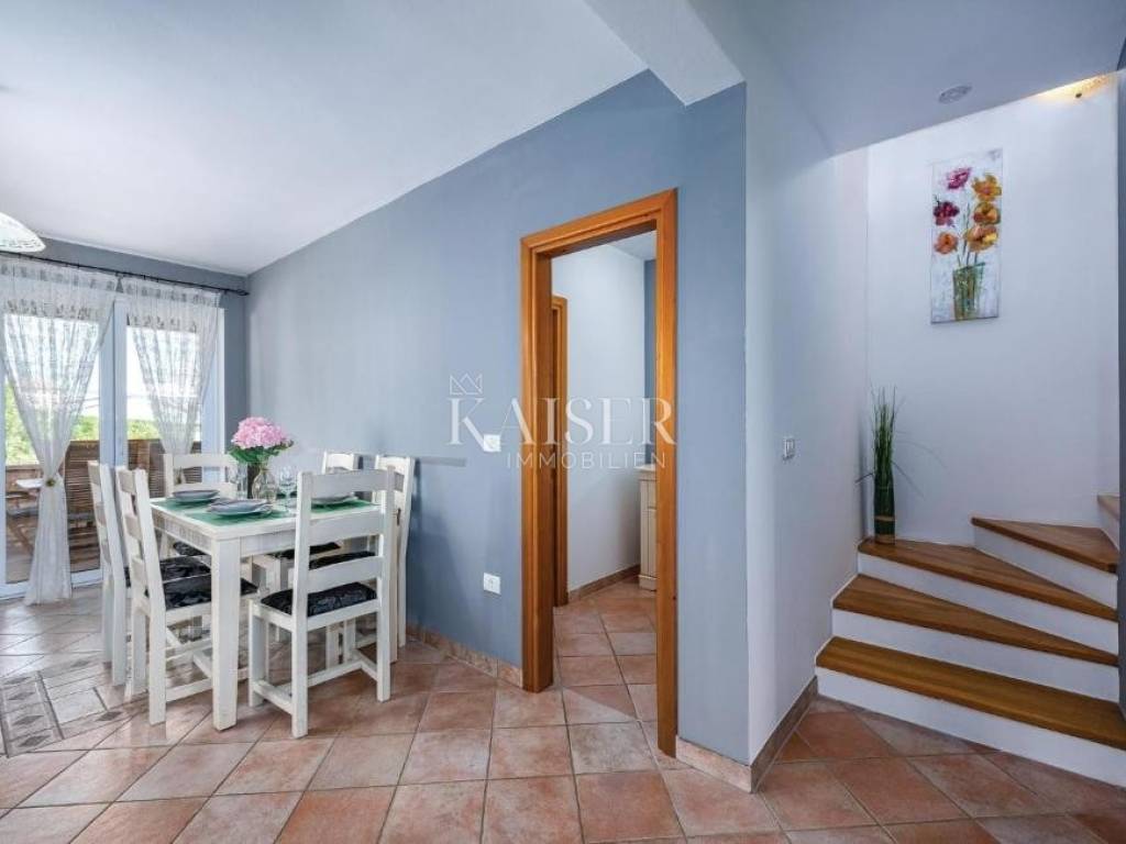 Kaiser Immobilien presents a semi-detached house in the vicinity of Umag of 144 m2 with a swimming pool, 300m from the sea. The house consists of a basement, ground floor and first floor, on a 214 m2 garden. The ground floor consists of a spacious living room with access to the terrace, a kitchen with a dining room with access to a second terrace, a hallway and a bathroom, on the first floor there are 3 spacious bedrooms with a sea view and a bathroom, in the basement there is a storage room of 32.5 m2. From the terrace there is a view of the sunbathing area and the swimming pool measuring 7x3.5m, the yard is fenced and equipped with automatic lawn irrigation. The house is sold fully furnished and is an excellent choice for tourist rental or a comfortable home. The house was built in 2008 and is located 6km from Umag and 300m from the sea and beautiful beaches.