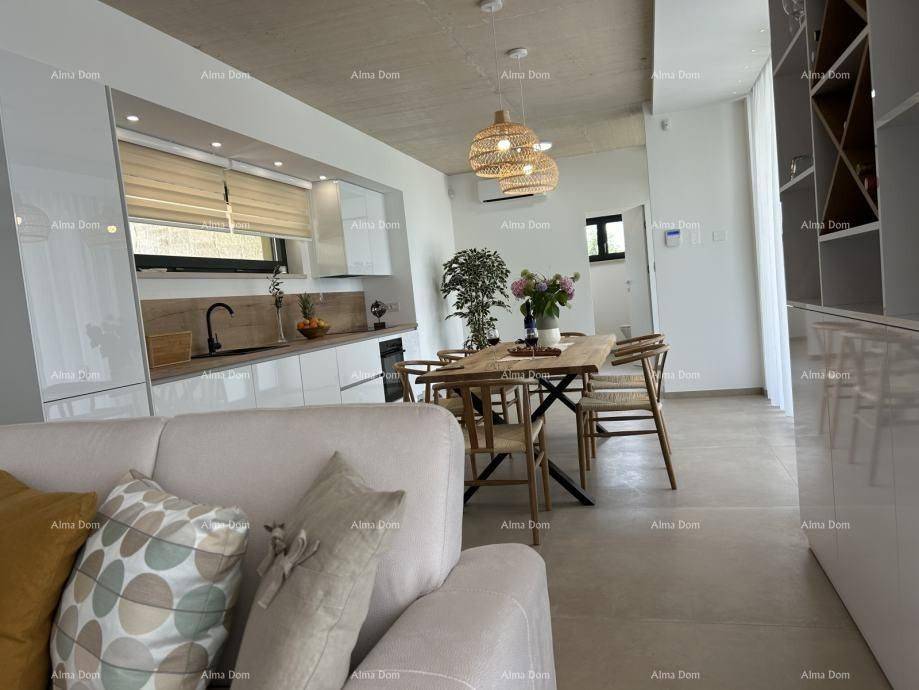 A modern house with a swimming pool facing southwest, on the edge of the village (the last urbanized plot) is for sale. Construction is scheduled to begin in the fall of 2022 and be completed in 2023. The house consists of a living room with a kitchen and a dining room, a toilet, a storage room, a boiler room and a covered terrace, as well as an auxiliary building with a fireplace on the ground floor. Upstairs are three bedrooms with bathrooms and a balcony. The house will be heated and cooled with inverter air conditioners, plastic joinery, ceramic tiles, parquet in the rooms, tiles in the pool. The first phase of underfloor central heating and collectors. In the yard, a swimming pool of 40 m2, lawn with automatic irrigation, parking for two cars, front yard door with automatic opening, fence.Info:Azra Valjevac+ 385 91 611 5706+385 98420885azra@almadominvest.com