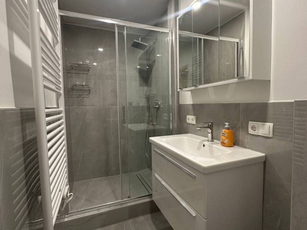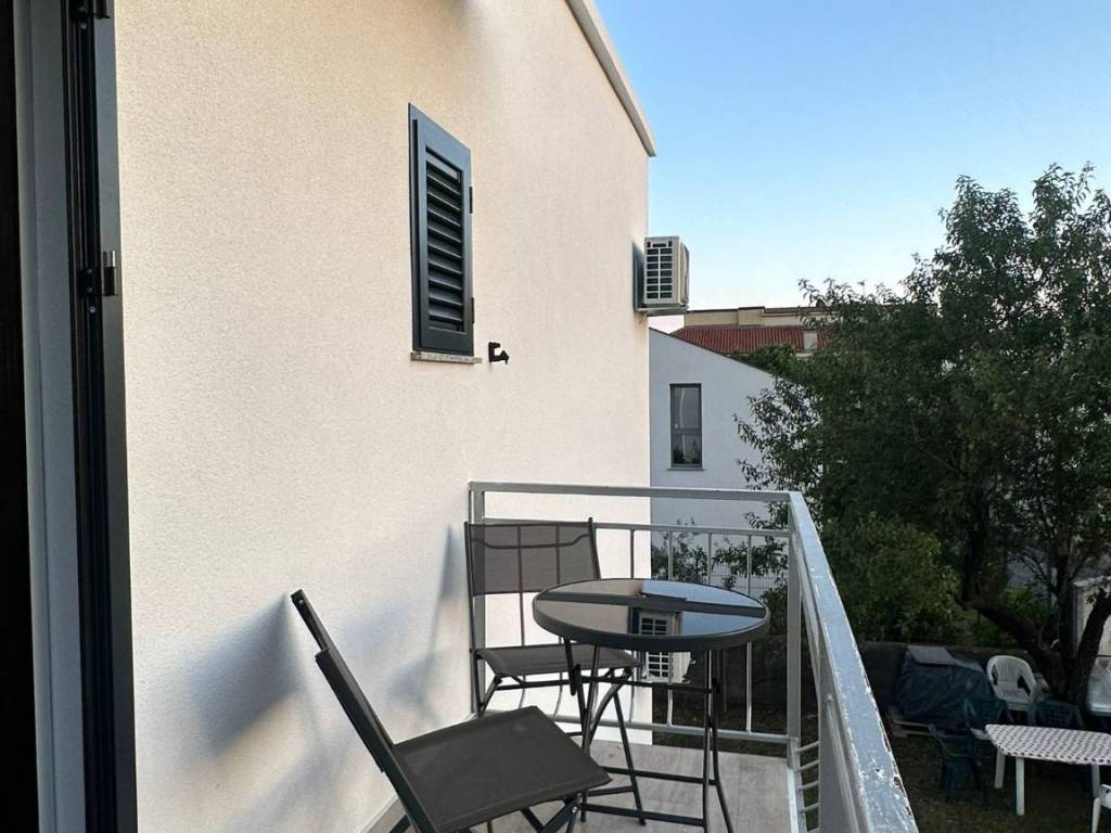 Kuća se sastoji od prizemlja i kata, na svakom katu se nalaze dva apartmana. Jedan studio apartman, drugi prostrani apartmana s velikom dnevnom sobom i kuhinjom koja ima izlaz na balkon. Tu su još hodnik, kupaonica, spavaća soba s balkonom i spremište.