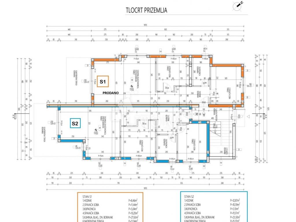 Tribunj – Sovlje, new construction, two-bedroom apartment with terrace and private garden. Apartment S2 is located on the ground floor of a smaller residential building, oriented to the southeast. The total usable area is 73.25 m² and consists of an entrance hall, two bedrooms, a bathroom, and a kitchen with dining area and living room. The living room opens onto a covered terrace of 15.17 m², which is connected to a private garden of 150 m², providing additional space for outdoor living and relaxation. The apartment also includes one parking space in front of the building, measuring 12.5 m². It is equipped with high-quality features, including premium ceramics and sanitary equipment, quality joinery, underfloor heating in the bathroom, living room and kitchen, mosquito screens, and security entrance doors. The distance to the town center is 350 m, while the sea and Sovlje beach are 450 m away.