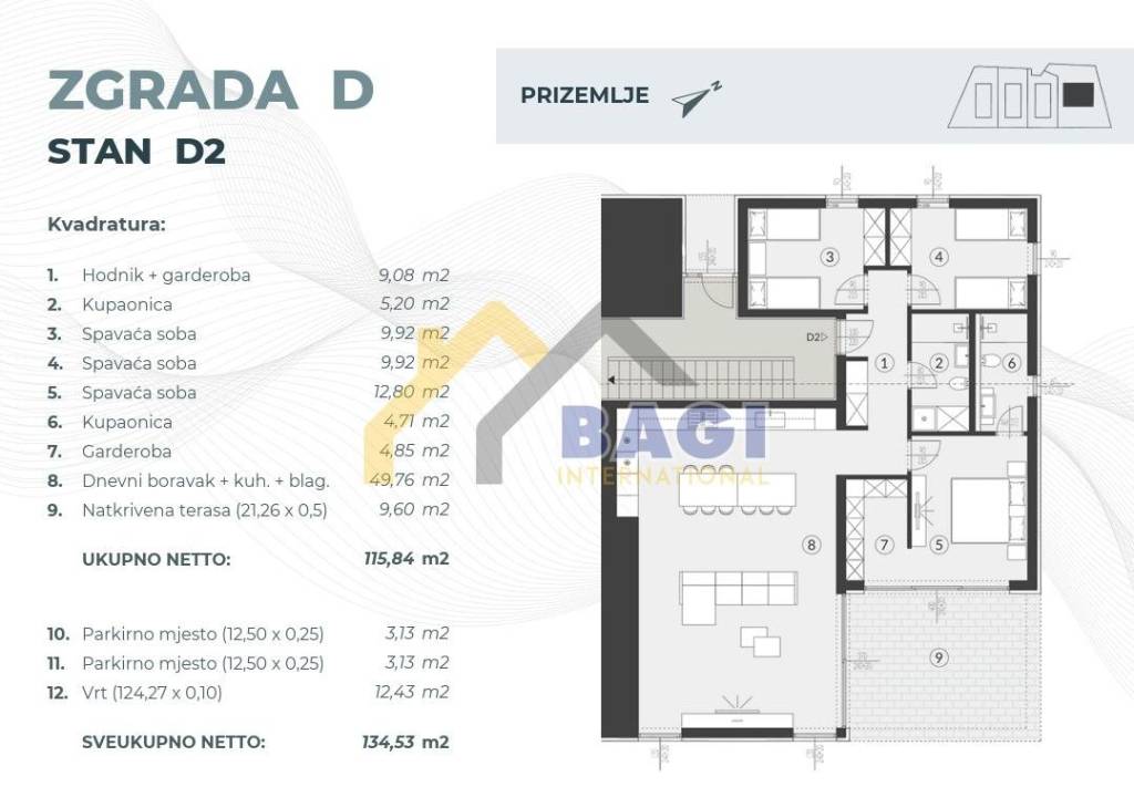 Total area of the apartment is 115.84m2 net and Garden 124.27 and consists of