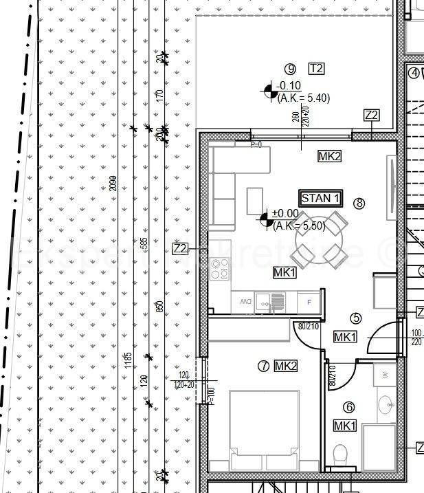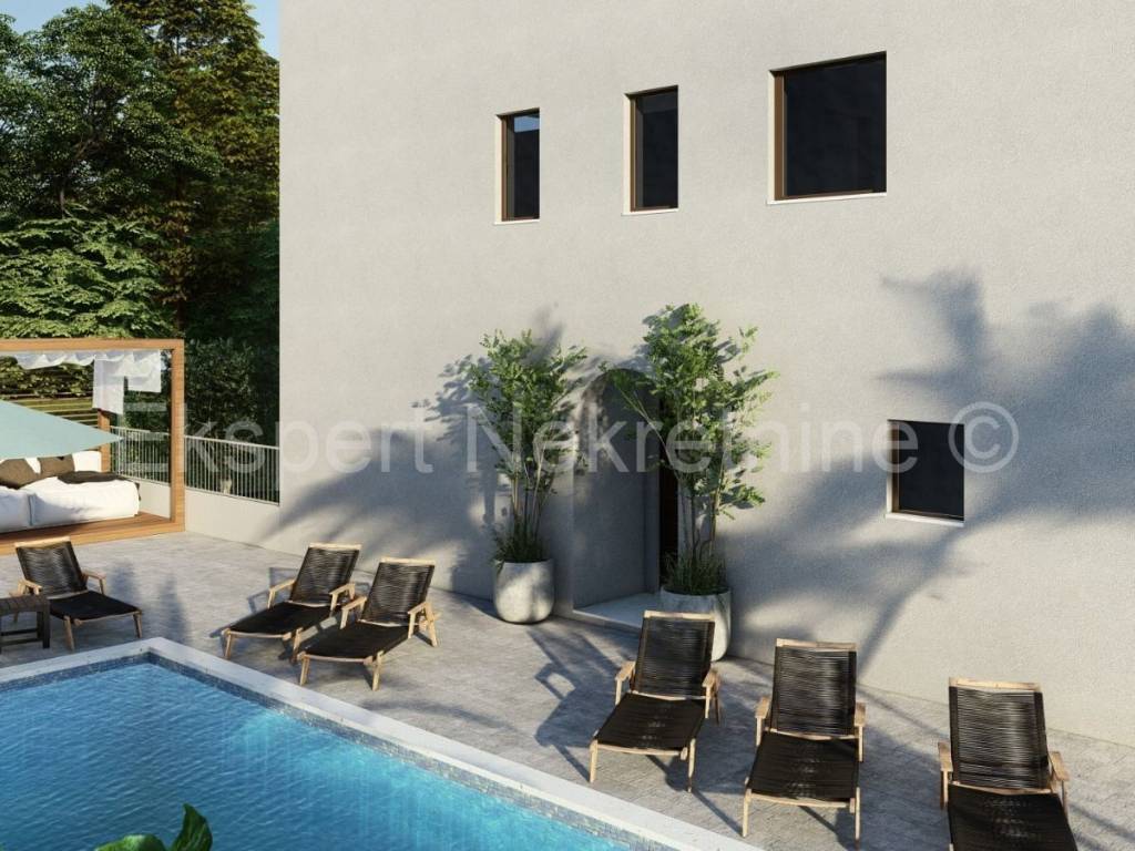 Čiovo, Slatine, one-bedroom apartment 55 m2 + large garden 120 m2 in a new building with a swimming pool. The apartment is located on the ground floor of the building and the orientation of the apartment is south-north-west. It consists of a hallway, kitchen with dining room and living room, one bedroom and bathroom, large terrace (15m2) and large garden (120 m2). The building consists of 11 residential units and a shared swimming pool, and is only 70 m from the sea and 100 m from the beach. The apartment has one garage parking space. The building is in the phase of rough construction works and completion is planned for the summer of 2028.Each apartment is equipped with air conditioning in all areas and bathroom underfloor heating with the possibility of upgrading. The apartment also includes pre-installation for a massage tub. Excellent location in the center of town, close to the sea and beach and all amenities. Close to SPLIT AIRPORT (11 km), Trogir (7 km) and the City of Split (30 km)For reservations and more information, contact the agency.
