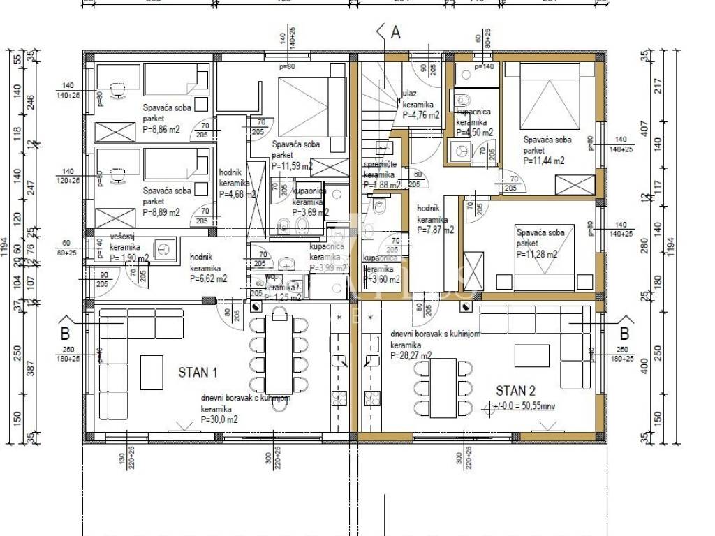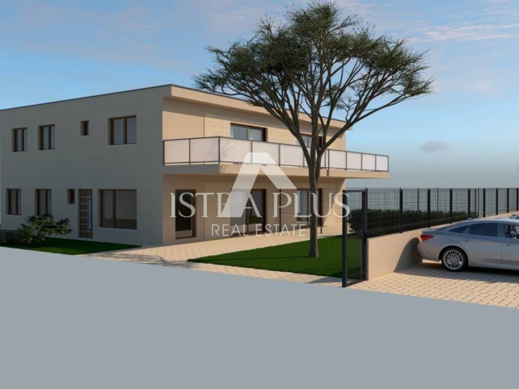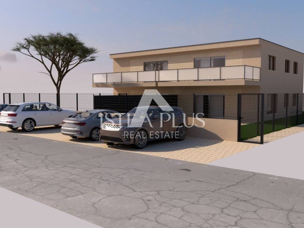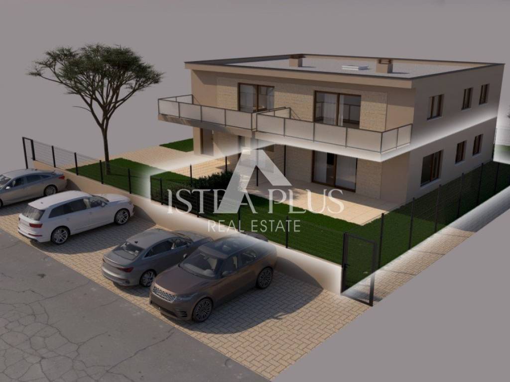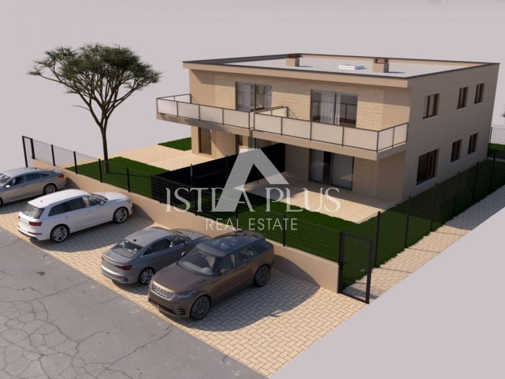 In a quiet part of Poreč, 2 kilometers from the sea, a modern apartment in a new building is for sale, located on the ground floor of a small residential building with a total of four residential units. The apartment consists of a spacious living room with kitchen and dining room, two bedrooms, two bathrooms, hallway and storage room. A special value for this apartment is given by a covered terrace and a garden of 95 m, which extends in front and to the side of the apartment.