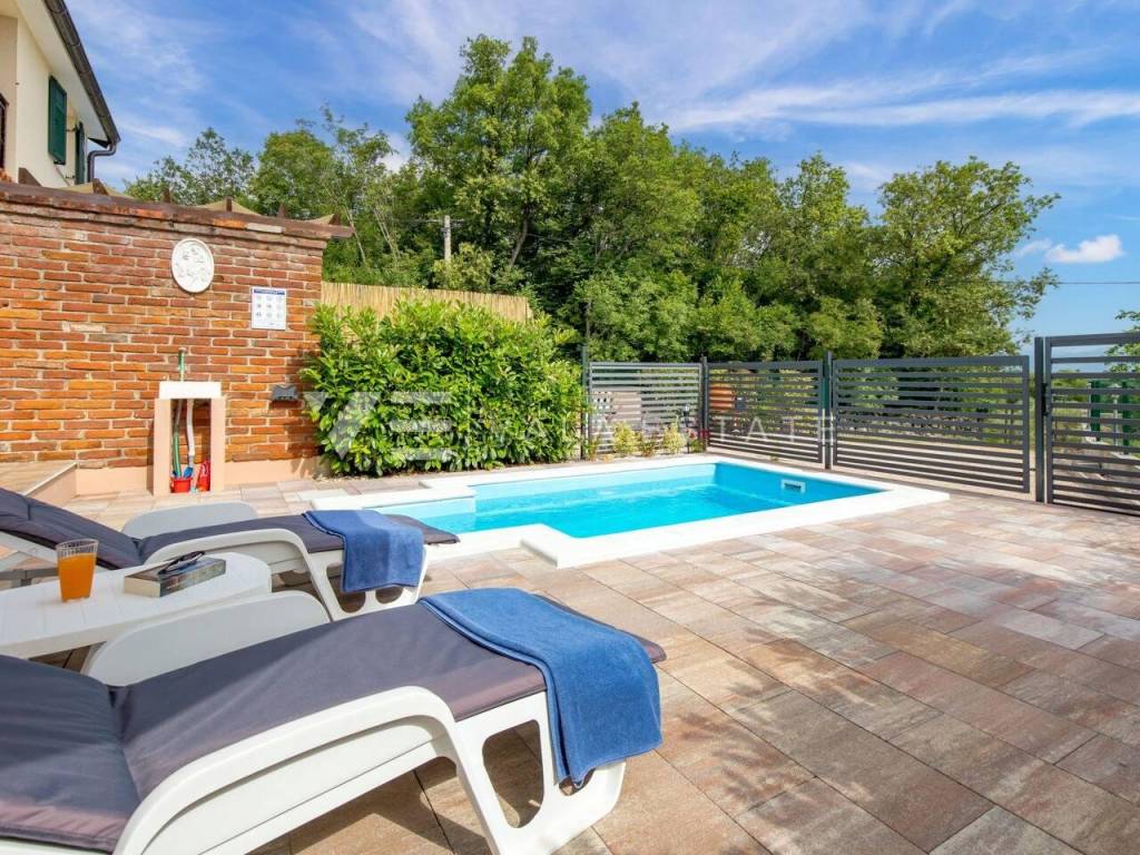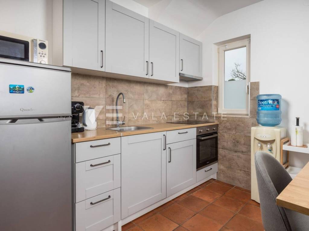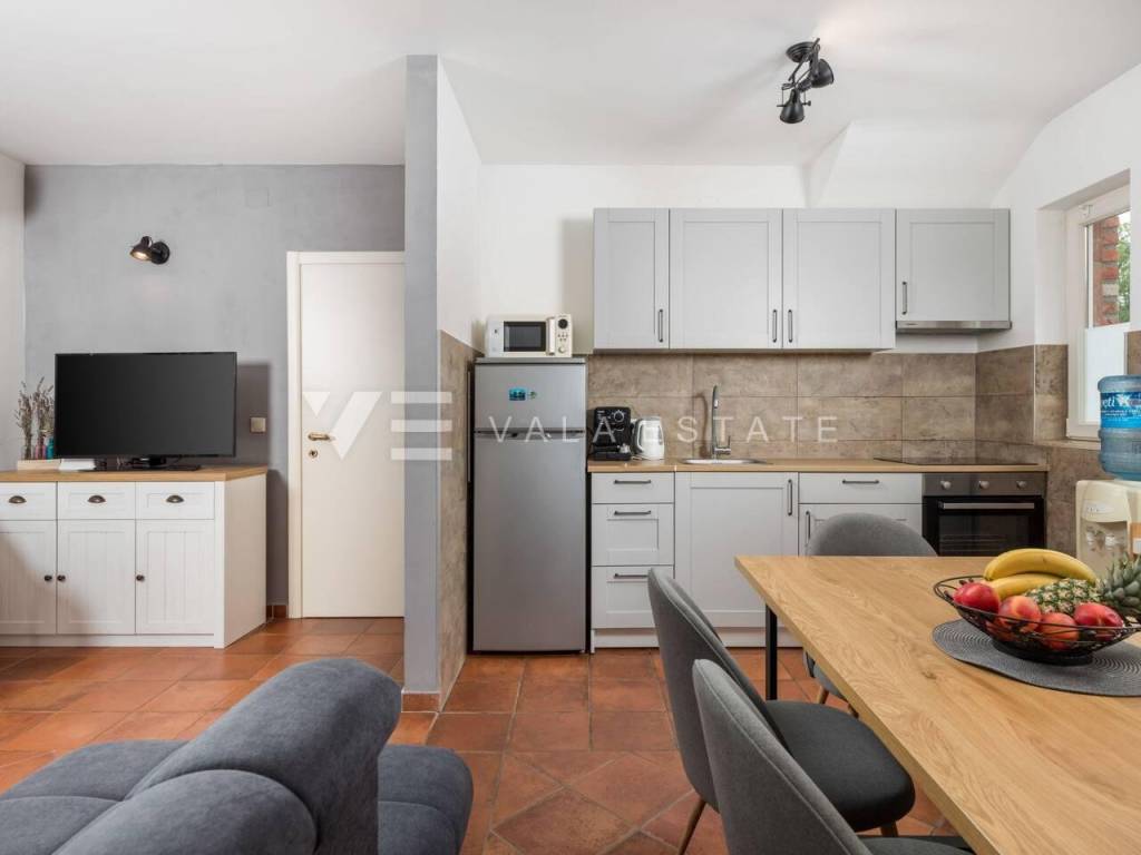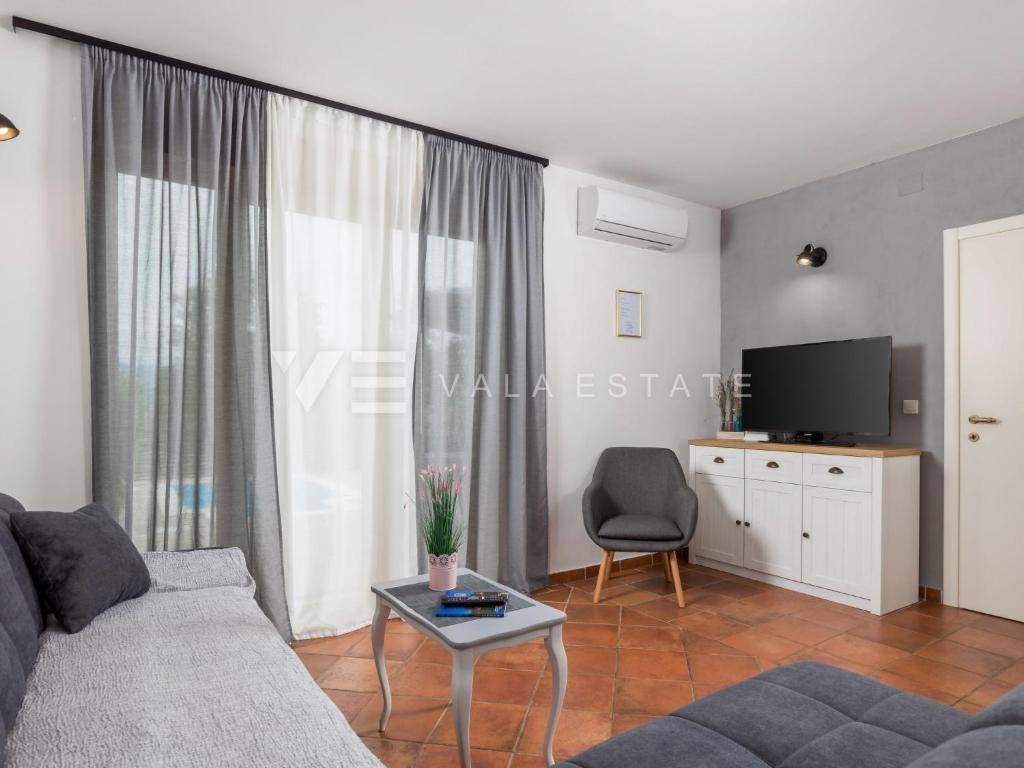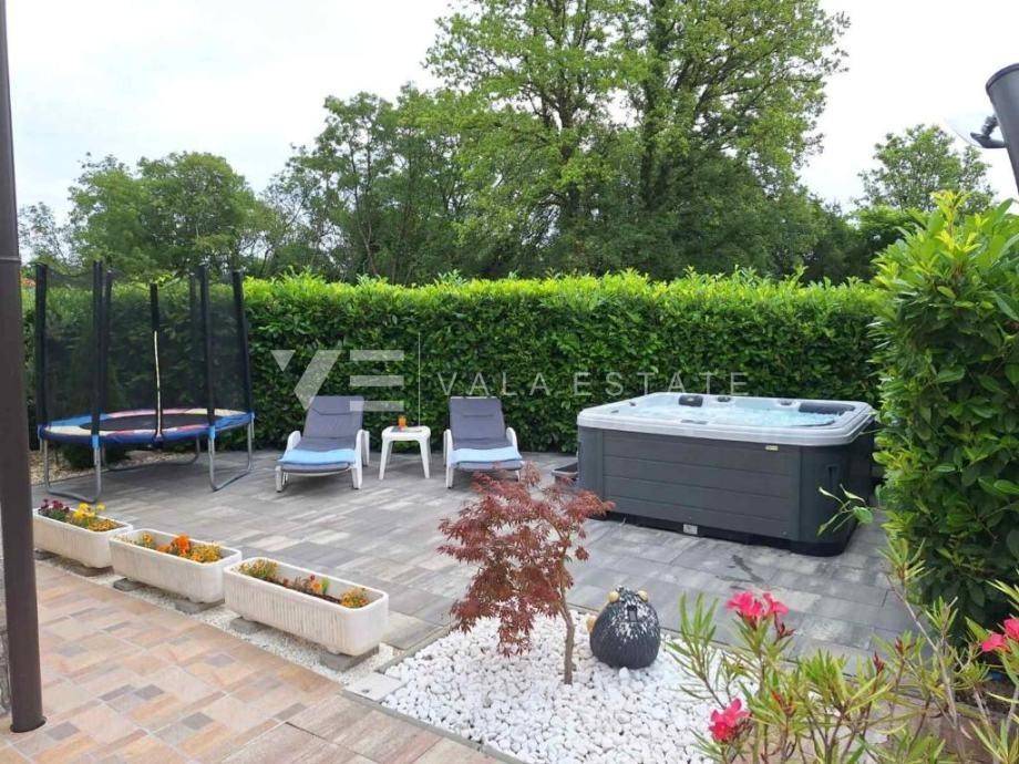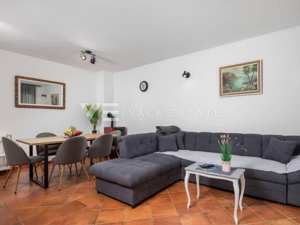 Real estate island of Krk, Soline bay - in a small rural village on the edge of the green zone in the vicinity of Soline, a newer, partly stone Mediterranean semi-detached house is for sale, surrounded by a beautiful garden and nature. The house occupies 130 m2 of living space and consists of a basement, ground floor and high attic. In the basement there is a storage room and a cellar, which is arranged as a socializing room. The ground floor includes an entrance hall, bathroom, kitchen with dining area and living room with access to the terrace and garden. Internal stairs connect the first floor where there is a bathroom and two bedrooms with access to a loggia from which there is a view of the surrounding nature. On the beautifully landscaped garden of 270 m2, enriched with Mediterranean plants perfectly integrated into the space, there are two terraces, a barbecue, a jacuzzi, a swimming pool with a sunbathing area and a summer shower, and space for three parking spaces. This charming Mediterranean house is for all lovers of a peaceful vacation, but also a good opportunity for an investment for tourist rental purposes. The location is quiet, surrounded by greenery and forests and about 2000 m away from the sea, beautiful beaches and all amenities. Vala Estate Malinska Agency will provide you with a safe and transparent transfer of ownership and all necessary documentation.