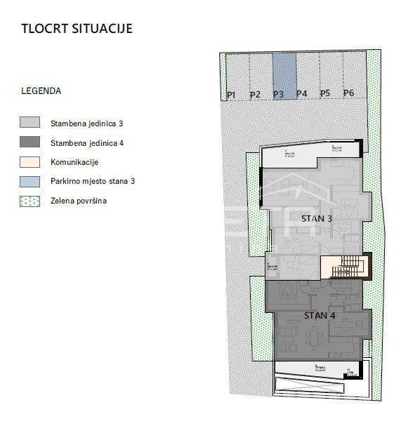 Ukupno je osigurano 6 parkirnih mjesta. Uz svaki stan obavezna je kupnja minimalno 1 parkirnog mjesta, uz mogućnost dodatnog.
