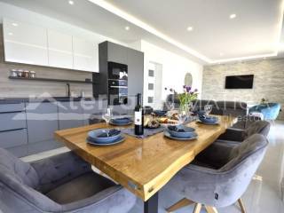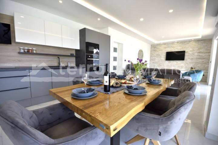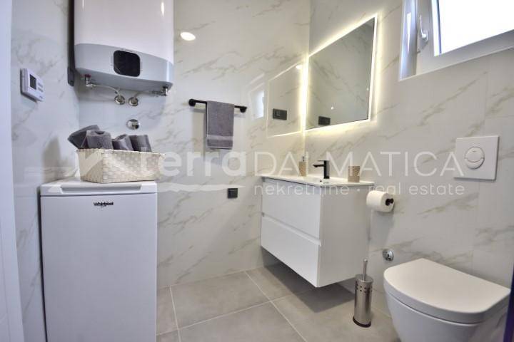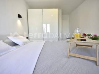 A modern family house with a swimming pool and three apartments for sale in Vodice. The house is sold with complete furniture. The concept of the house is organized so that on the ground floor is a three bedroom apartment with a garage, while on the first floor are two two bedroom apartments. It will be suitable for tourist rental. In front of the apartment on the ground floor will be a large covered terrace and a landscaped yard with a large pool of 40m 2. For the apartment on the ground floor will be installed underfloor heating. The ground floor apartment consists of a hallway, toilet, storage room, living room in one unit with kitchen, living room and dining room, and three bedrooms and a bathroom. A staircase at the back of the house leads to the first floor where two two-bedroom apartments are located. The apartment consists of two bedrooms, bathroom, in the back, while in the south there is a living room with kitchen, dining room and living room. The living room opens onto a comfortable covered terrace of 13m 2. The house is in a quiet street, a ten minute walk to the beach and the center of Vodice. Vodice is a famous tourist destination, with many facilities, suitable for year-round living. They are well connected, close to the cities of Sibenik, Zadar.