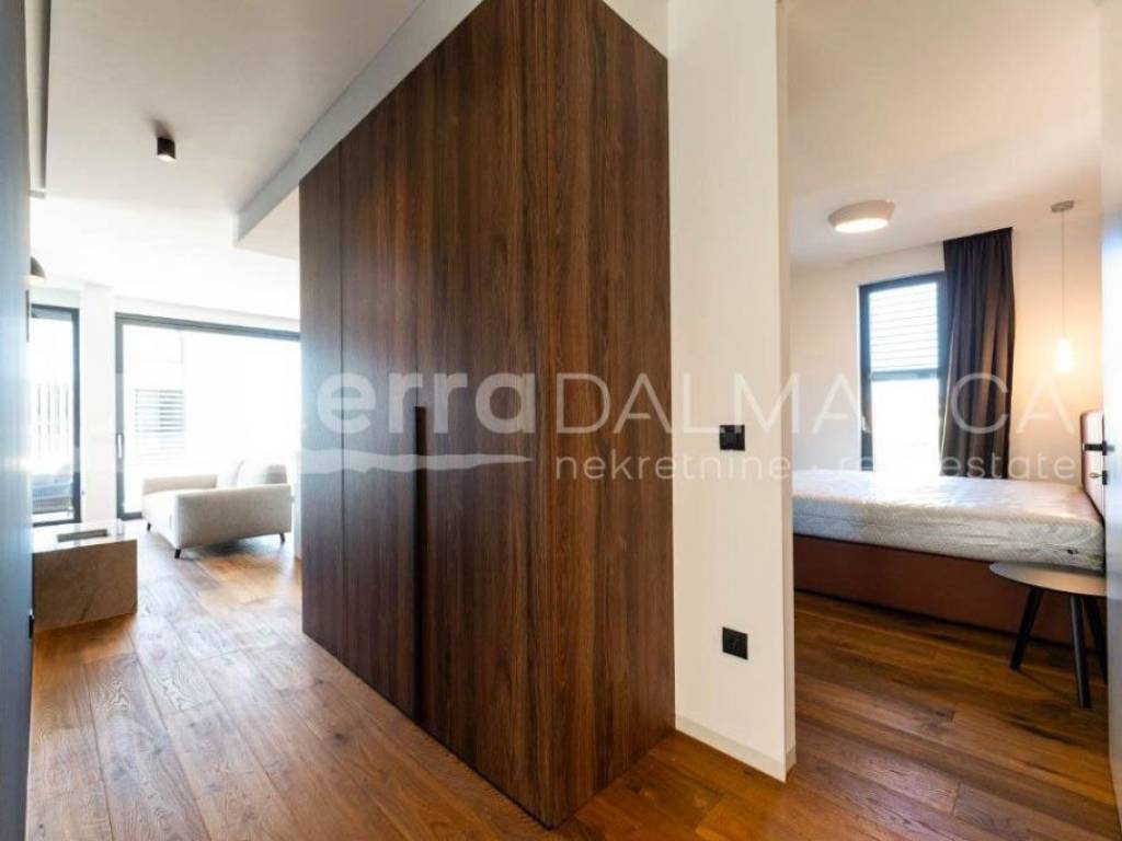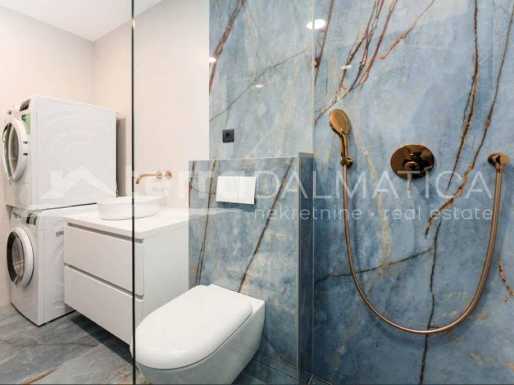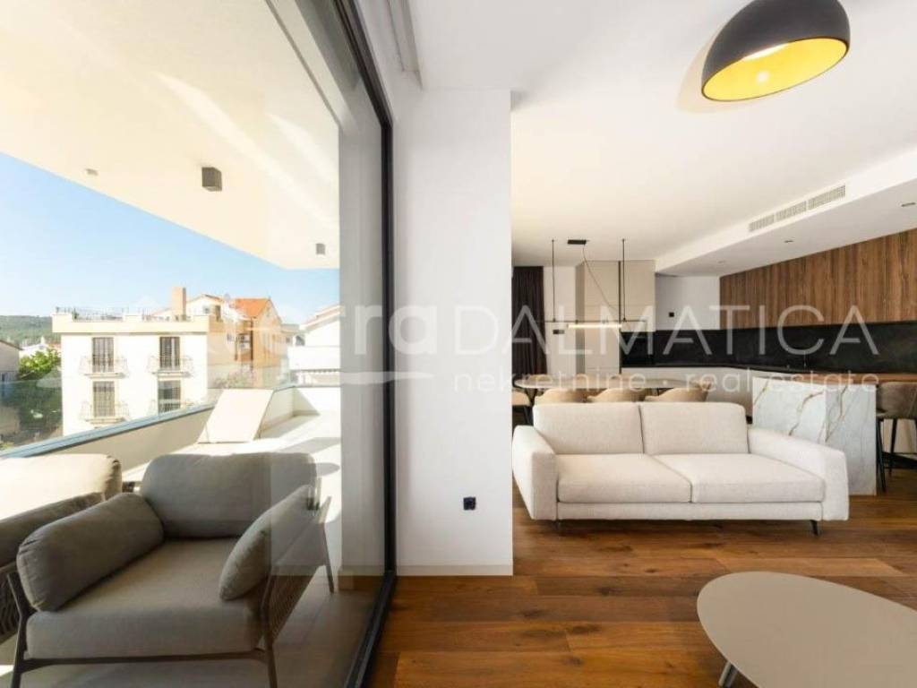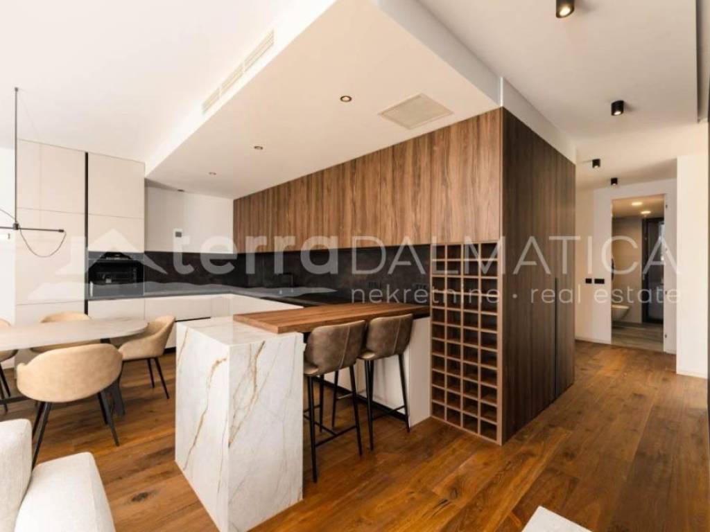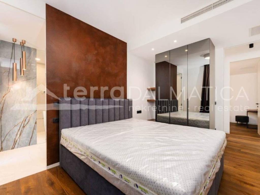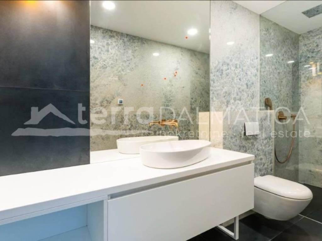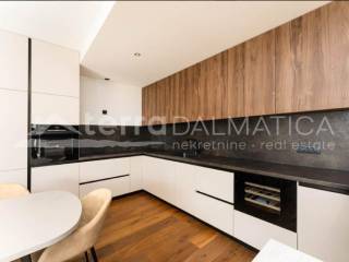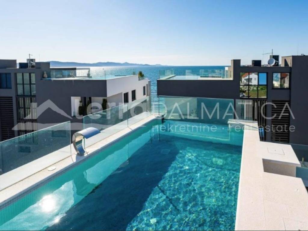 A luxury apartment with a pool on the roof terrace is for sale in Sukošan. This exclusive apartment is located in a modern building, which is located in the second row from the sea, providing a perfect combination of privacy and proximity to the coast. The apartment is located on the second, last floor of the building. Access to the apartment is provided by an internal staircase and a private elevator, which is reserved only for this apartment, which further contributes to the feeling of luxury and exclusivity. The apartment covers a living area of 106 m², and consists of a spacious kitchen, dining room and open-concept living room. This space opens onto a 23.87 m² loggia, perfect for relaxing and enjoying the Mediterranean lifestyle. The apartment also includes three comfortable bedrooms, two modern bathrooms, one of which belongs to the master bedroom, and a functional hallway that connects all parts of the apartment. From the living area, a staircase and a private elevator lead to an impressive roof terrace of 135 m². This terrace offers a spectacular panoramic view of the sea and the surrounding area, and is equipped with a swimming pool, sundeck and engine room, which makes it an ideal place for sunbathing, relaxing and enjoying beautiful sunsets. The apartment also has a storage room and one garage space on the ground floor of the building, as well as an outdoor parking area of 66 m², which further increases the functionality and practicality of this luxury apartment. The apartment is sold fully furnished and equipped with high-quality furniture, and the kitchen and other areas are equipped with modern appliances and high-quality materials, which ensures maximum comfort and elegance. Sukošan is known for its marina, ideal for boating enthusiasts, and offers numerous opportunities for recreation and relaxation. This location provides a perfect place to live and relax, just a few minutes' walk from the beach and all necessary facilities. This exclusive apartment offers a combination of luxury, elegance and a beautiful sea view. It is ideal for those looking for the perfect place to relax and enjoy the Mediterranean lifestyle.