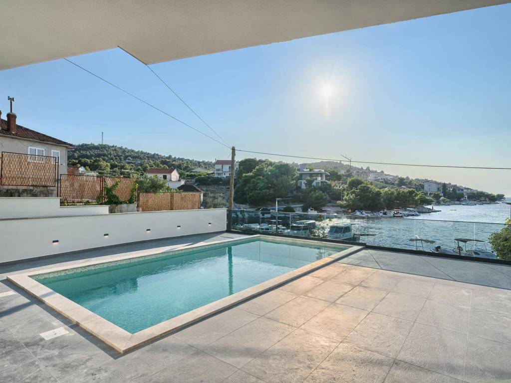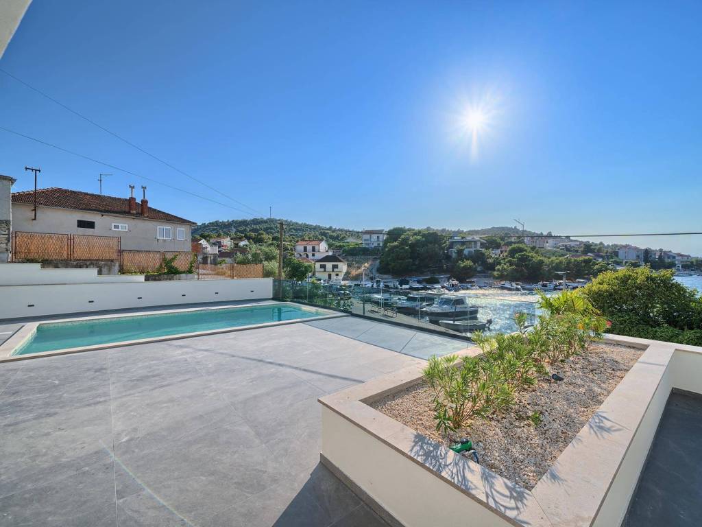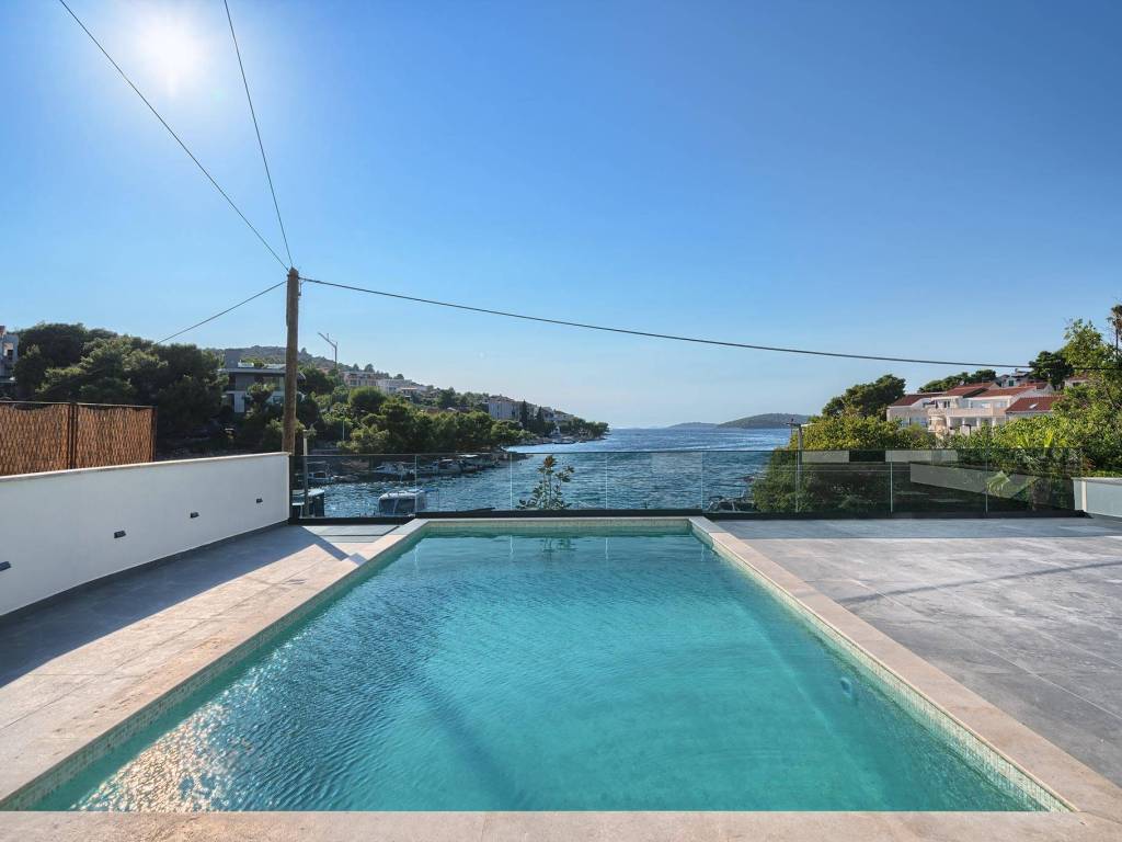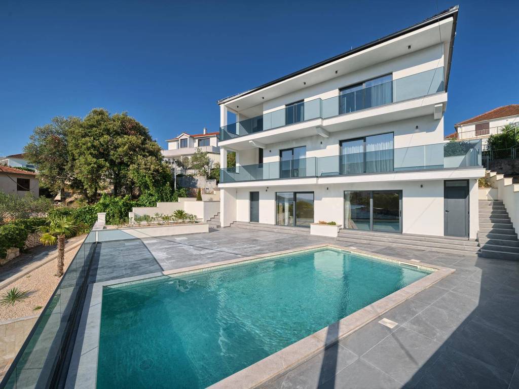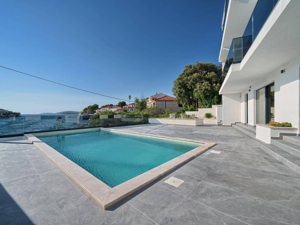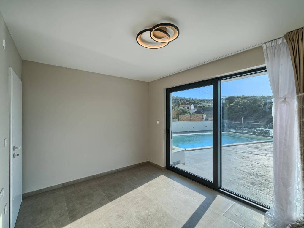 Not far from Rogoznica, there is a villa that is simply breathtaking with its elegance, thoughtful design and execution. Surrounded by Mediterranean greenery, the scent of pine trees and the proximity of the crystal clear sea, this villa represents the perfect combination of luxury, comfort and nature - the ideal choice for those looking for more than just a home. The villa is spread over three floors - ground floor, first and second floor - and offers everything you need for a comfortable and carefree stay. The ground floor has a storage room, a modern fitness room, an elegant bathroom and a kitchen, dining room and living room that radiate warmth. The ground floor also has a storage room for additional convenience, which is entered from the outside. The living room opens onto a covered terrace of 19 m² - the perfect place for morning coffee, evening gatherings or peaceful sunset watching. In front of the villa is a swimming pool surrounded by a sunbathing area, where summer days turn into a real oasis of relaxation. There is also an auxiliary building, which further increases functionality. The first floor of the villa is equally carefully designed. It contains a kitchen with a dining area, an elegant living room, a guest toilet, a hallway and a staircase leading to the upper floor. On the same floor there is a comfortable bedroom with its own bathroom, while the spacious 27 m² balcony offers a magical view of the surroundings, ideal for relaxing with a glass of wine and the sounds of nature. The second floor reveals even more luxury and privacy - there is a hallway that leads to three spacious bedrooms, each with its own modern bathroom. The bedroom also has a wardrobe. On the first floor there are two balconies, a smaller one and a larger one, which offer a panoramic view and create the perfect setting for evening enjoyment under the Dalmatian sky. The villa was designed with a special focus on top-notch craftsmanship - the highest quality materials were used, while every interior detail was carefully coordinated so that the space exudes warmth, elegance and refined luxury. The design is functional, but also aesthetically impressive - designed to provide maximum comfort, but also to exude style and personality. Located in a place known for its peace, untouched nature and traditional Dalmatian charm, the villa offers a rare opportunity to escape from everyday life. Rogoznica is a picturesque tourist resort with a rich gastronomic and cultural offer, known for its luxurious marina, promenades and crystal clear sea. This villa is not just a house - it is a home, an investment, a refuge and a summer story waiting to be told.