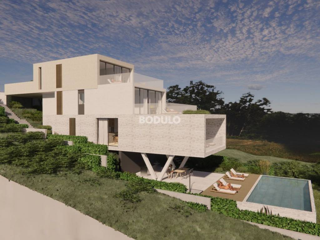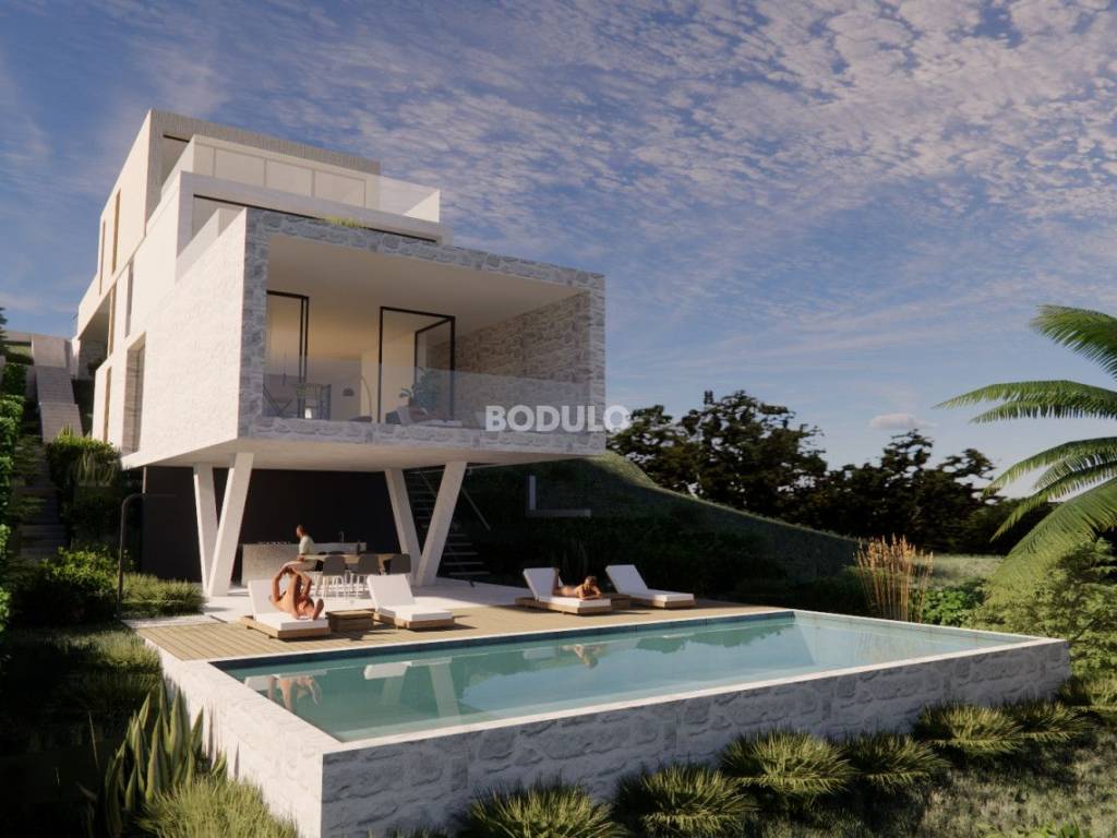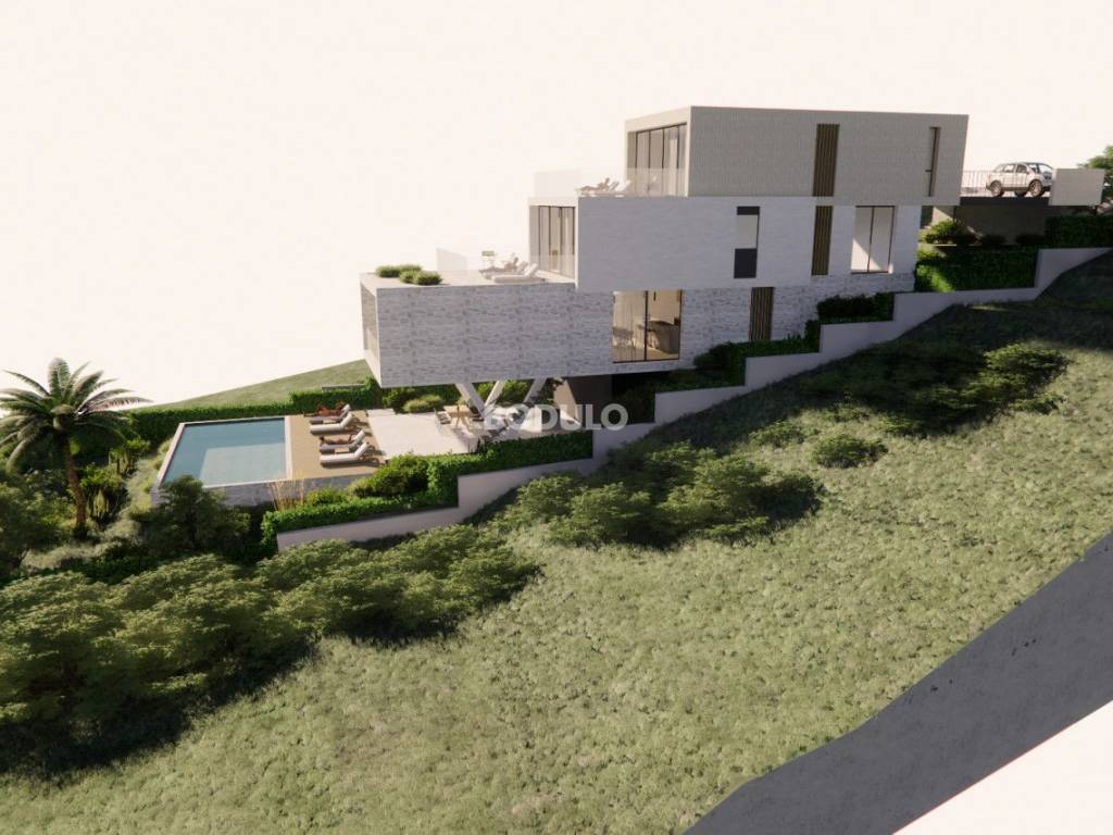 In the place Kali on the island of Ugljan for sale is a building plot of 639 m2. It is located in an excellent location, only 250 meters from the sea and not even a kilometer from the ferry port in Preko. The land boasts a beautiful open view of the sea, the island of Ošljak and the city of Zadar and its surroundings. It is rectangular in shape, 13 m wide in the front part, while it expands to 17 meters towards the end. It is about 43 m long. This land has a valid and legally binding building permit for the construction of a family house with one residential unit, and the price of the land includes the project documentation, building permit fees, as well as communal and water contributions. The future owner of the land can, if necessary, adapt the project to his wishes and ambitions. It is planned to build a house on four floors, considering the configuration of the terrain. On the lowest floor, the construction of a covered terrace of 20 m2 and a swimming pool of 36 m2 is planned, on the floor above there will be a storage room, a toilet, and a spacious kitchen with dining room and living room with access to a covered terrace with a view of the sea, then on the next floor three bedrooms, each with a bathroom, two of which have access to a terrace of 26 m2 with a beautiful view of the sea, as well as a storage room and a laundry room, and on the top floor a spacious garage and a fitness room.