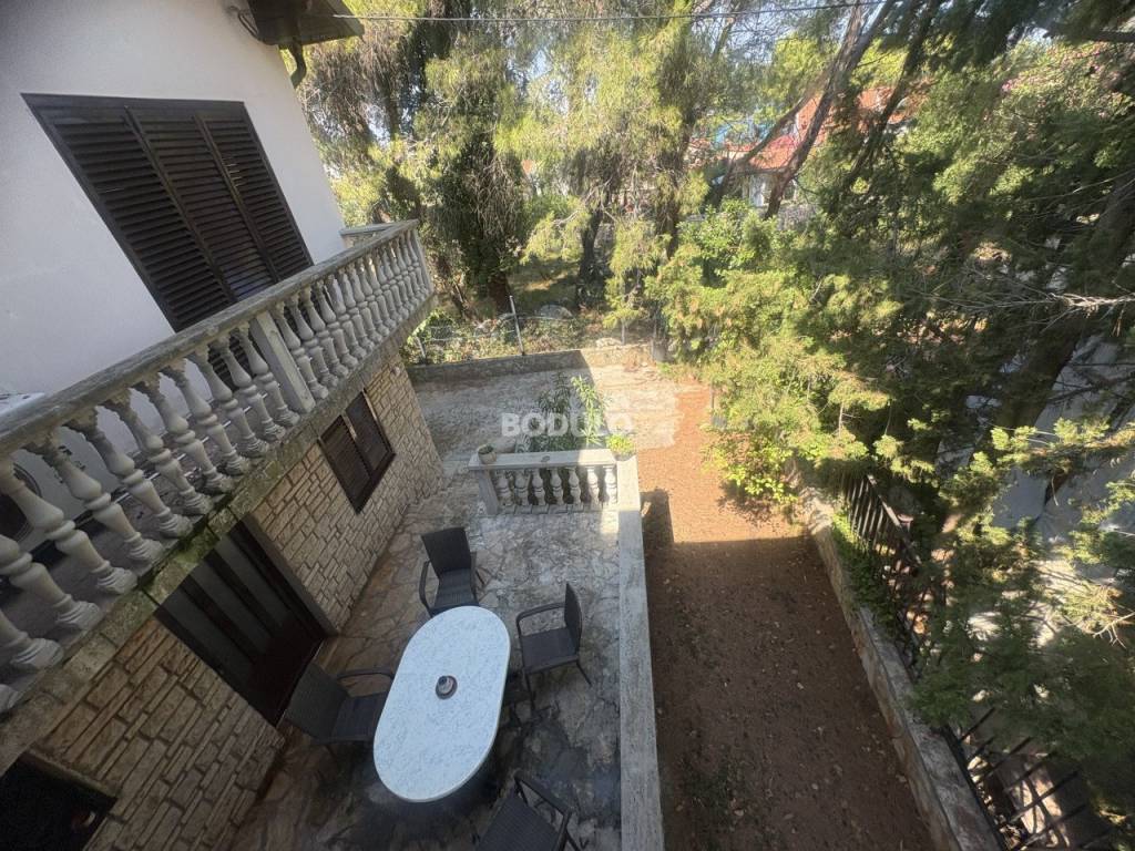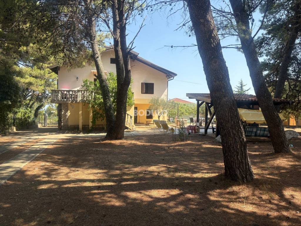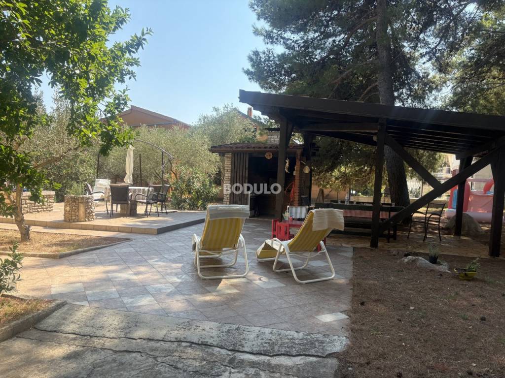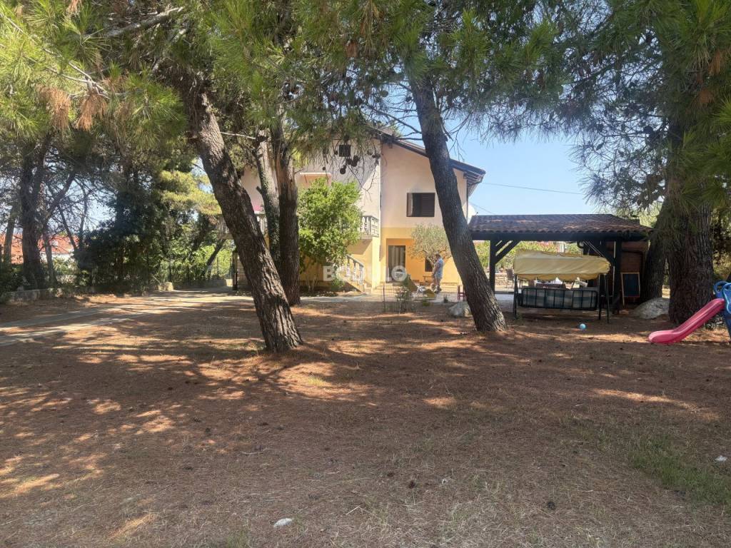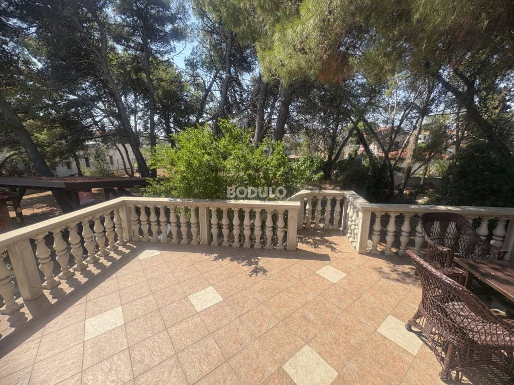 InUgljan, in the beautiful hamlet of Čeprljanda, just about 80 meters from the sea, there is a house that at first glance offers a sense of peace, spaciousness, and a true Mediterranean way of life. Surrounded by a large garden, this property is situated on a plot with a total area of 1,405 m,and extends over a basement, ground floor, and first floor, providing ample space for family living, guests, andrelaxation. The ground floor features a kitchen, a large bedroom, two additional rooms, a bathroom, a separate guest toilet, a storage room, and a terrace oriented to the northeast, ideal for peaceful mornings and pleasant shade. From the house, there is direct access to the yard, which opens on the southern and southwestern sides into a spacious, shaded garden surrounded by tall pine trees. Here, the scents of the sea and pine create an authentic Mediterranean atmosphere, enhanced by a covered terrace, an outdoor barbecue, a childrens play area, sunbathing space, and plenty of room for outdoor living throughout the day. In addition to the municipal water supply, the house also has a cistern for water storage, and a garage is located at the far end of the yard, further emphasizing the functionality and self-sufficiency of this property. The spacious terraces invite you to enjoy warm evenings, while the outdoor barbecue and covered area with a large table provide the perfect setting for family gatherings, dining, and relaxing in the shade, as well as romantic evenings under the starry sky. The first floor consists of a living room with a fireplace that adds a special charm to the space, an area designated for a kitchen, a bathroom, and two bedrooms, each with its own balcony offering views of the deep blue sea. There is also a large terrace from which you can enjoy views of the garden and the pine treetops, while to the left, through the tree canopy, the sea view opens up. The combination of a stone façade on the ground floor, warm colors, and rich vegetation surrounding the house creates the feeling of a home that is subtly connected with nature, making this property an ideal place for family life, relaxation, or a summer retreat by the sea.