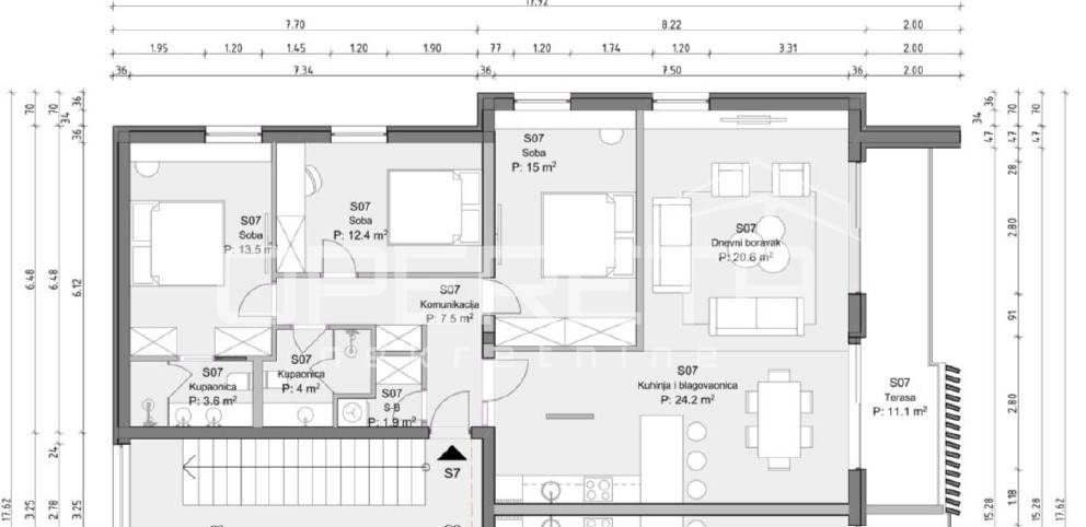 The apartment consists of: - Three comfortable bedrooms - Two bathrooms - Living room - Kitchen with dining room - Terrace with sea view