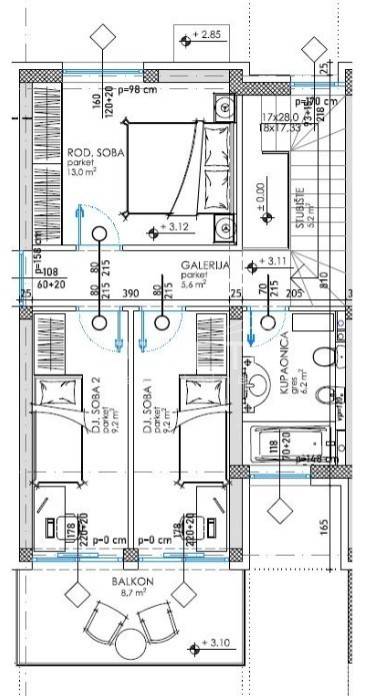 Na katu se nalaze ukupno 3 spavaće sobe i to jedna od 13 m2 i dvije od 9,2 m2, kao i balkon od 8,4 m2, kupaonica od 6,2 m2, galerija od 5,6 m2 i stubište od 5,2 m2.