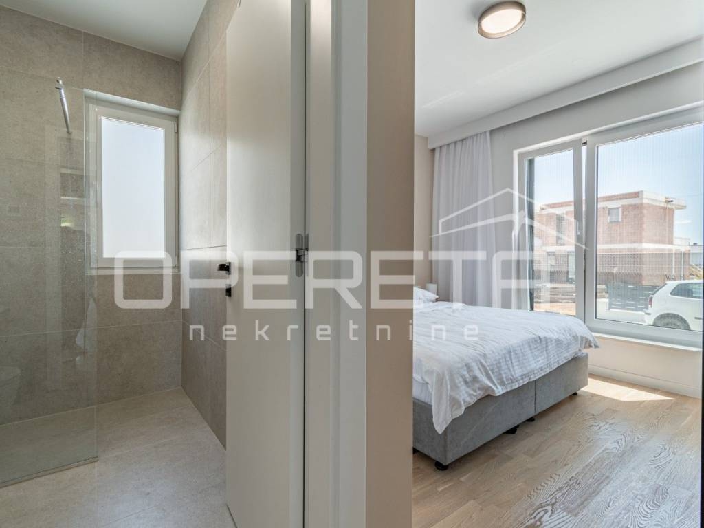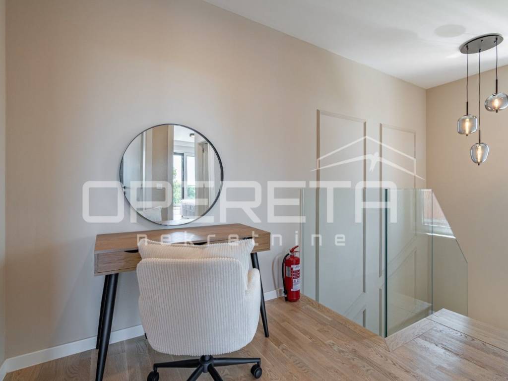 The internal stairs, the tread of which is covered with solid oak wood, lead to the first floor, where there are two bedrooms. Each room has its own bathroom and access to a 10m2 terrace with a beautiful view of the sea.