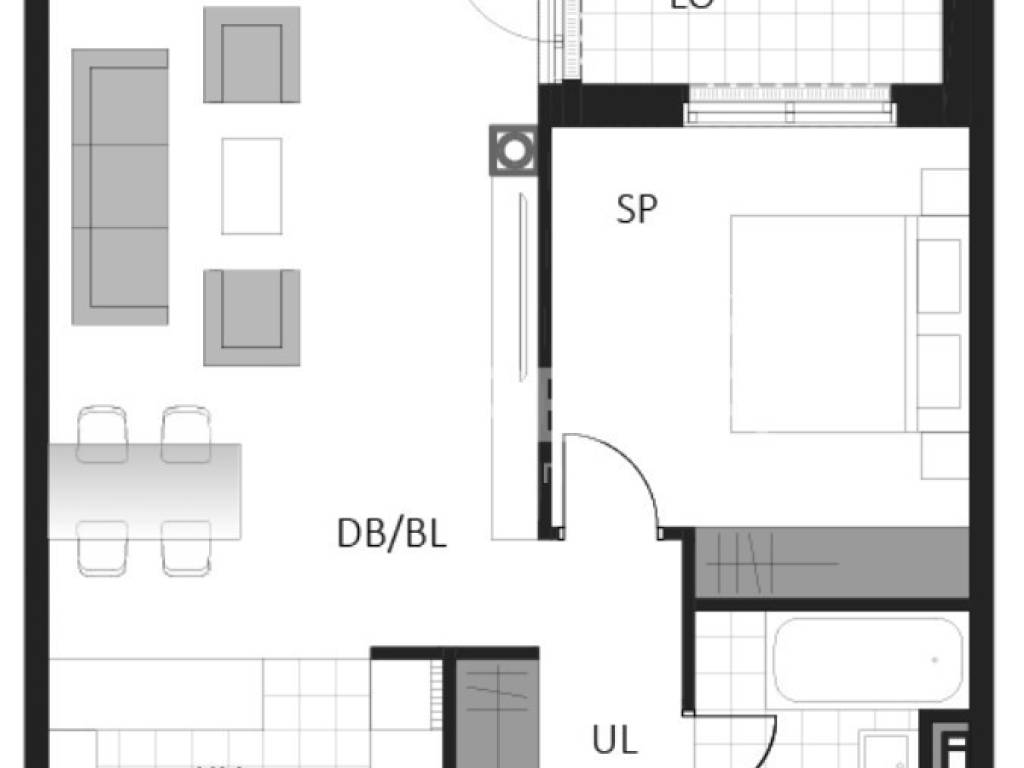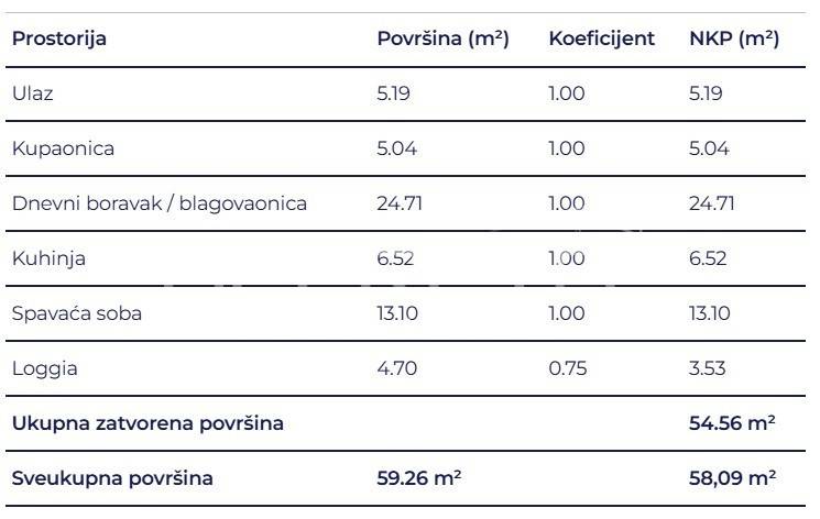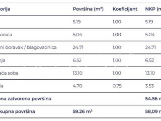 Prostrani dvosobni stan sastoji se od spavaće sobe, kupaonice, hodnika, dnevni boravak s kuhinjom i blagovaonicom te loggie.