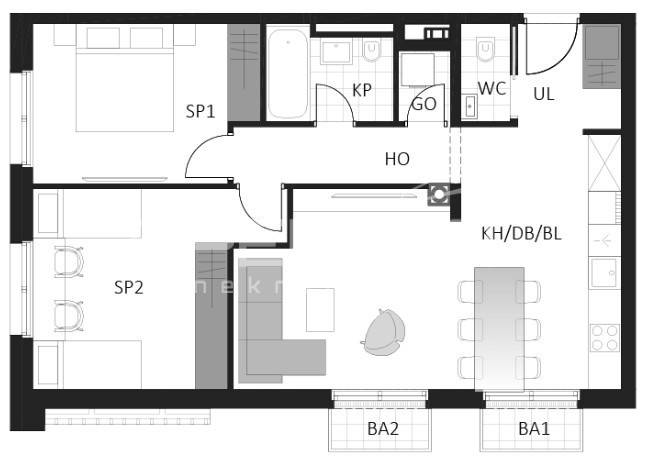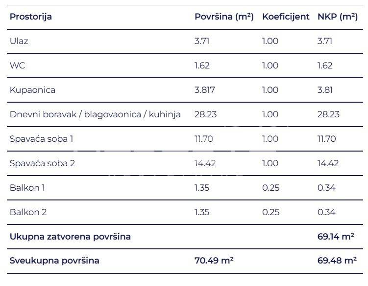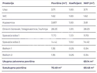 Prostrani dvosobni stan sastoji se od 2 spavaće sobe, kupaonice, wc-a, hodnika, dnevnog boravka s kuhinjom i blagovaonicom i 2 balkona.