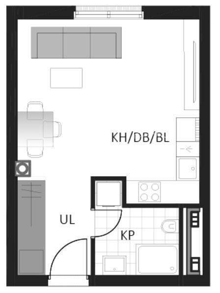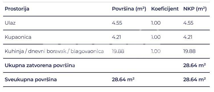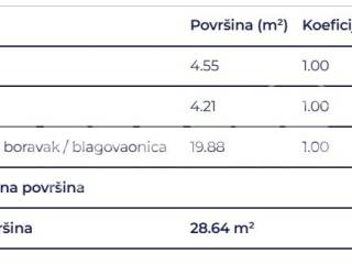 Prostrani jednosobni stan sastoji se od kupaonice, hodnika, dnevnog boravka s kuhinjom i blagovaonicom.