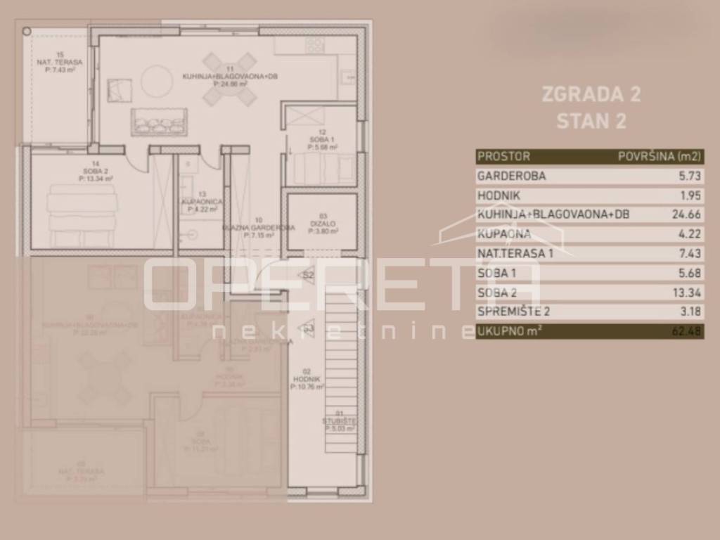 The first-floor apartment has a living area of 63 m and consists of an entrance hall, one large and one smaller bedroom, a modern bathroom, while the central part features a spacious living room with a kitchen and dining area, which opens onto a covered terrace. The apartment includes a storage room on the ground floor and two parking spaces in front of the building.