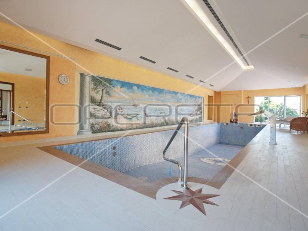 The wellness area extends through several parts of the villa, including a fitness room, a sauna with a bathroom, and a beautiful indoor pool enriched with special details.