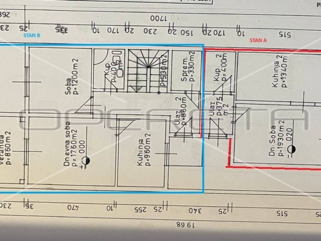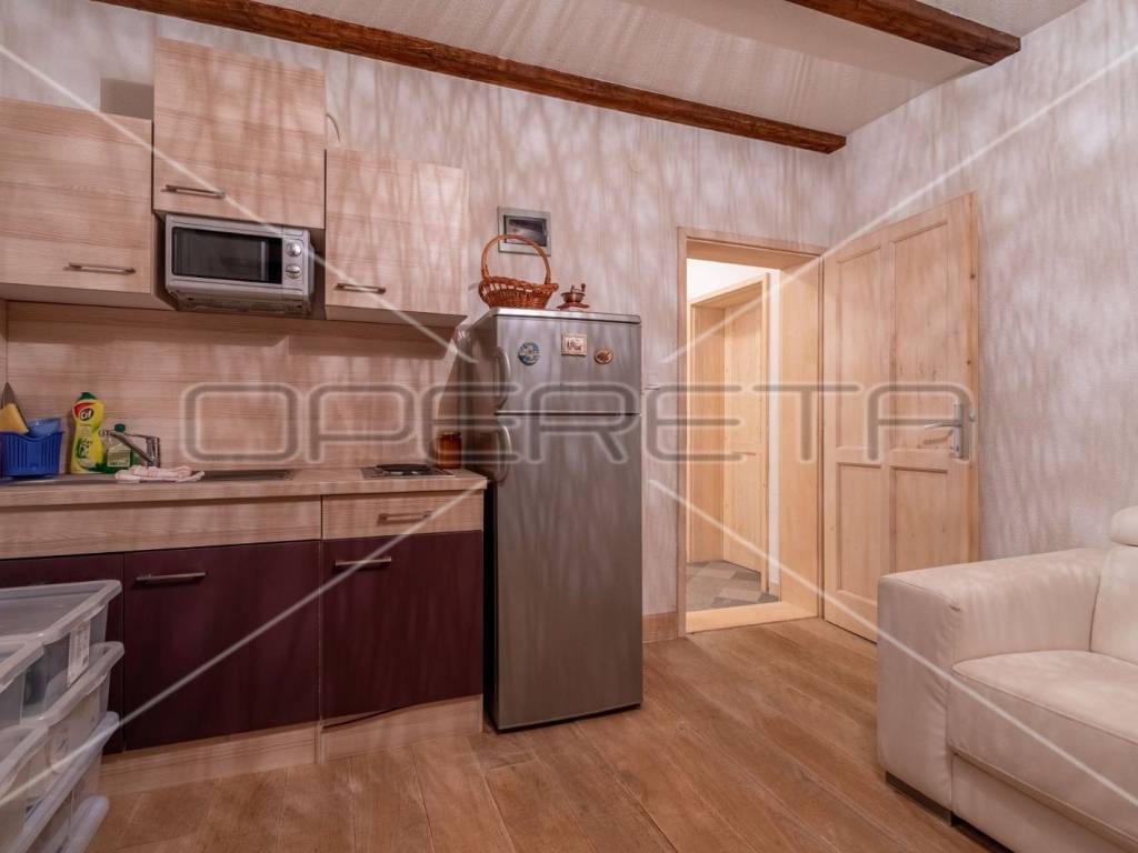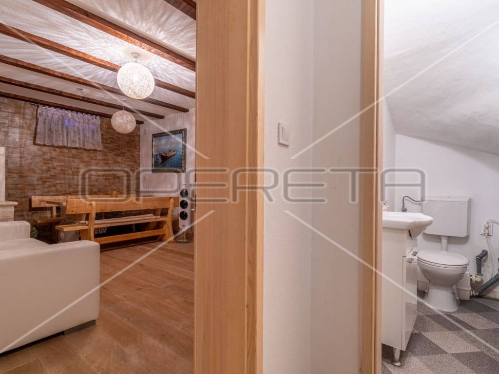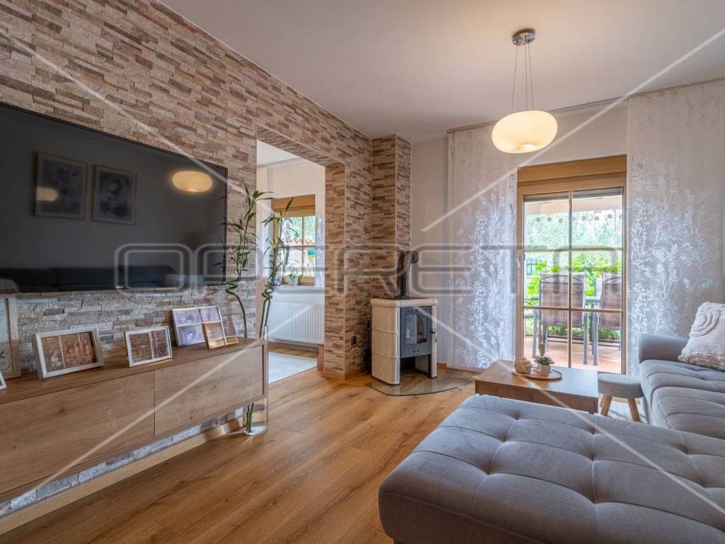 Apartment B - is located on the ground floor and consists of a hallway, bathroom, bedroom, kitchen, living room and a closed veranda with large glass walls with a view and exit to the back yard where, in addition to the covered terrace, there is also a barbecue and a small, green part.