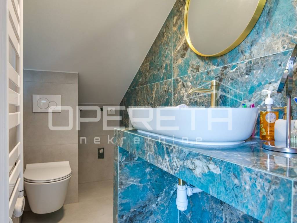 Tu se nalazi i kupaonica s WC-om, a spoj rustikalnog i modernog uređenja stvara dojam topline i elegancije.