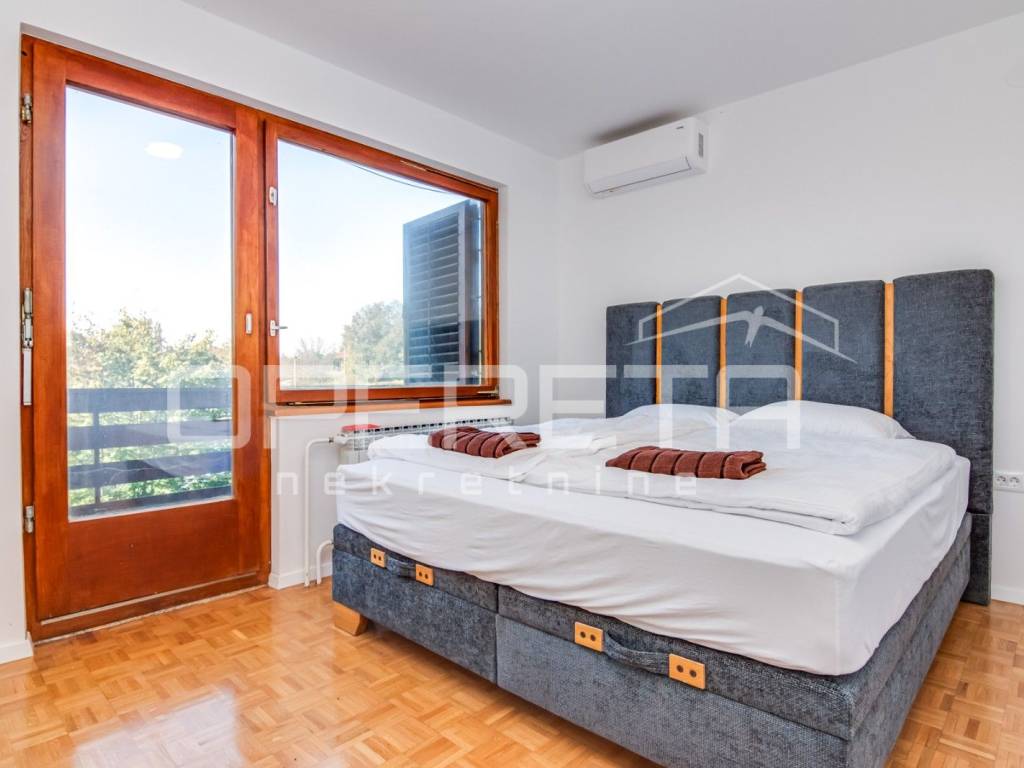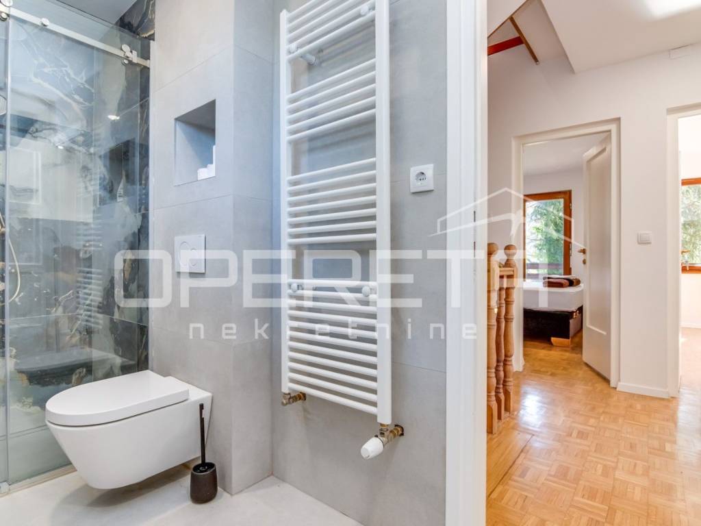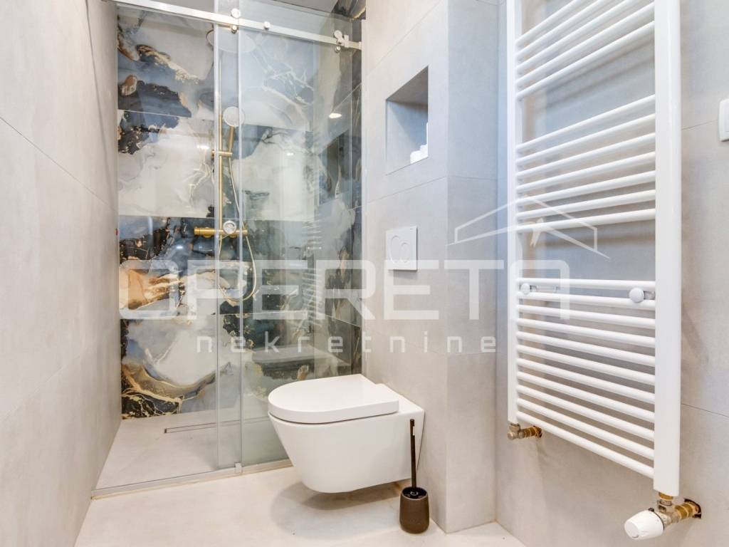Jedna soba sadrži integrirani tuš i odvojeni WC, što prostoru daje dodatnu ekskluzivnost i privatnost.