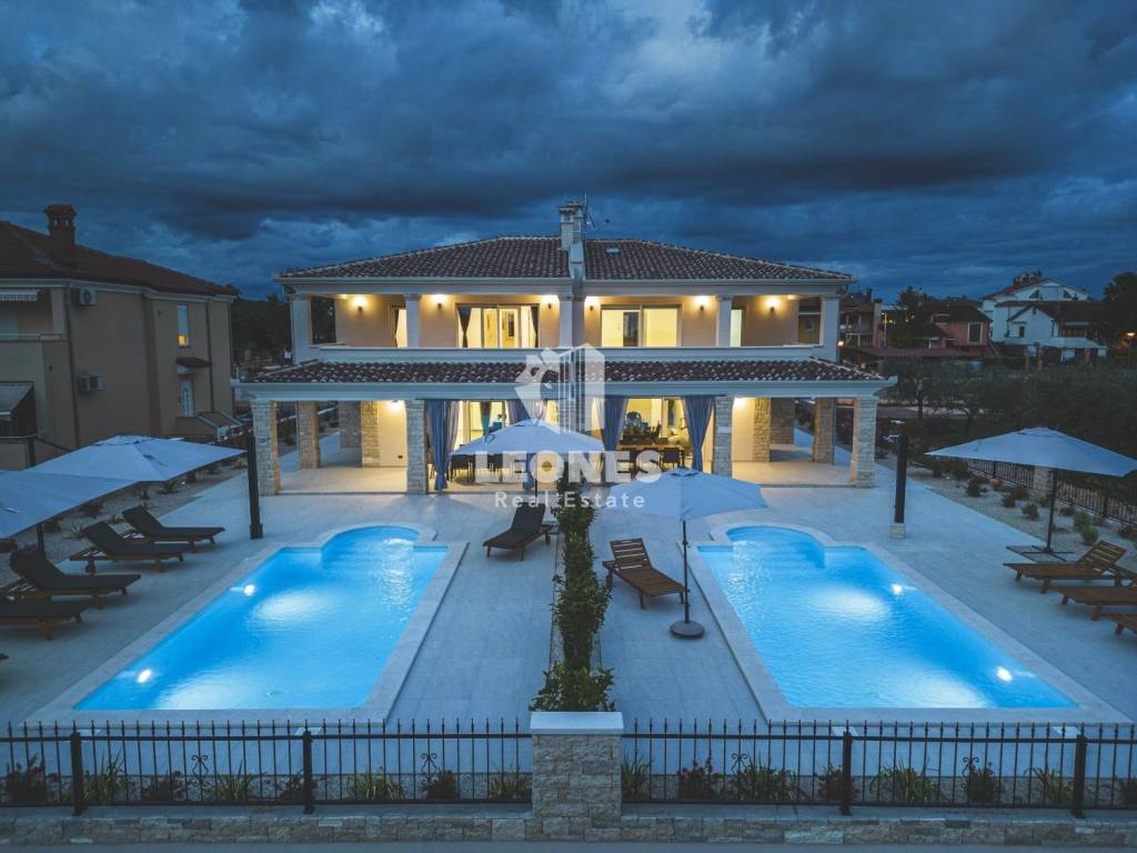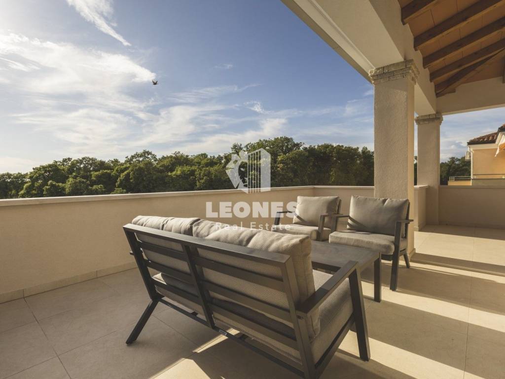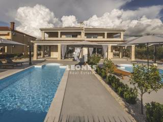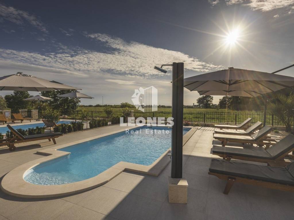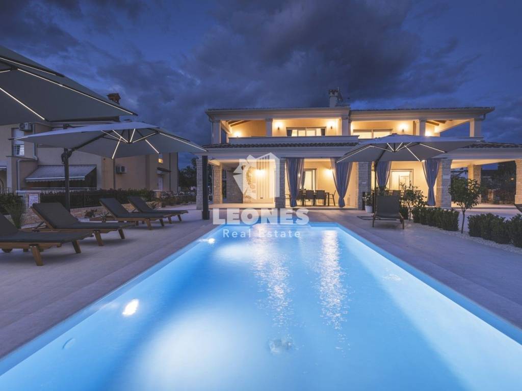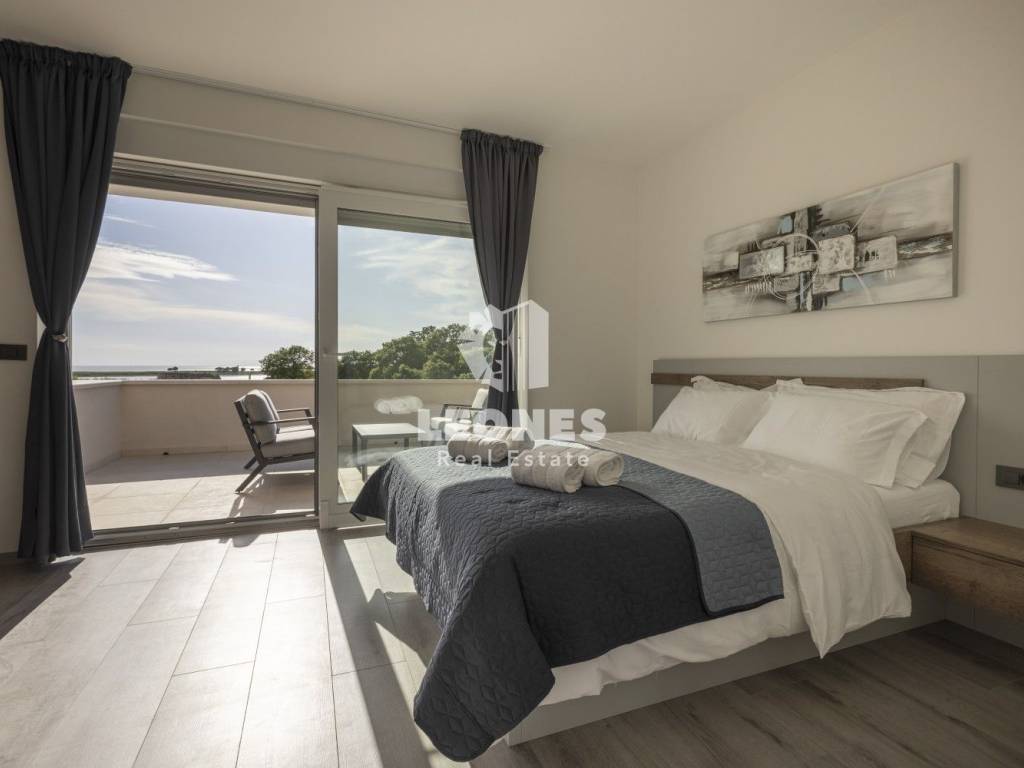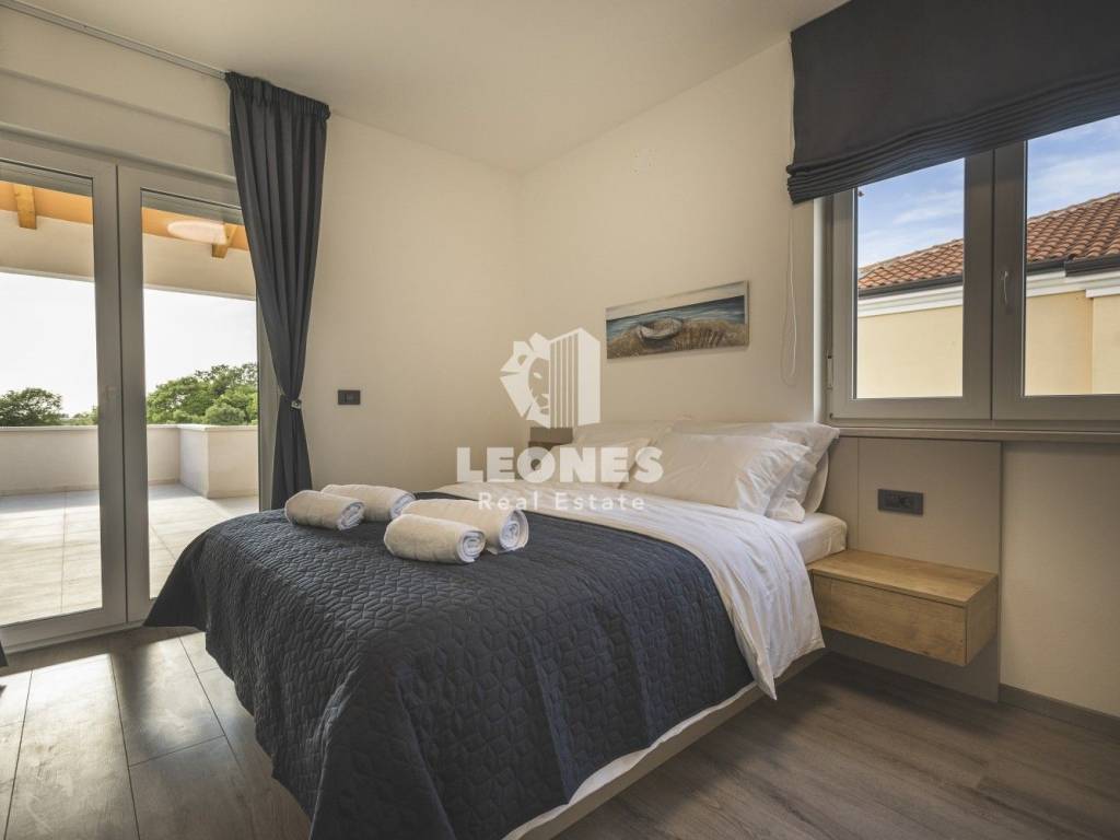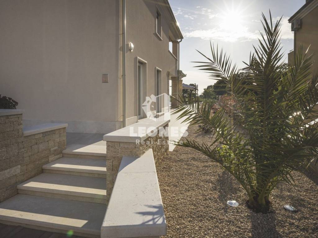 A luxurious semi-detached villa with a view of the sea and a swimming pool in the vicinity of Umag is for sale. The total area of the villa is 210 m2, while the land area is 500 m2. The villa extends over two floors. On the ground floor there is a living room with an open-plan kitchen and dining room, 2 bedrooms, a bathroom and a utility room. The living room has access to a covered terrace and a beautifully landscaped garden with a swimming pool and a sun deck with a view of the sea. Internal wooden stairs lead to the first floor, which consists of 3 bedrooms and 3 bathrooms. Two bedrooms have access to a large covered terrace with a wonderful view of the sea.
