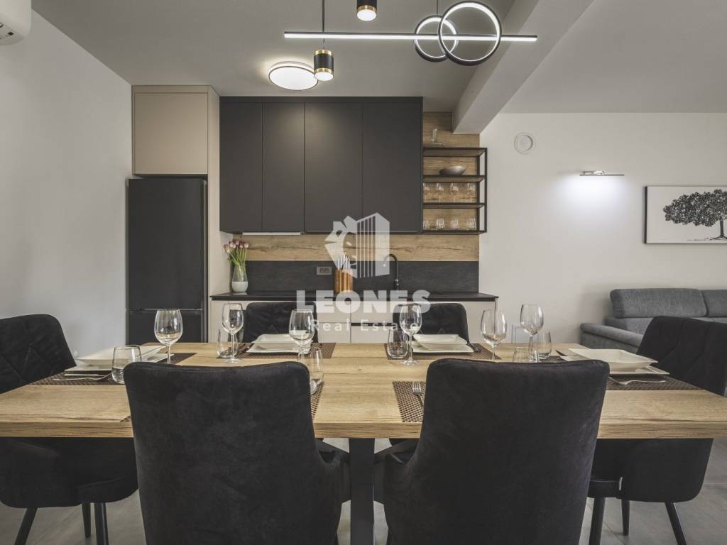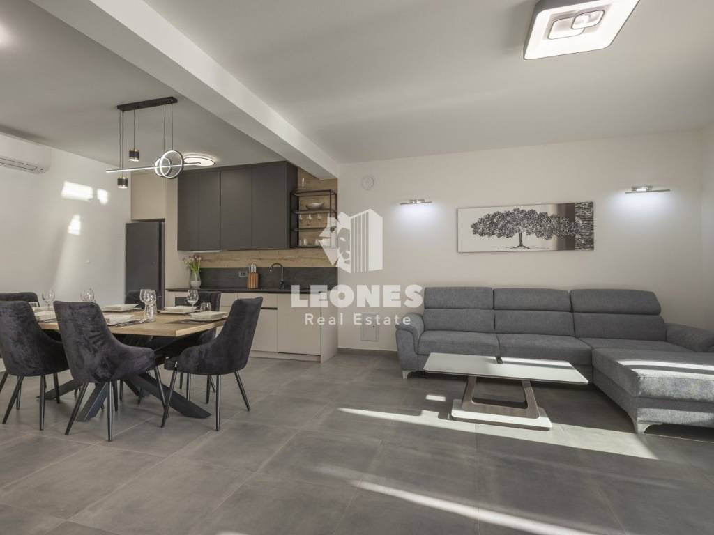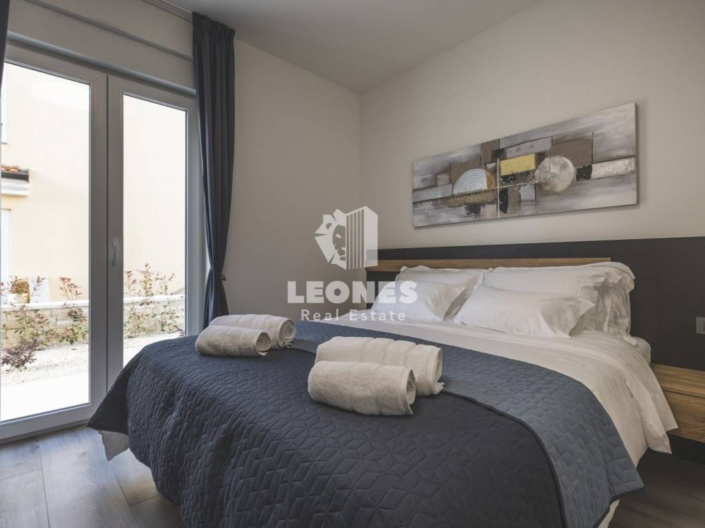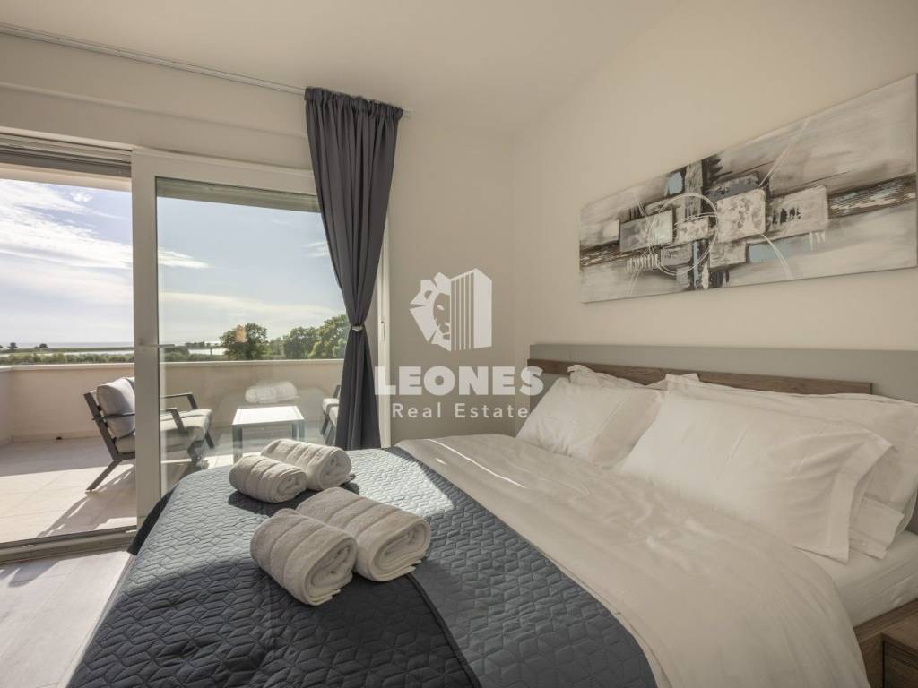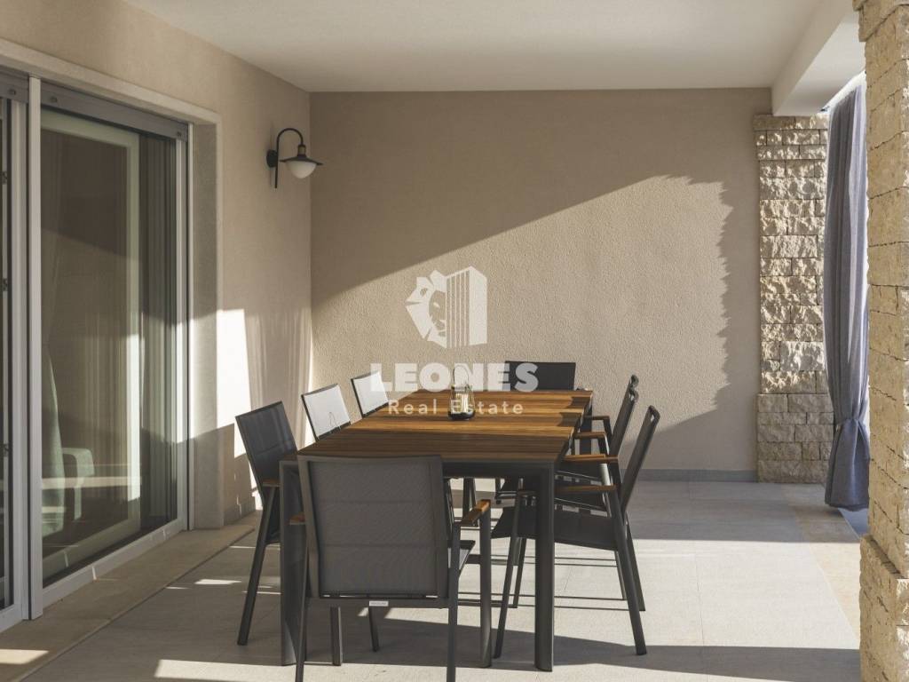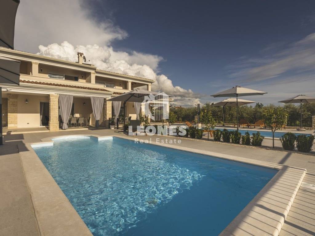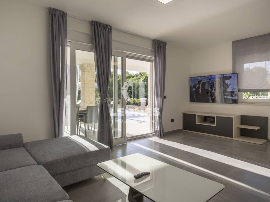 A luxurious semi-detached villa with a view of the sea and a swimming pool in the vicinity of Umag is for sale. The total area of the villa is 210 m2, while the land area is 500 m2. The villa extends over two floors. On the ground floor there is a living room with an open-plan kitchen and dining room, 2 bedrooms, a bathroom and a utility room. The living room has access to a covered terrace and a beautifully landscaped garden with a swimming pool and a sun deck with a view of the sea. Internal wooden stairs lead to the first floor, which consists of 3 bedrooms and 3 bathrooms. Two bedrooms have access to a large covered terrace with a wonderful view of the sea.