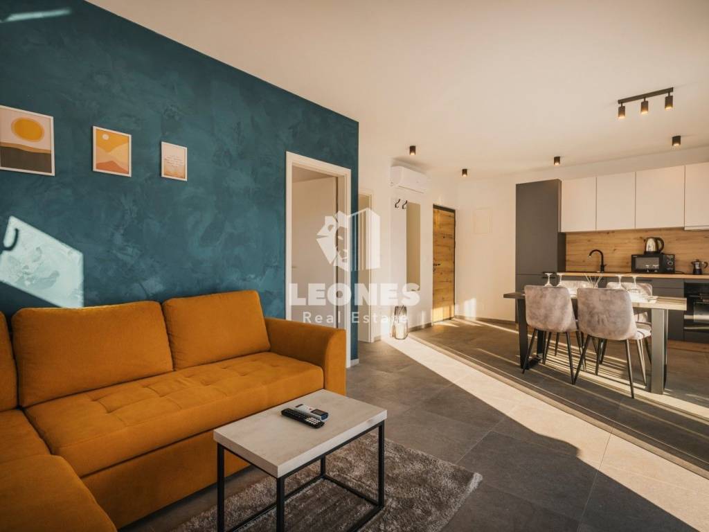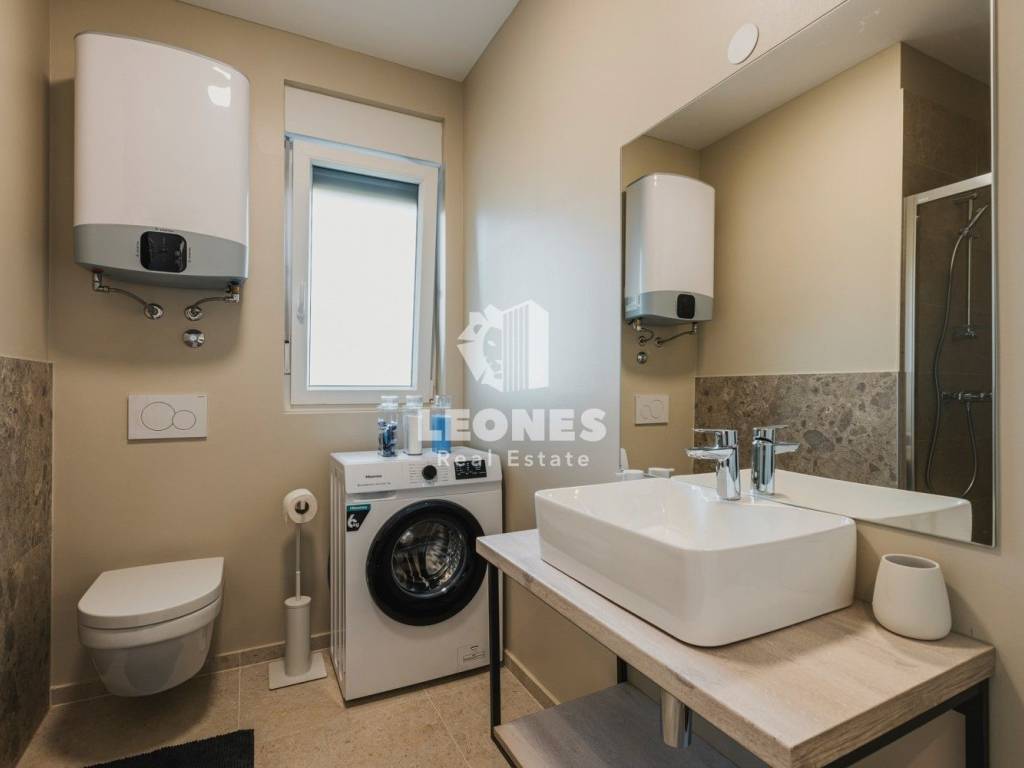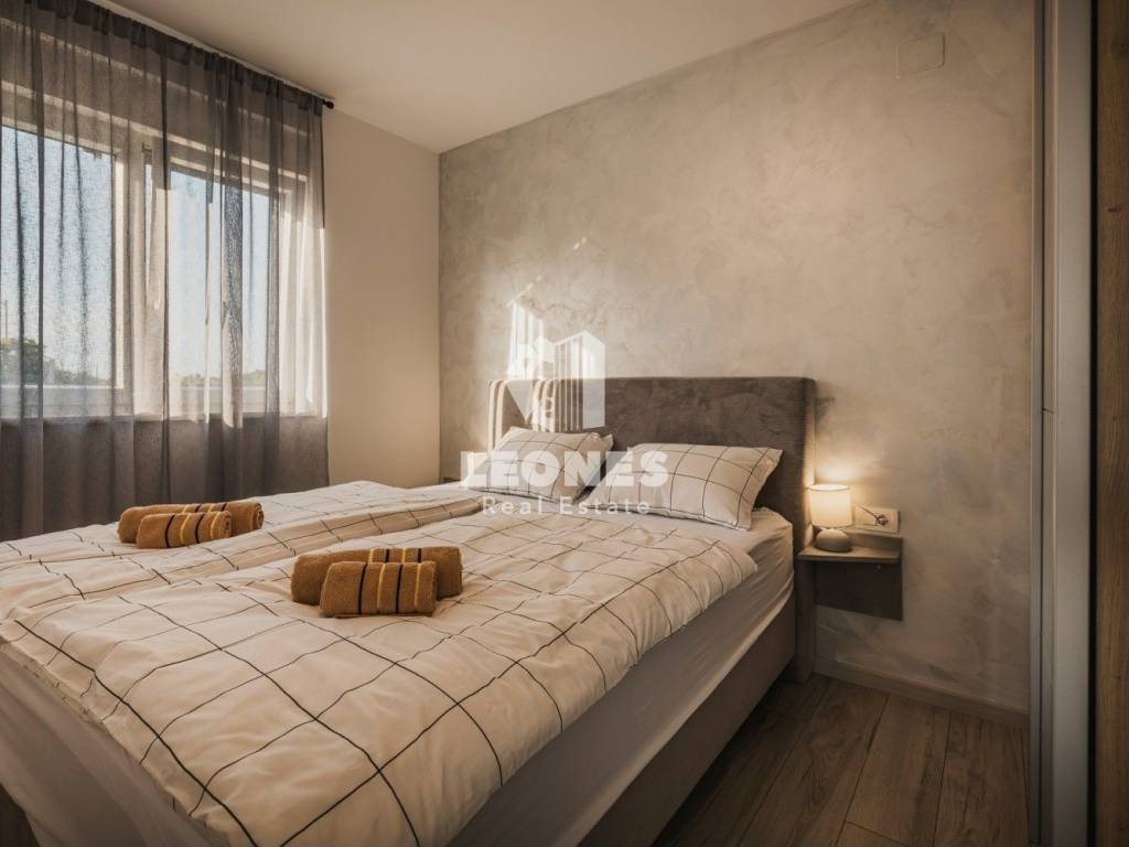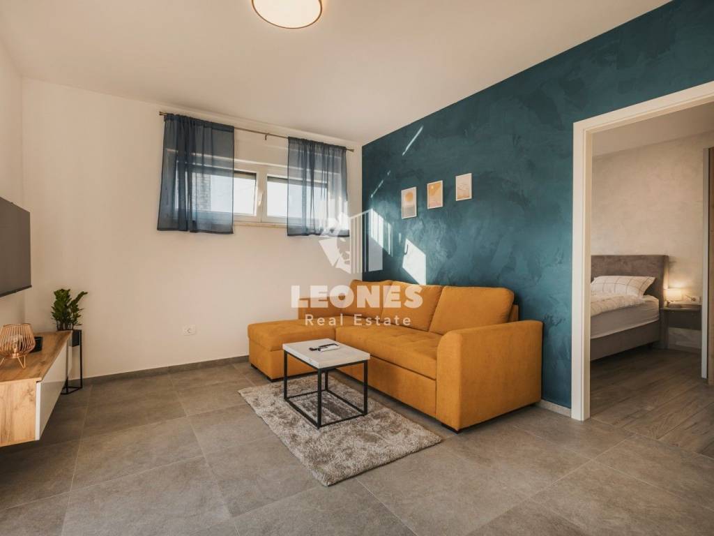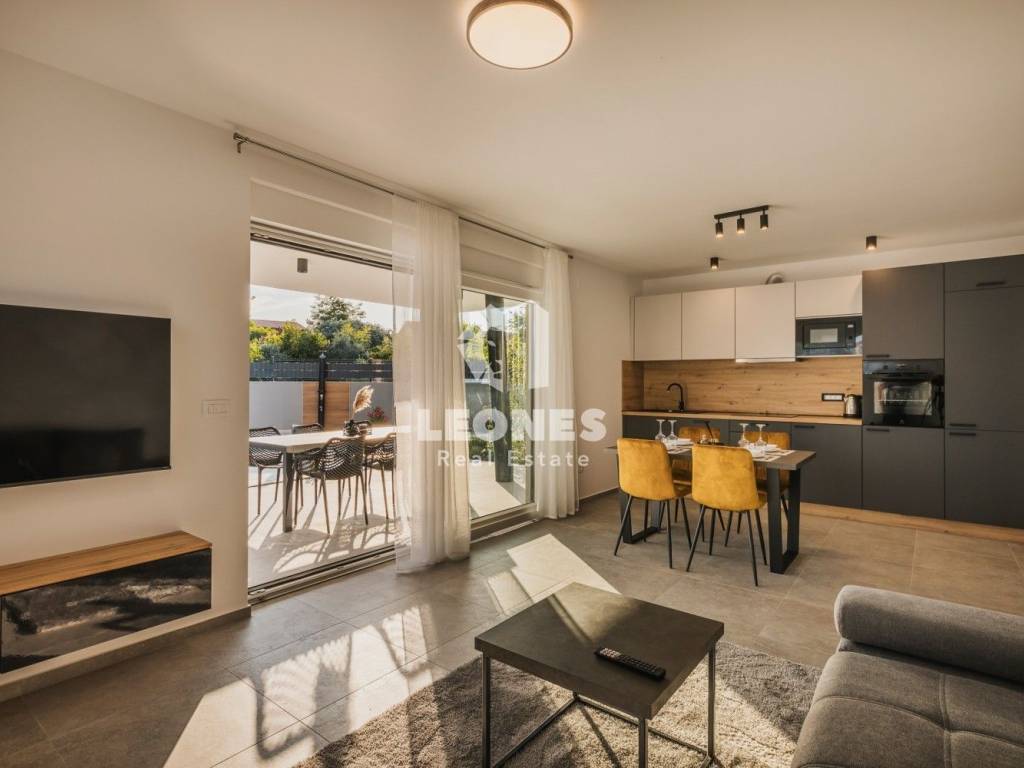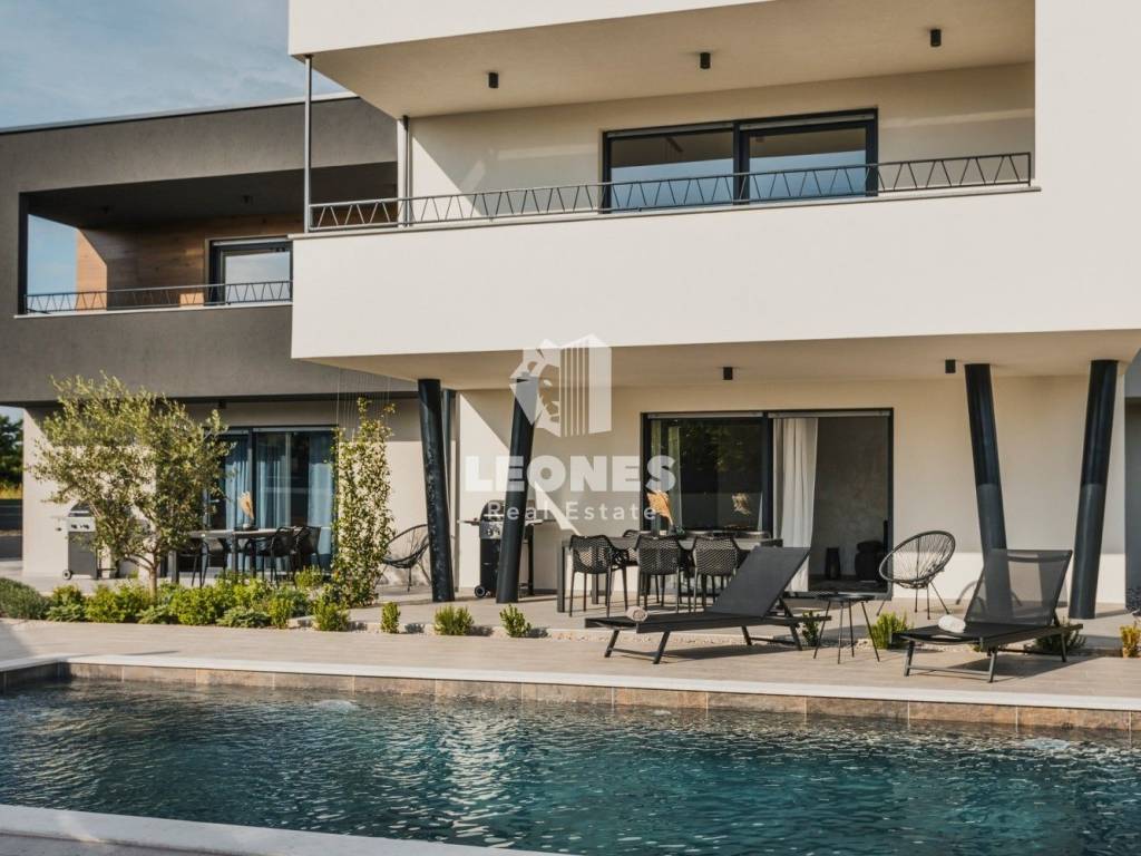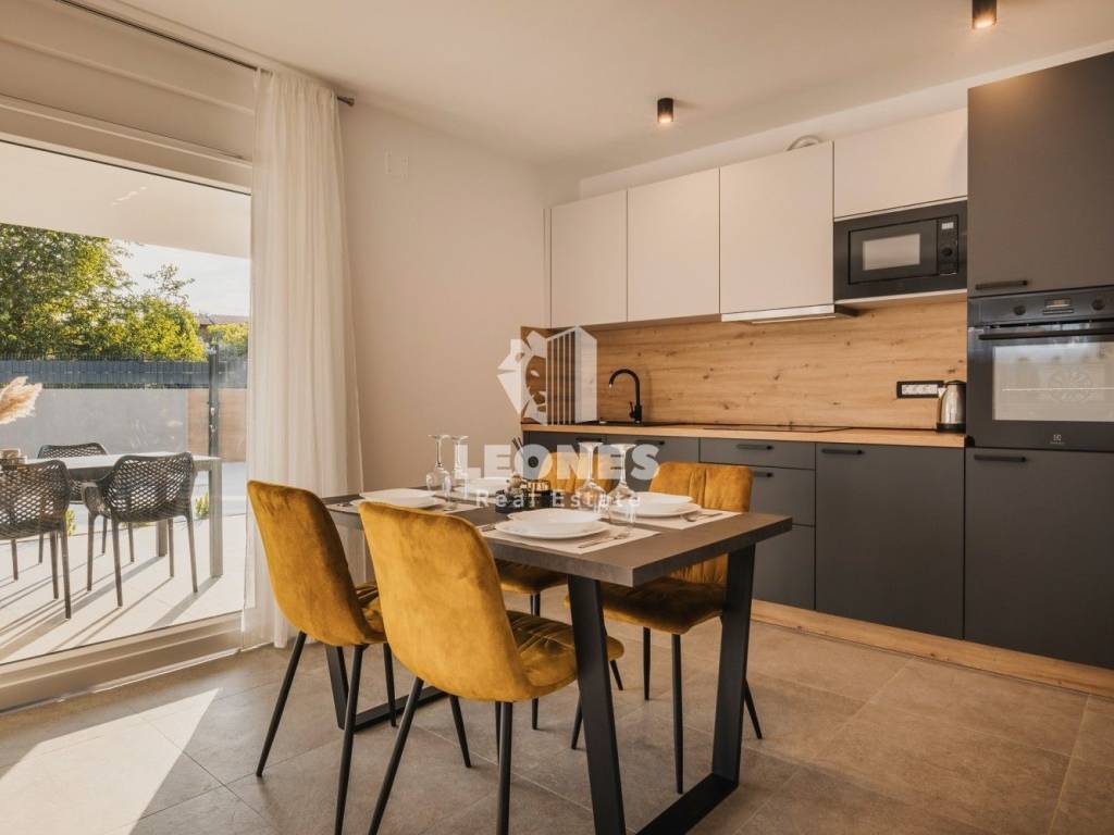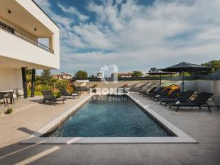 It consists of three apartments, two of which are on the ground floor with access to a beautiful heated pool and a large landscaped yard. The apartments on the ground floor consist of an entrance area, an open space living room with a kitchen and dining room, a bathroom, a spacious bedroom and a terrace with a view of the pool and garden. Apartments on the ground floor have 50 m2 and 65 m2.