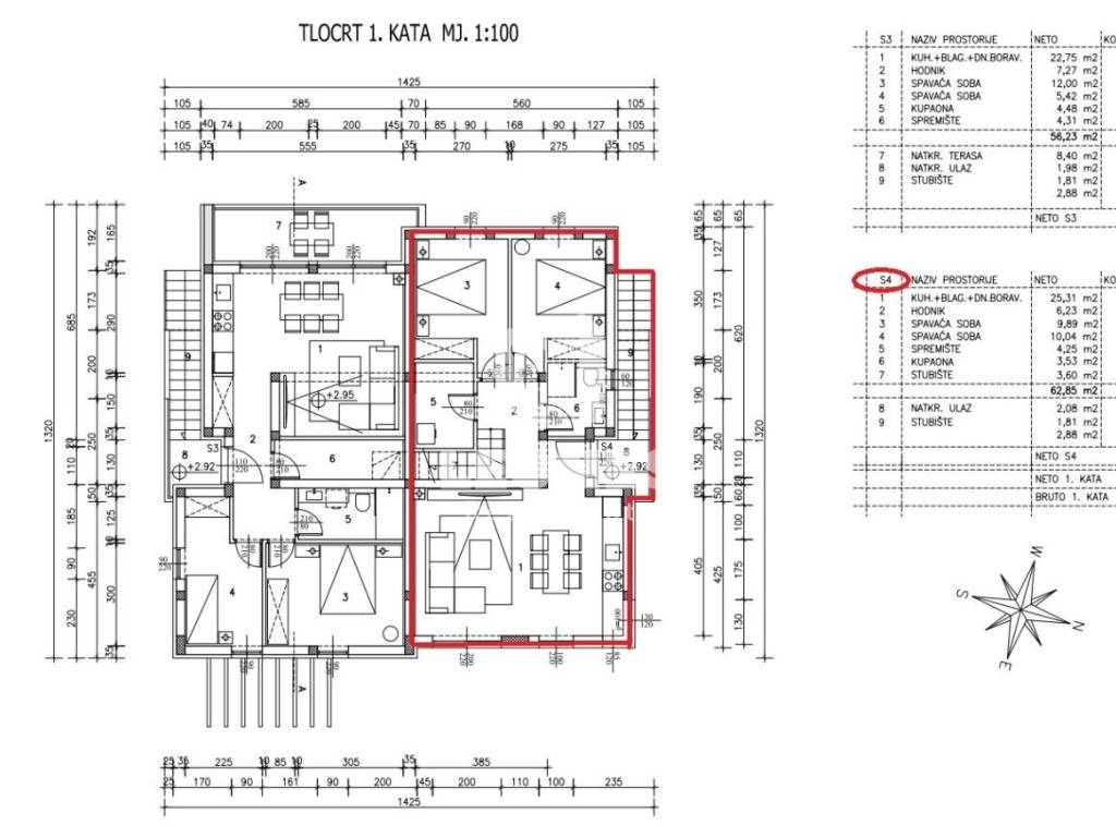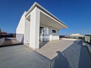 A quality two-story apartment with a large roof terrace is for sale in the vicinity of Umag, Zambratija. The apartment extends through the first and second floor of a building with 4 residential units. The net usable area of the apartment is 98 m2 and consists of a hallway, living room with kitchen and dining room, 3 bedrooms, storage room, 2 bathrooms and a large roof terrace of 55 m2, 20 m2 of which is covered. A summer kitchen and a hydromassage pool for 5 people will be built on the roof terrace. From the terrace there is a view of the sea and nature.