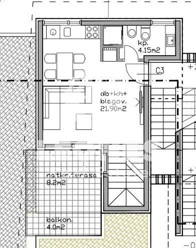 It has 61.20m2 of net usable area + 8.20m2 of covered terrace, 15.70m2 of uncovered terrace and a 3.05m2 loggia, while the remaining area belongs to the storage room (7m2) and the apartment has one covered parking space.