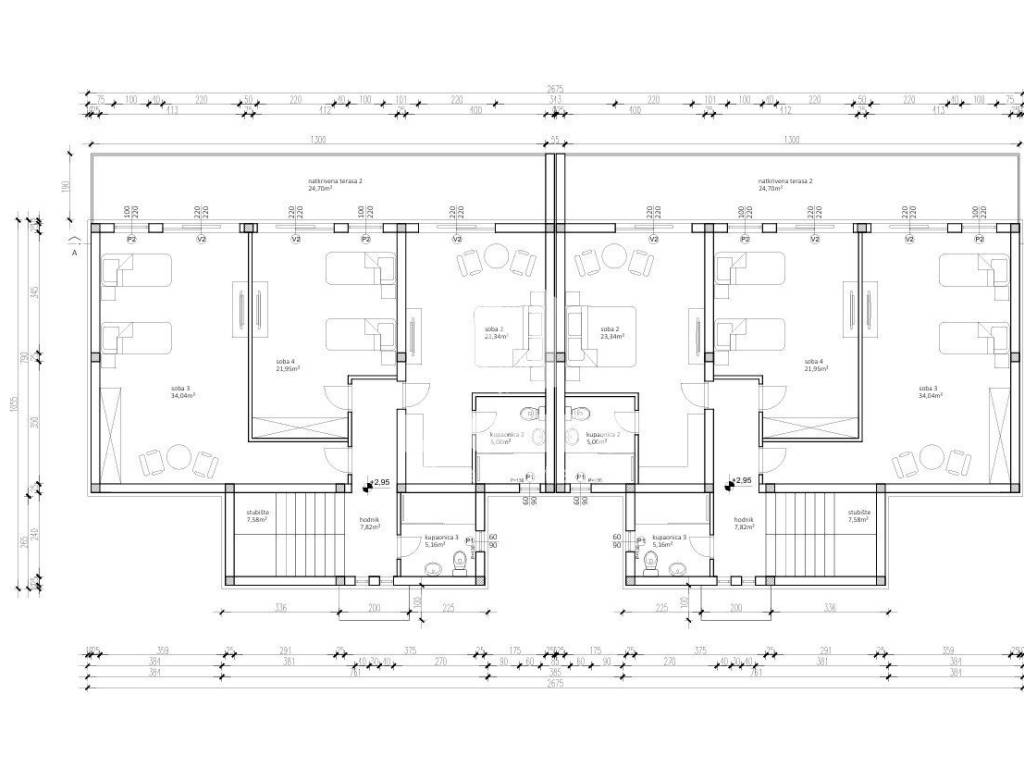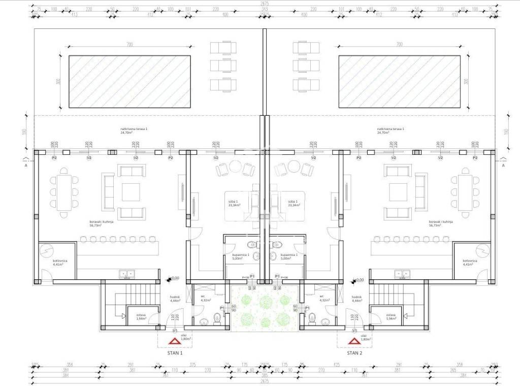 Building plot with sea view with building permit for semi-detached house - Umag area for sale. The plot area is 1185 m2. The project predicts a semi-detached house with a swimming pool. The net usable area of each unit is 232 m2 while the pool area is 21 m2. The plot is located in an exceptional location and is just a few steps from the sea and the beach.