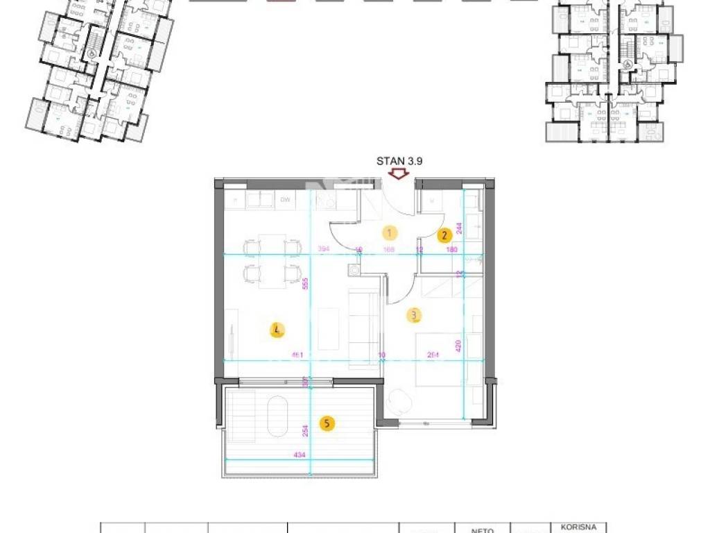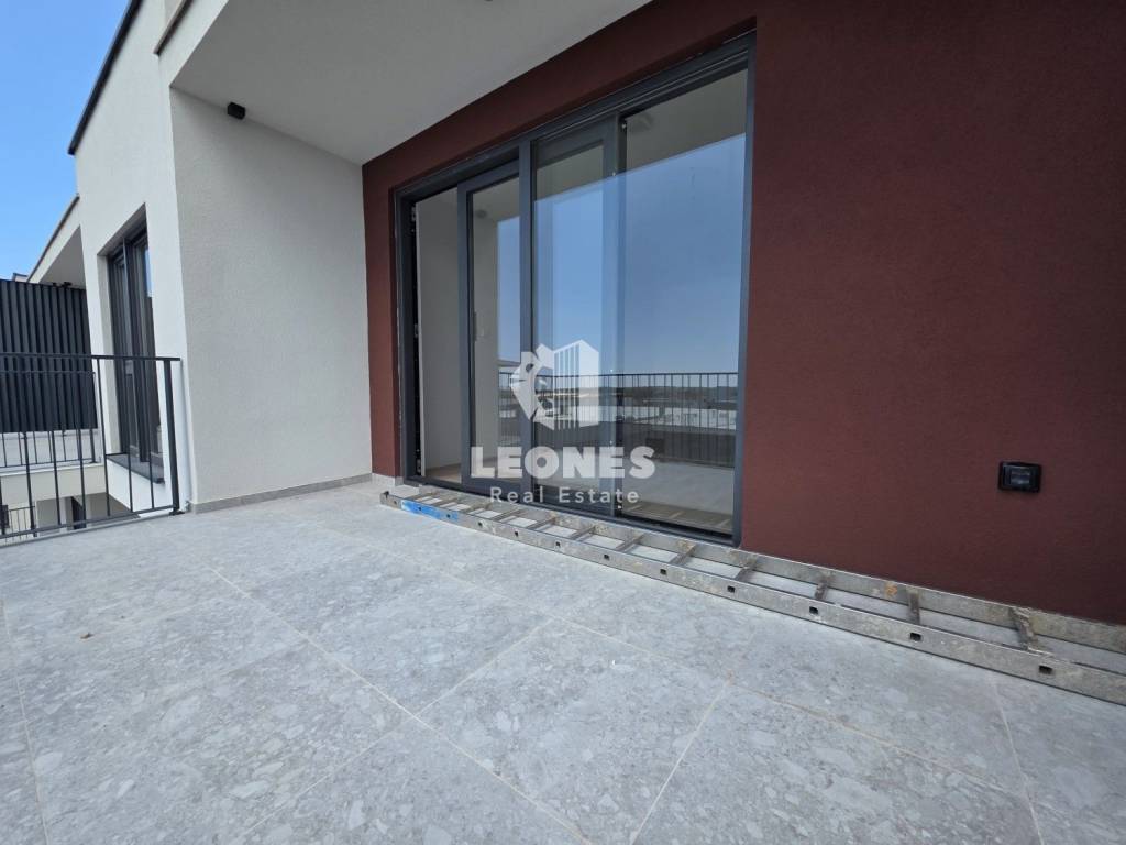 A flat on the third floor of a quality new building in Umag is for sale. The net usable area of the apartment is 53 m2. It consists of a living room and kitchen, bedroom, bathroom and loggia. It has a storage room of 3.48 m2, one garage parking space and one outdoor parking space.