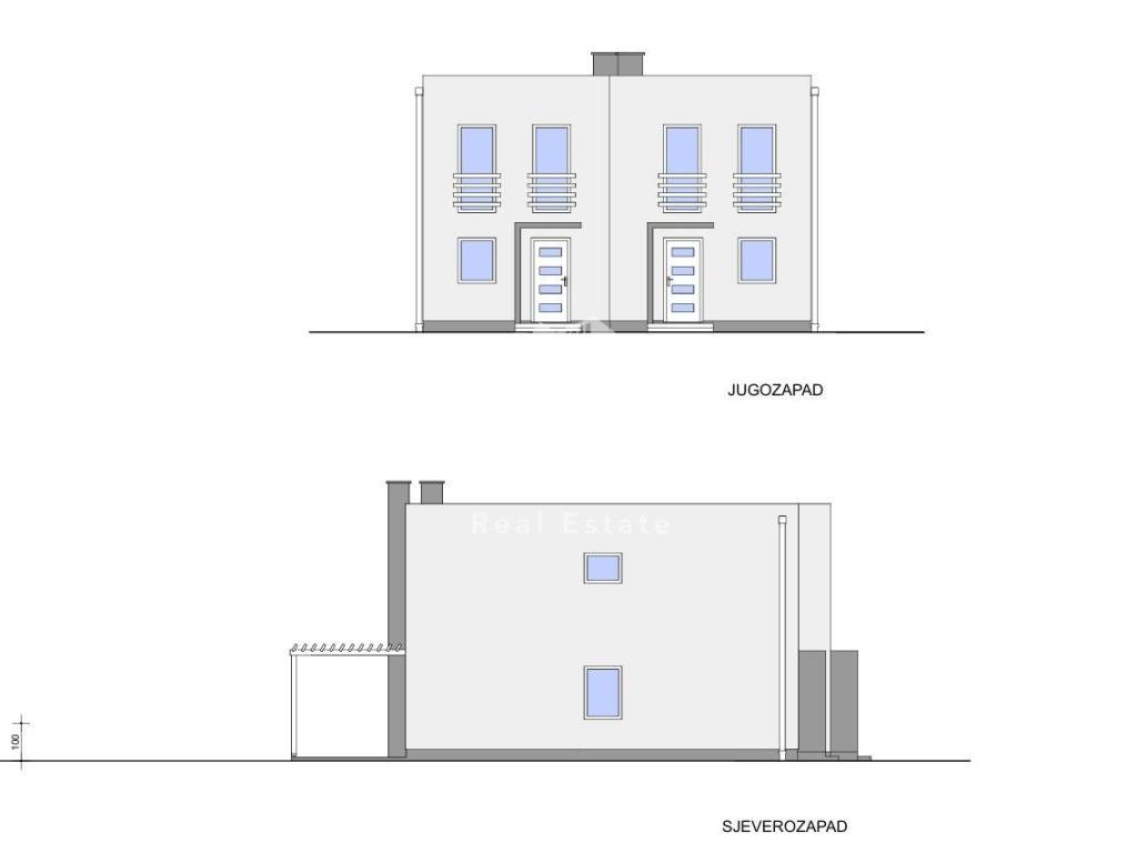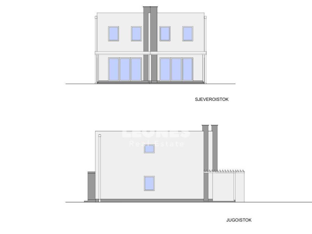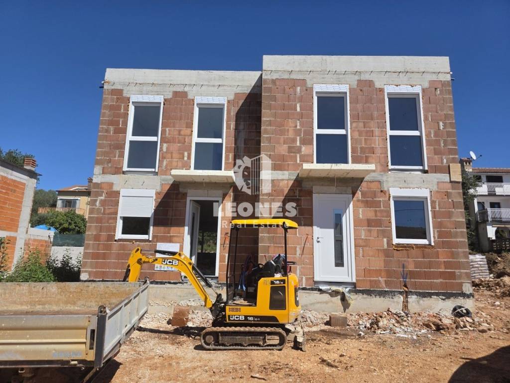 A modern semi-detached house with pool near Umag is for sale. The net usable area of the house is 90 m2, while the garden area is about 150 m2. On the ground floor there is a toilet, a kitchen with a dining area and a living room with access to a covered terrace of 15 m2. On the first floor there are 3 bedrooms and a bathroom.
