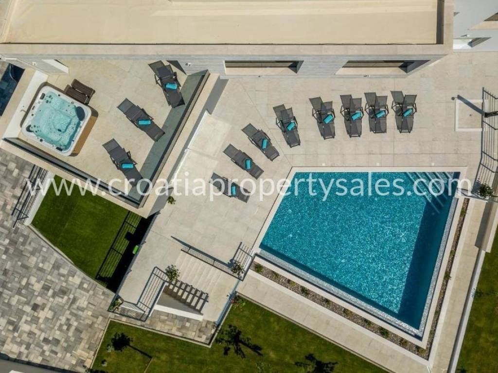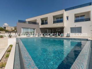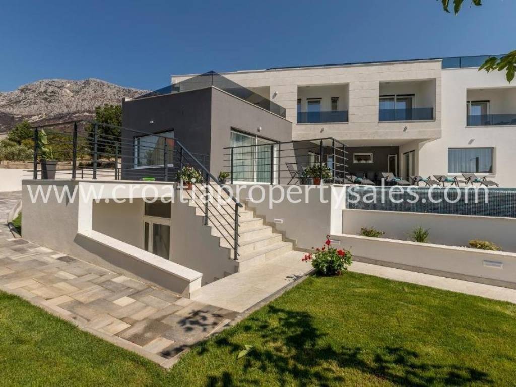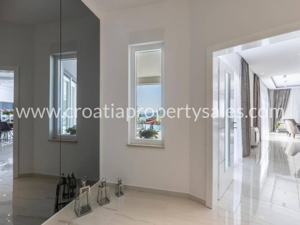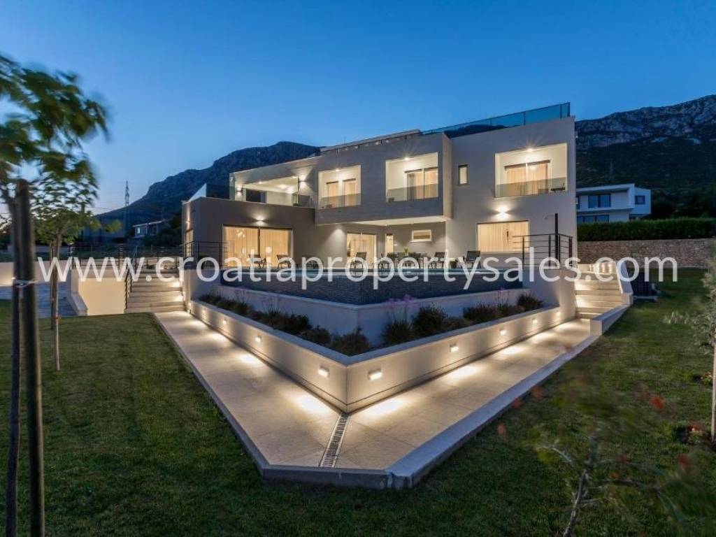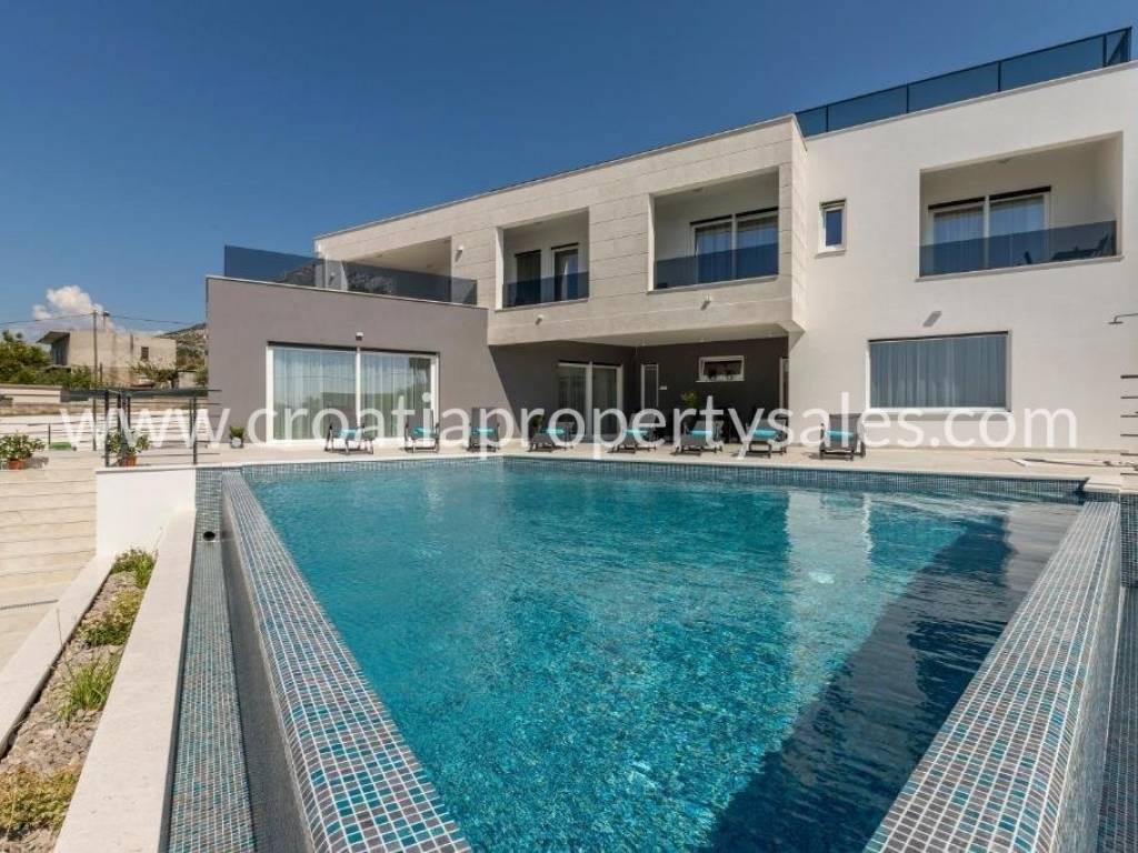 Luxury villa with pool and sea view in a beautiful location near Split. The villa has a total of 350 m2 and has 4 floors.It is located on a plot of 1700 m2. There is a storage room in the basement. On the ground floor there is a spacious living room, kitchen with dining room which has access to a spacious courtyard with pool, sundeck, barbecue and dining area and a garden with Mediterranean plants. On the first floor there are 4 luxurious bedrooms each with its own bathroom and balcony. On the first floor there is also a terrace with jacuzzi and beautiful sea view, gaming room, gym and sauna. On the second floor there is a bedroom with bathroom and large terrace (120 m) with beautiful sea view and all four sides of the world. The villa is south-oriented, bright and sunny. It is possible to park four cars. All essential facilities are nearby, yet it has a quiet environment and privacy.